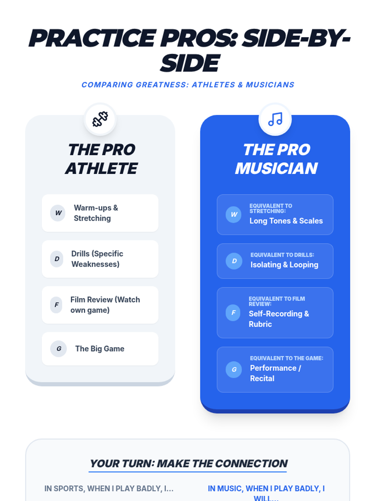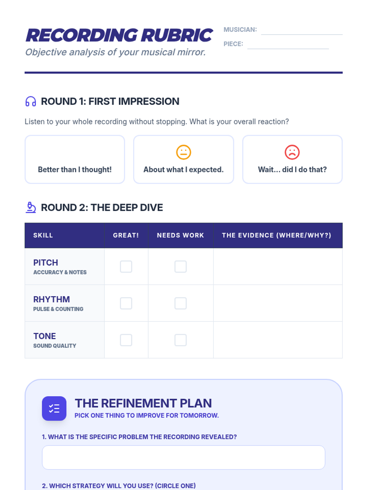 This sequence empowers 5th-grade musicians to become independent learners by mastering critical listening, error detection, and strategic practice techniques. Students transition from identifying performance mistakes in others to self-diagnosing and creating personalized practice blueprints for technical growth.