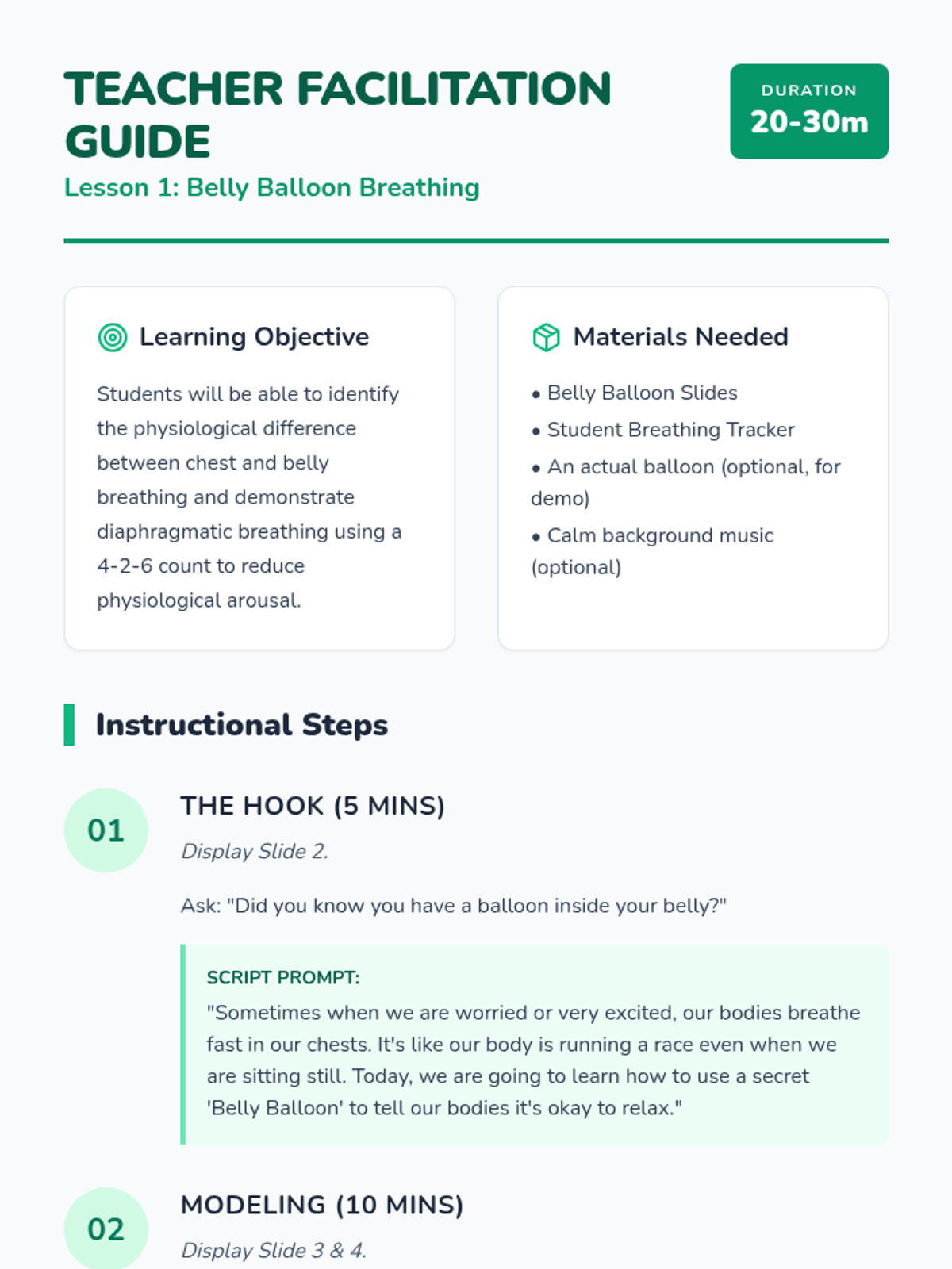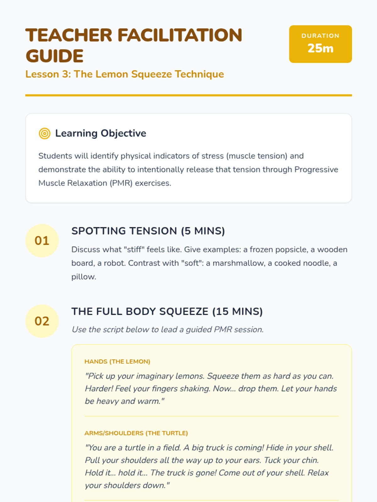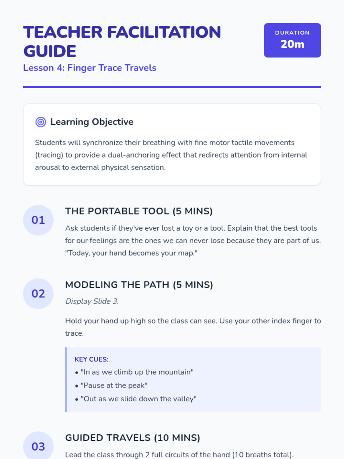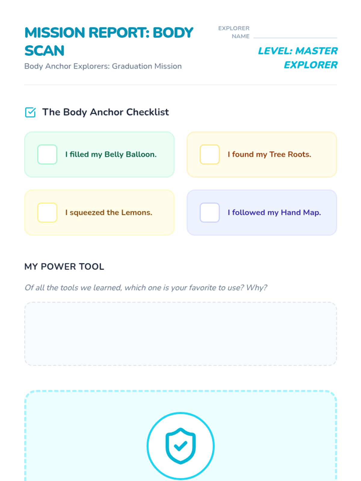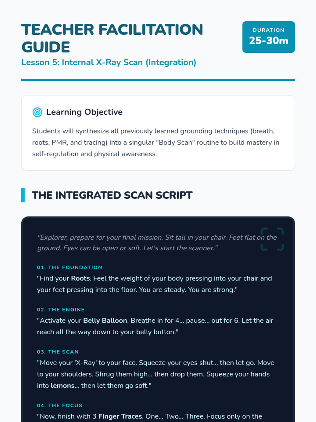 This sequence teaches 3rd-grade students physical grounding techniques to manage physiological arousal. Students explore breathwork, muscle relaxation, and posture through the 'Body Explorers' theme, learning to use their bodies as anchors for emotional stability.