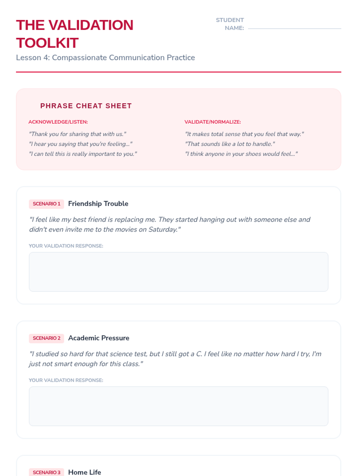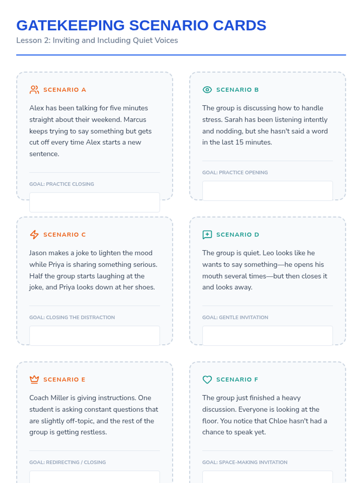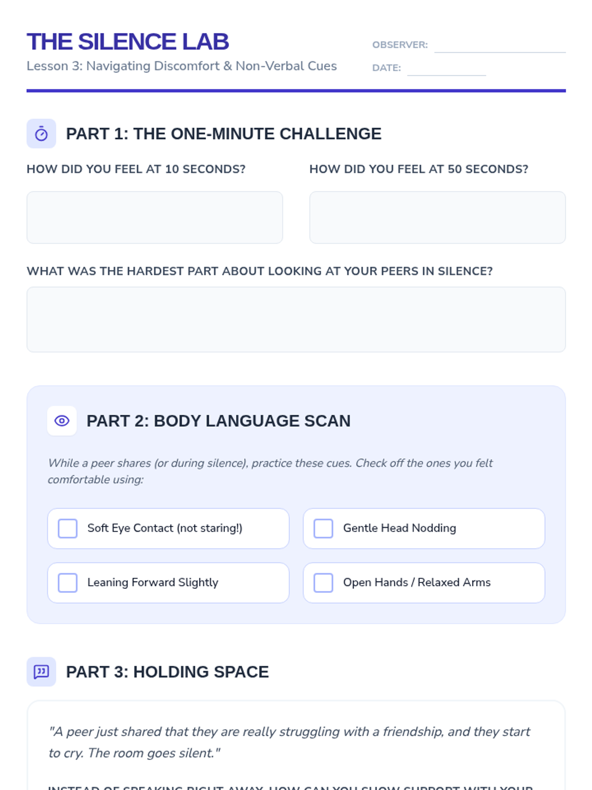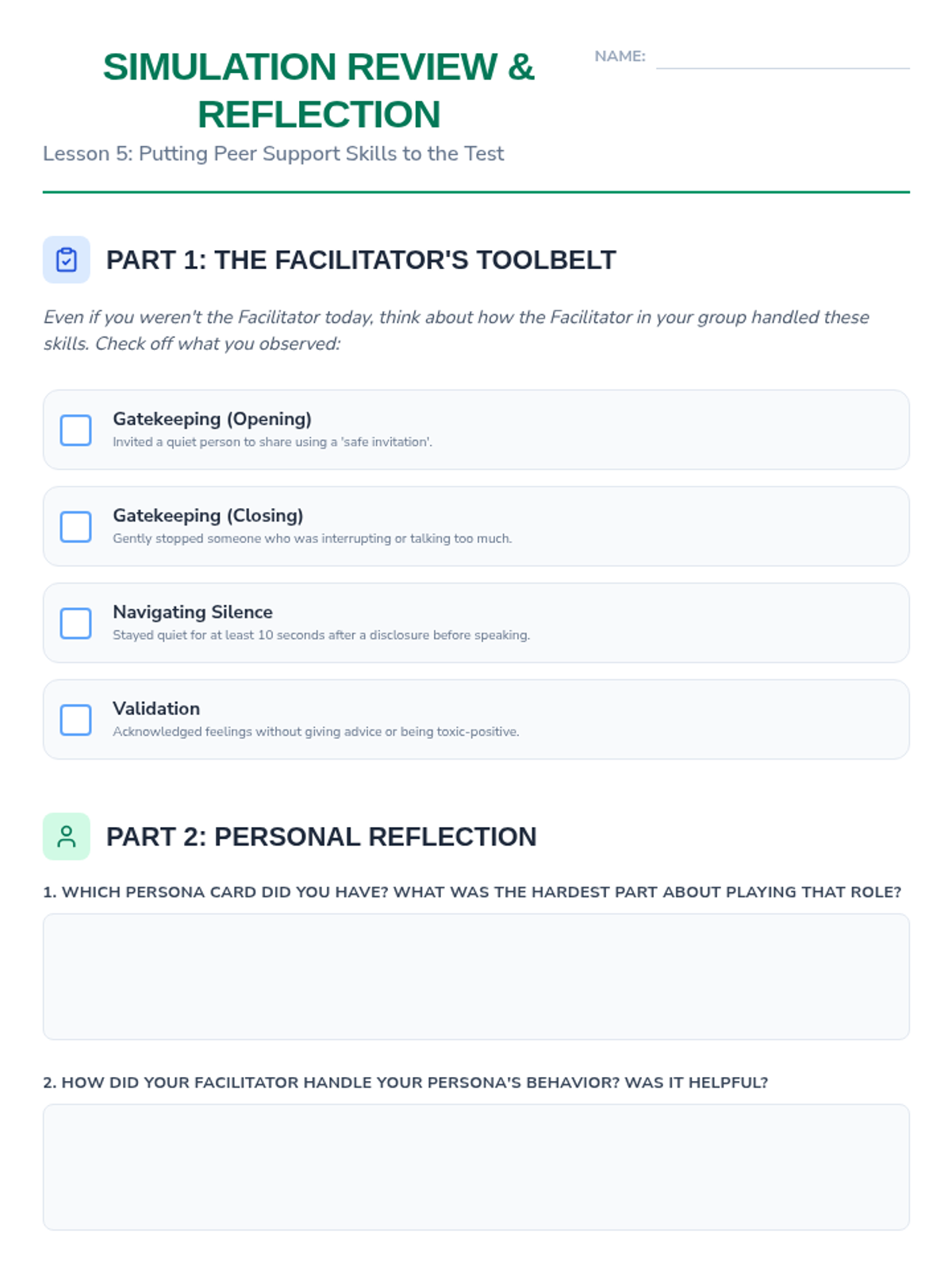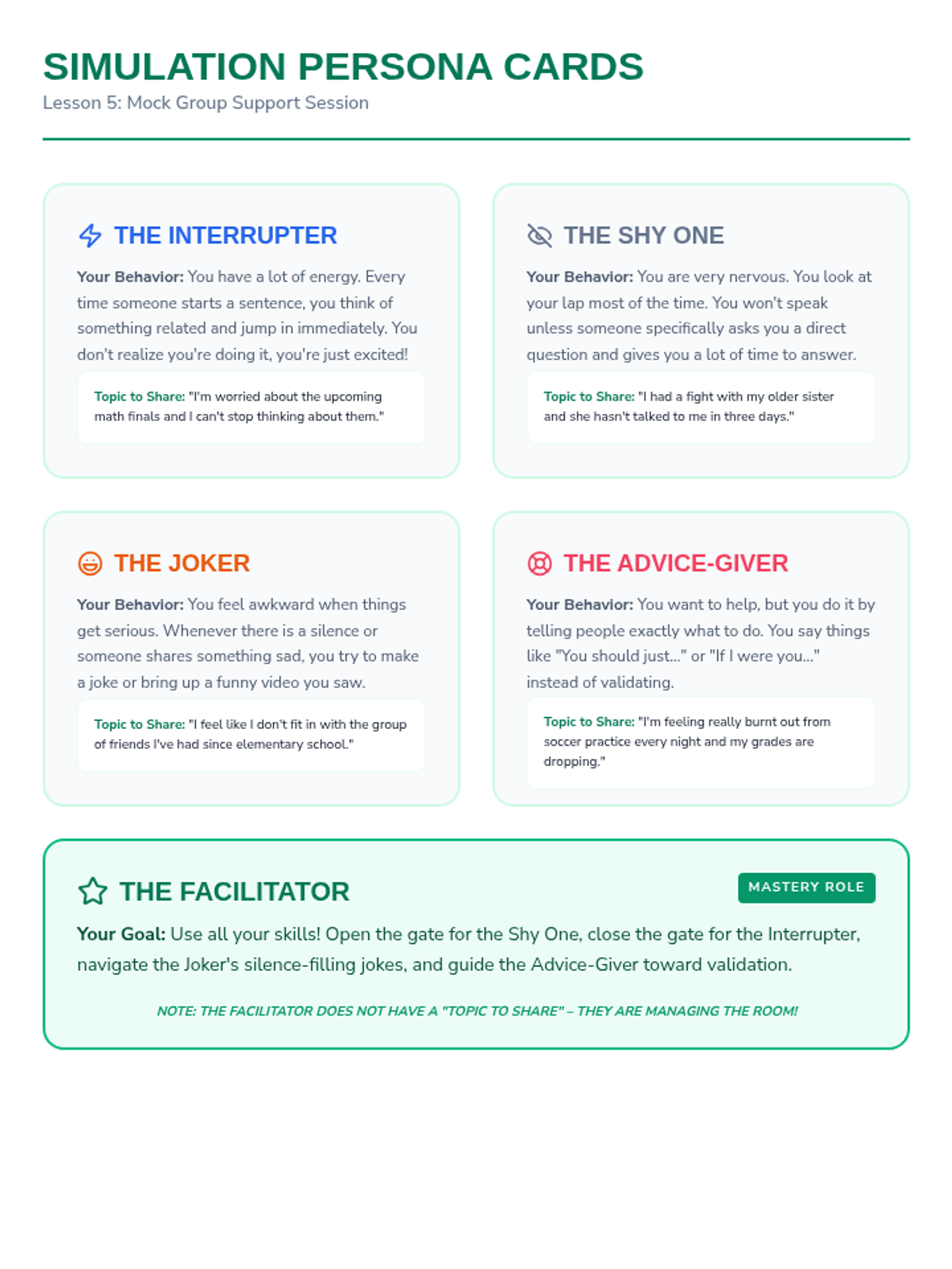 A 5-lesson unit for 7th-grade students focused on developing the skills necessary for effective and inclusive peer support groups. Students progress from identifying group roles to facilitating a mock support session, learning to handle silence and difficult disclosures with empathy.