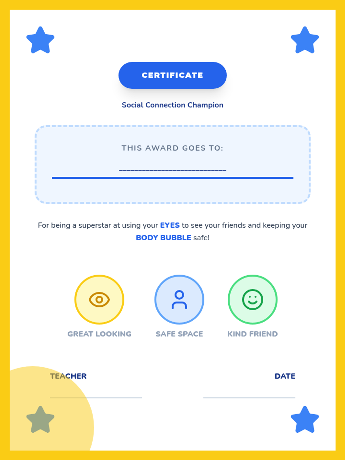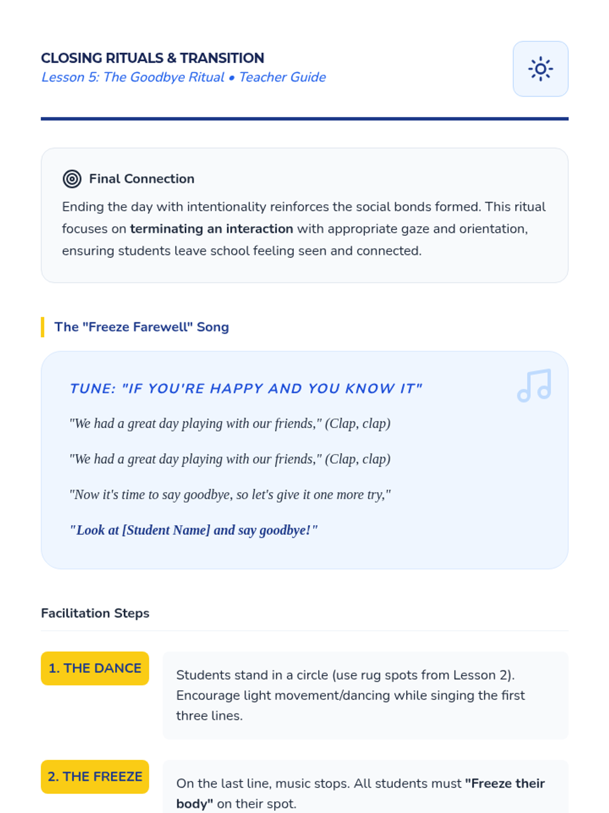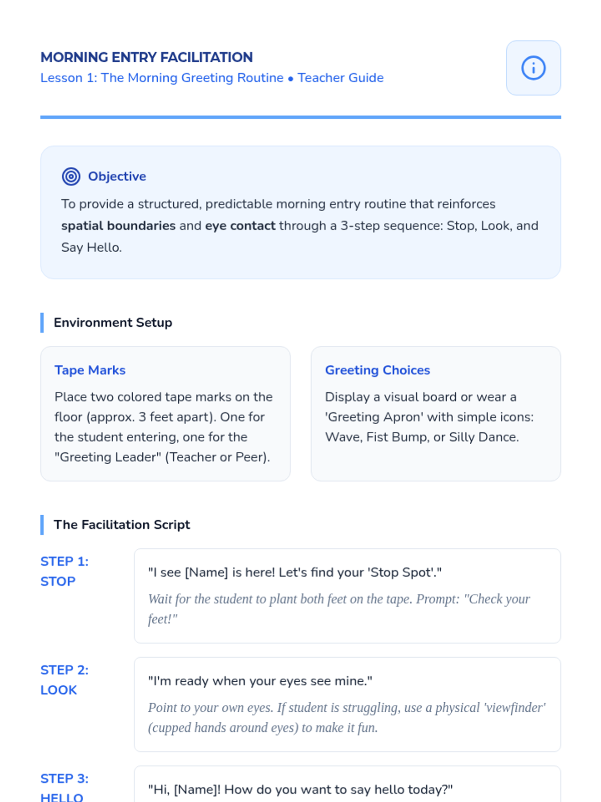 A 5-lesson sequence for Pre-K students focusing on eye contact and personal space through daily school routines like greetings, circle time, and play. students learn to navigate social spaces and initiate interactions with appropriate physical distancing and gaze.