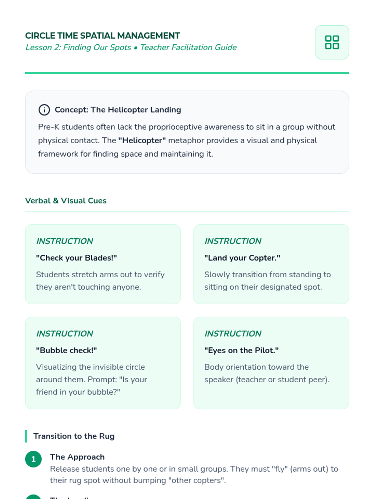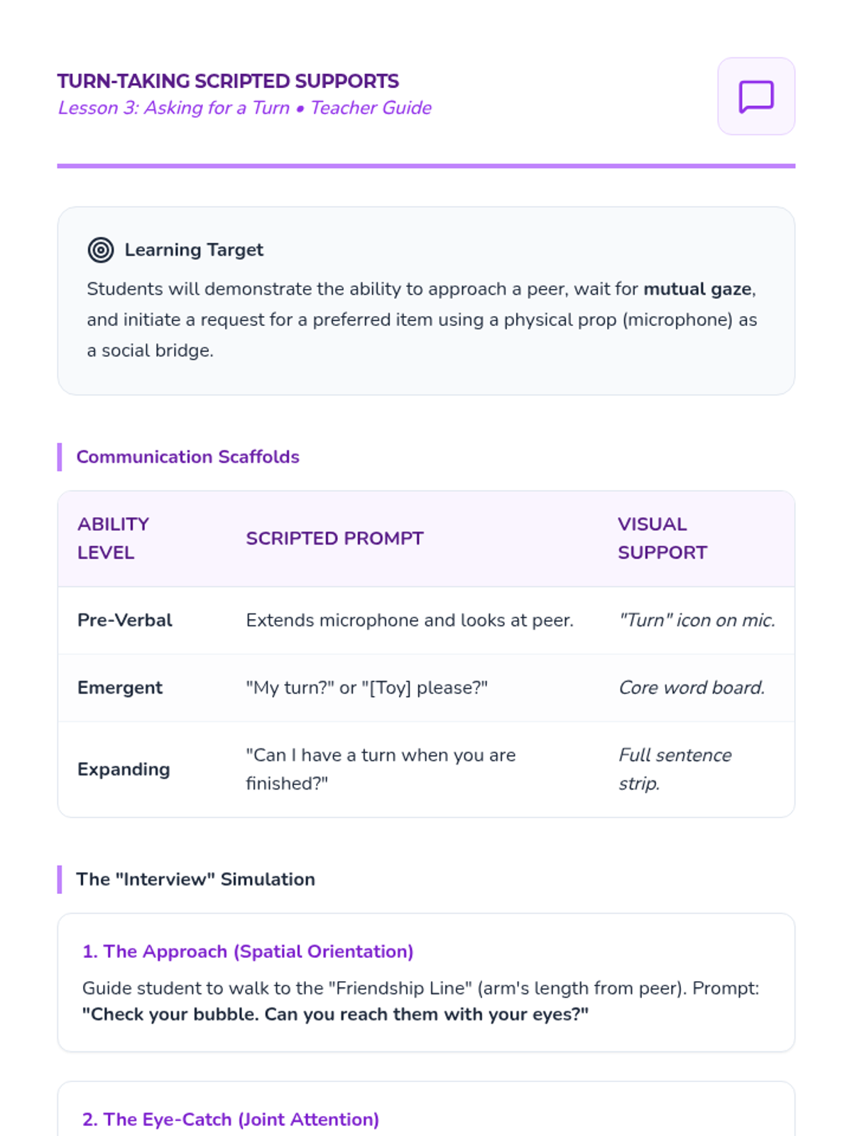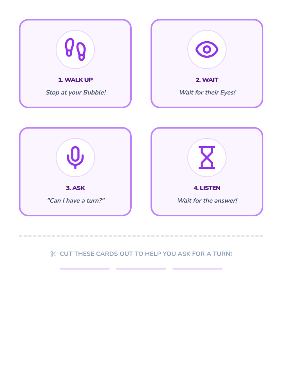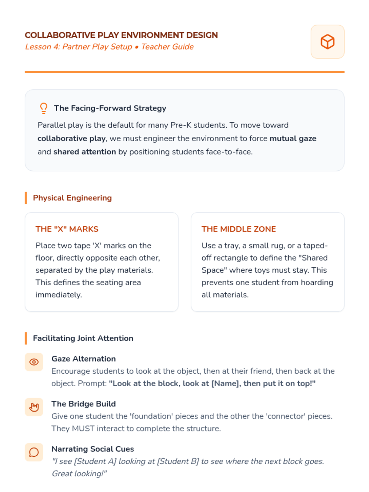 A 5-lesson sequence for Pre-K students focusing on eye contact and personal space through daily school routines like greetings, circle time, and play. students learn to navigate social spaces and initiate interactions with appropriate physical distancing and gaze.