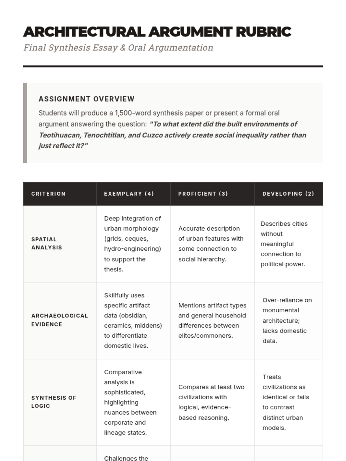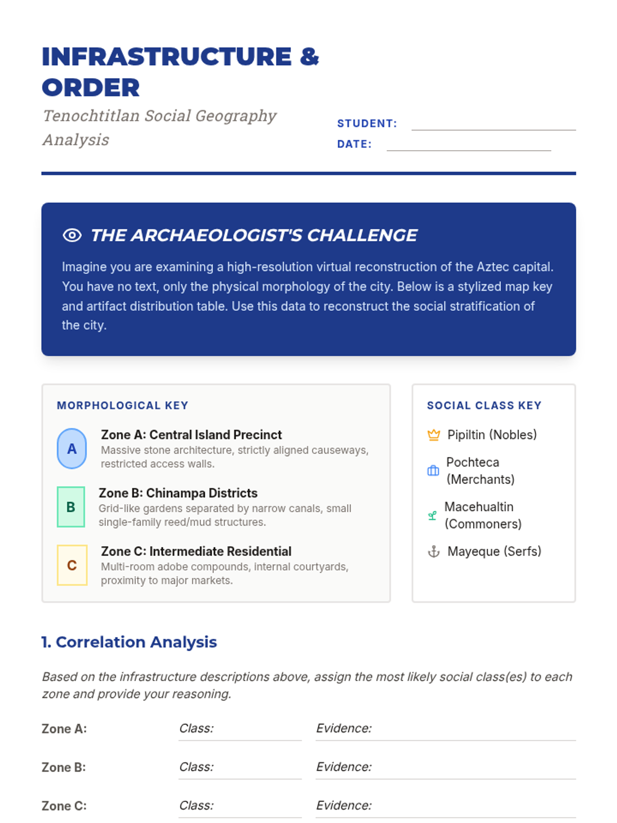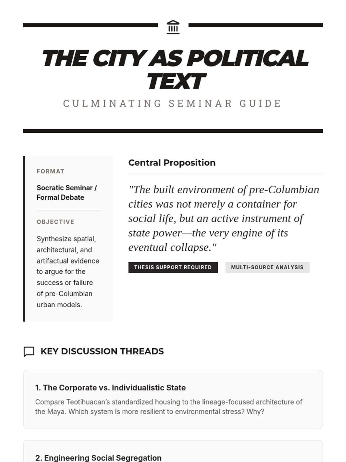 This sequence explores how urban planning in Mesoamerican and Andean civilizations (Teotihuacan, Tikal, Tenochtitlan, and Cuzco) functioned as a tool for social stratification and political control. Students will analyze archeological data to understand the relationship between built environments and state ideology.