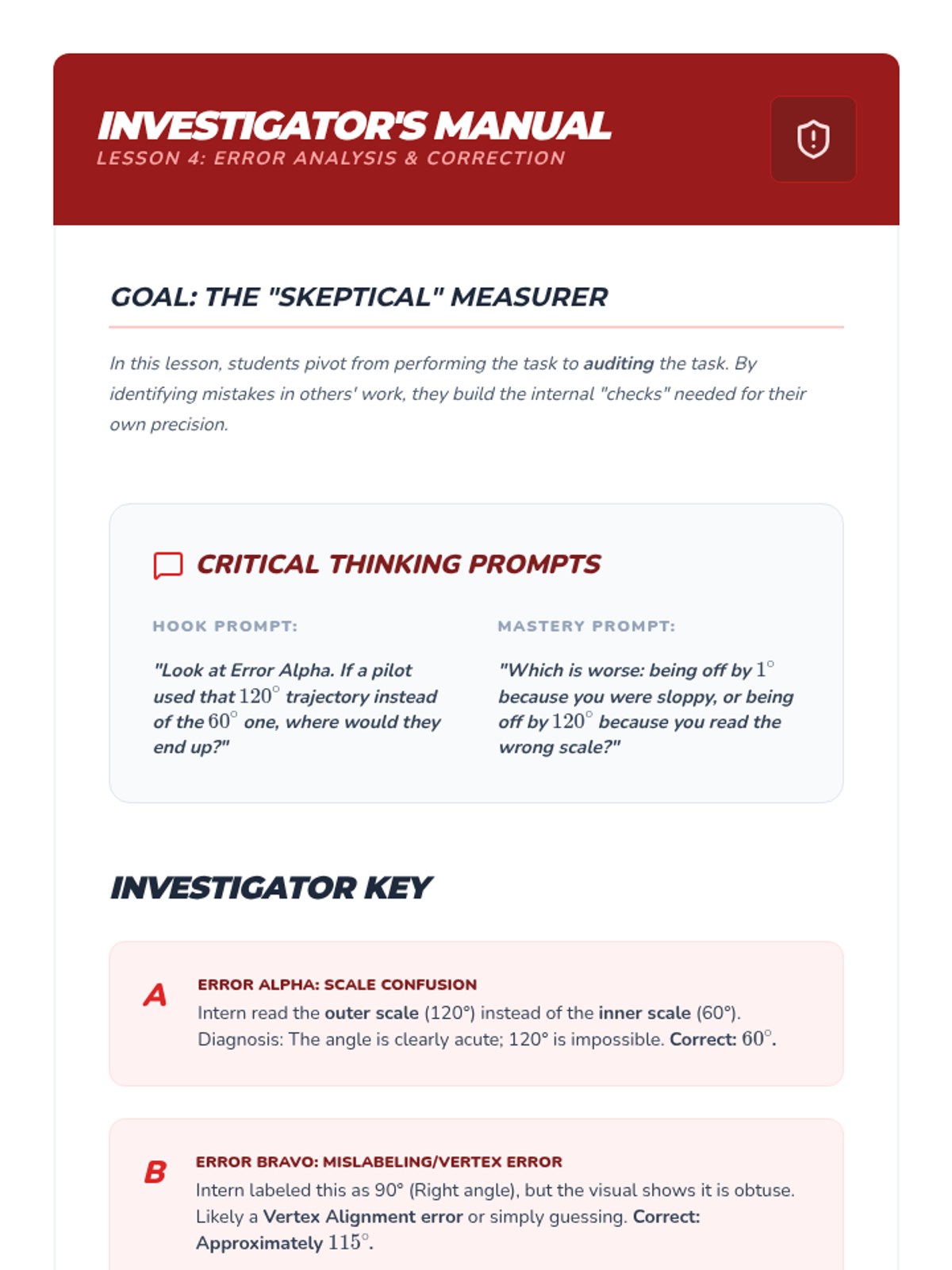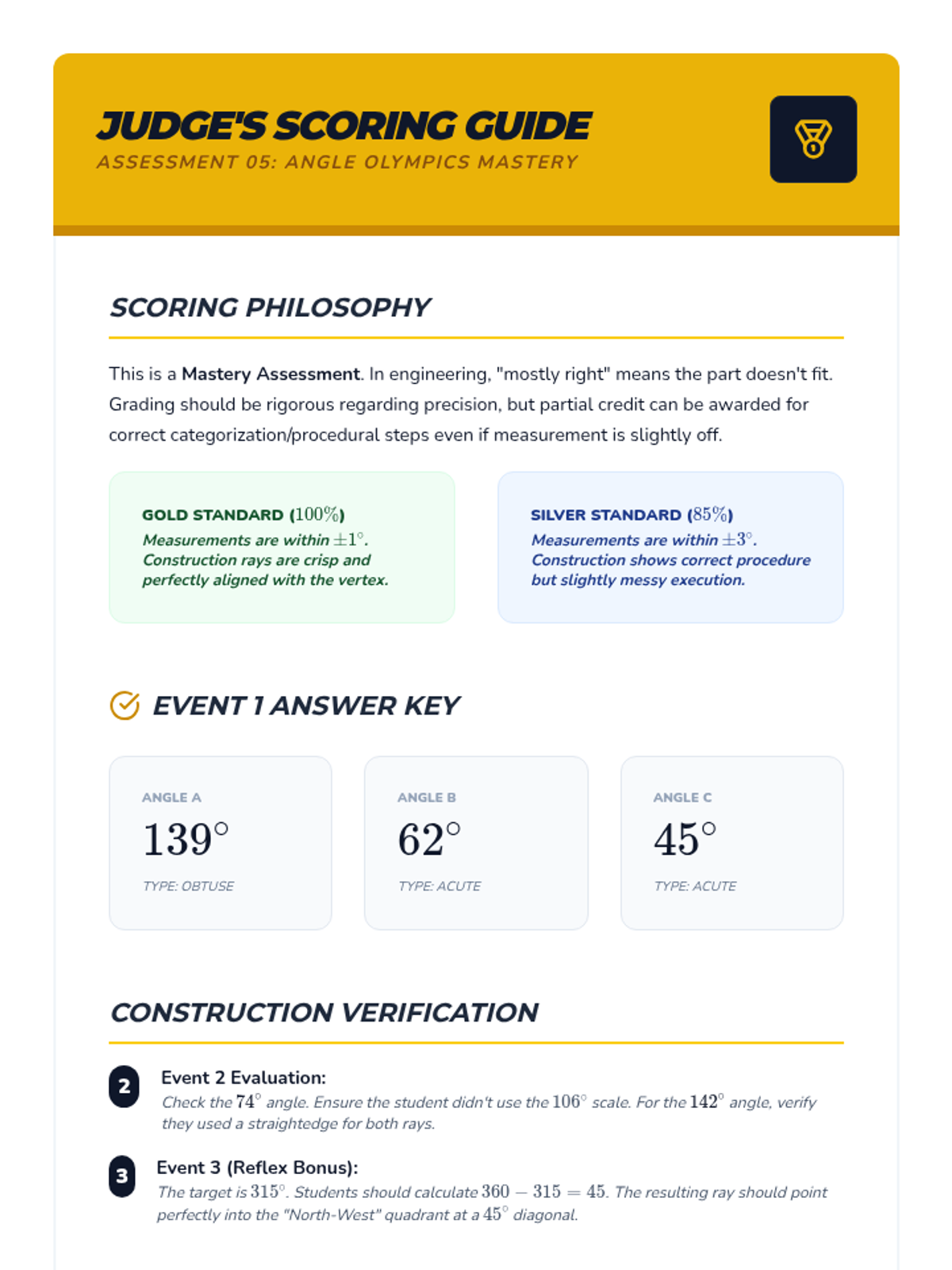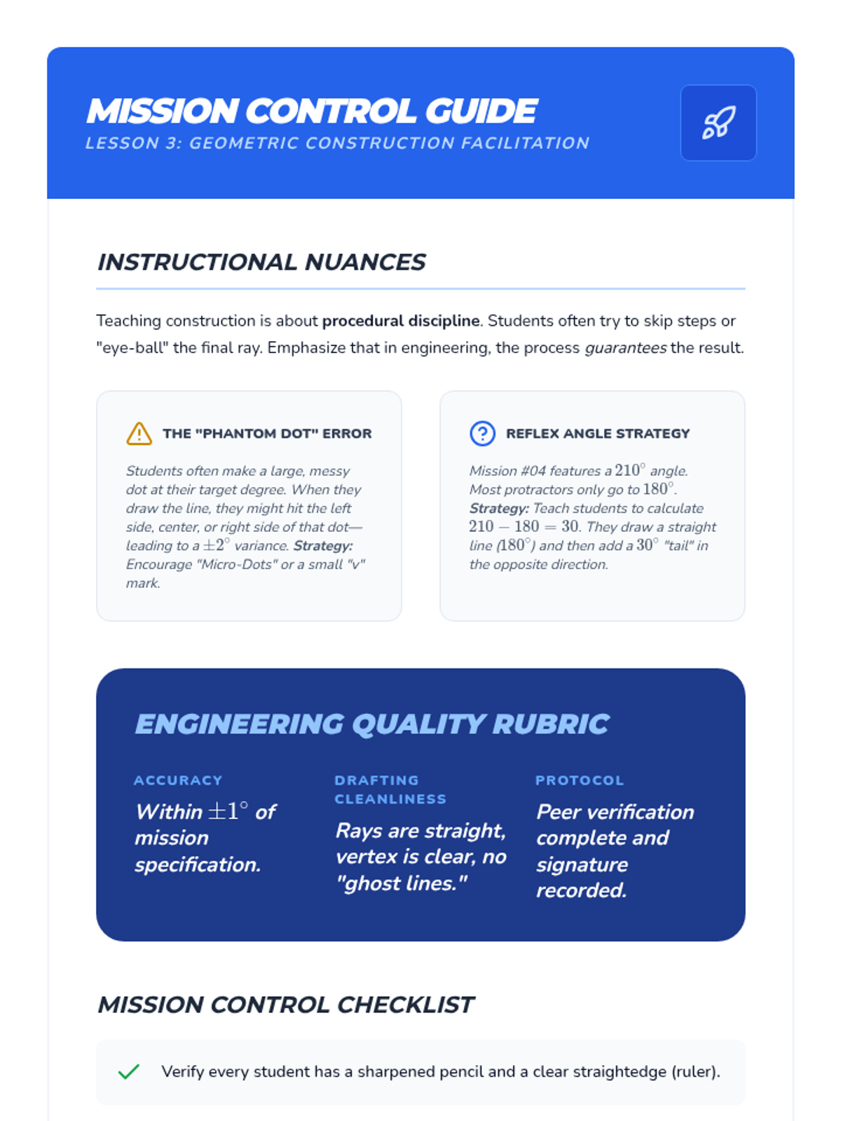This sequence focuses on the fundamental proficiency of using geometric tools to measure and construct angles with high precision. Students learn protractor mechanics, estimation techniques, construction procedures, and error analysis through an engineering and drafting lens.