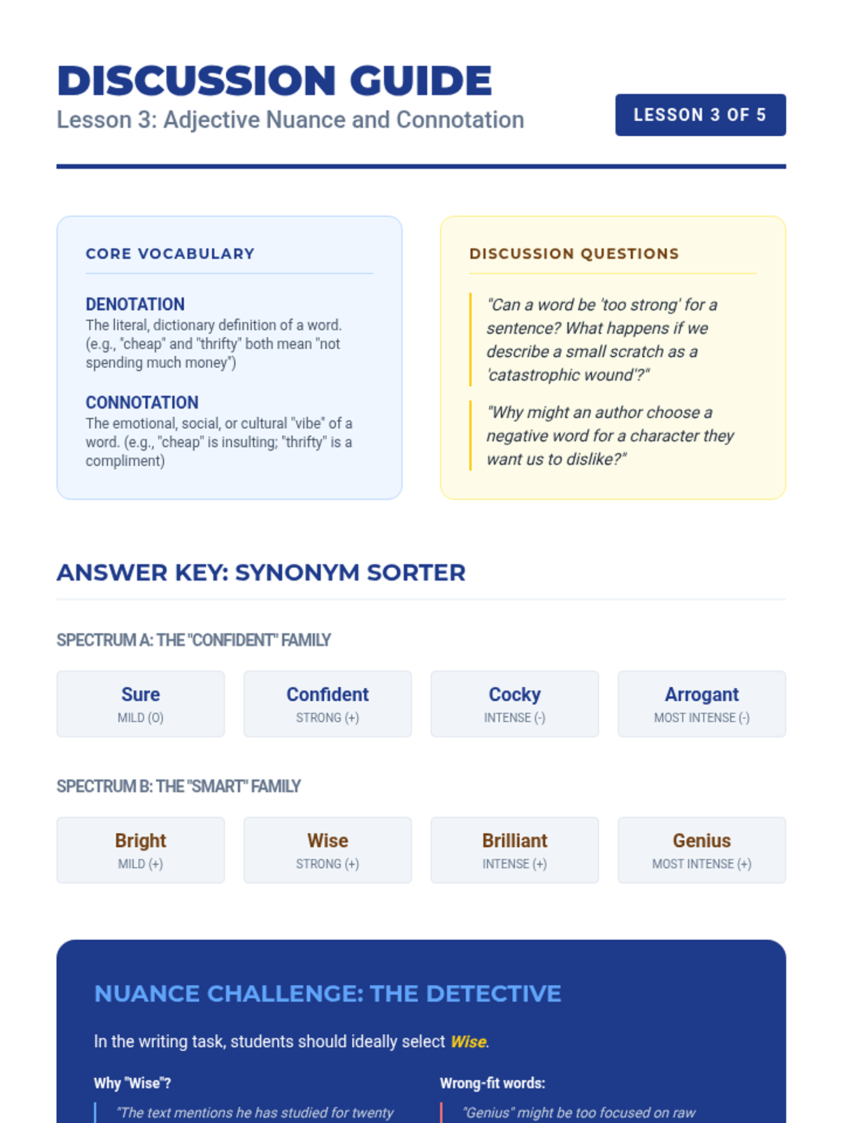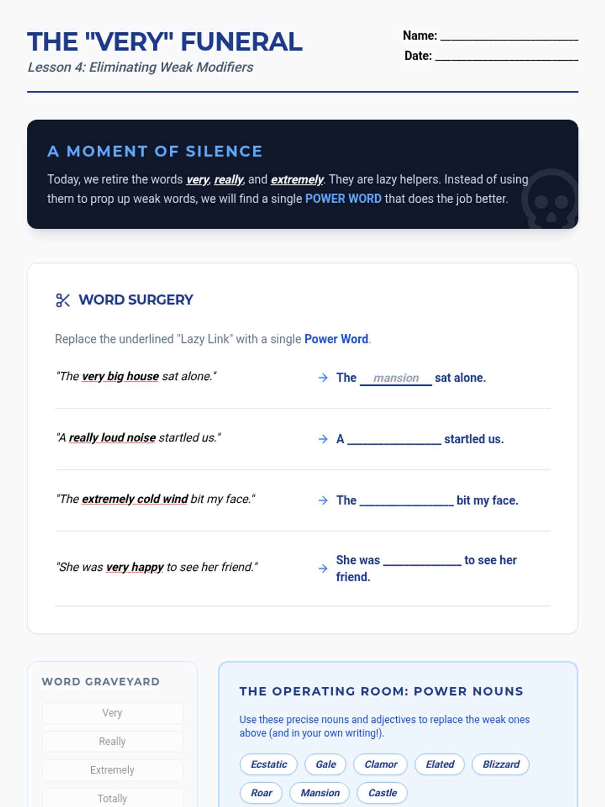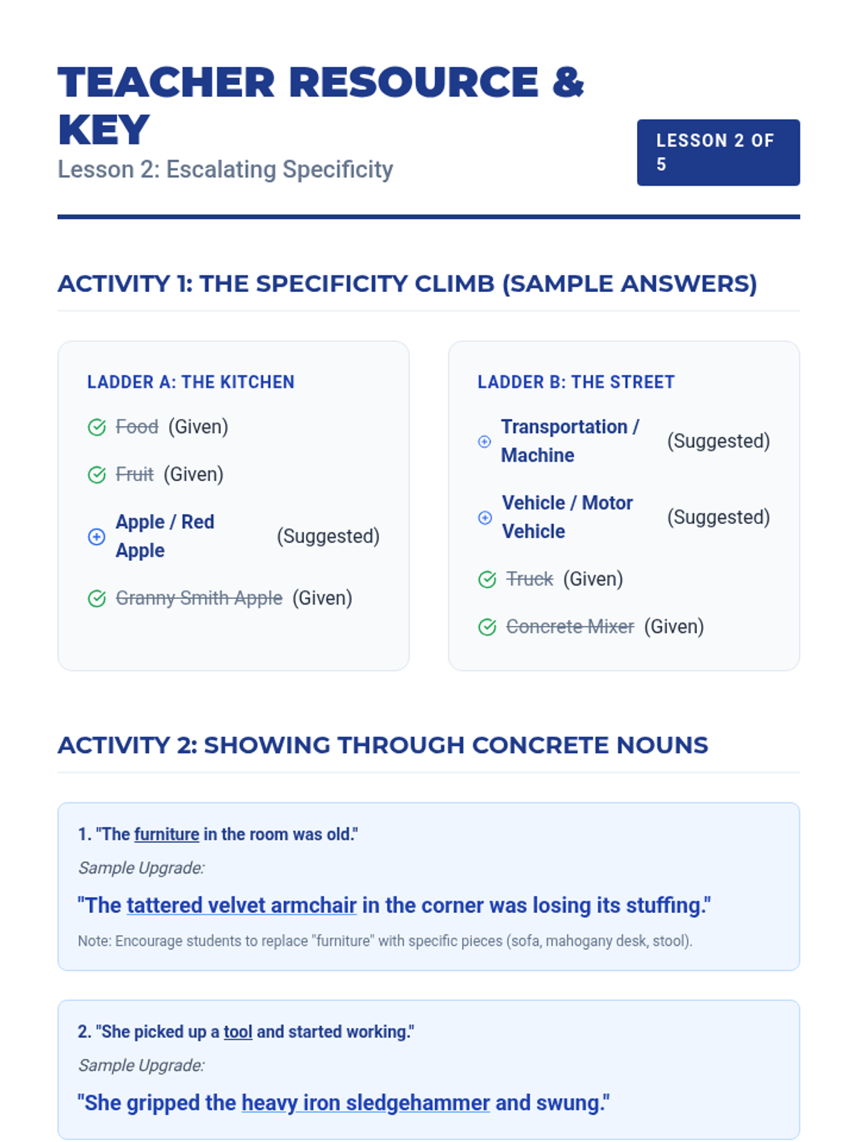 A 6th-grade ELA writing workshop sequence focused on vocabulary precision. Students learn to upgrade their descriptive writing by replacing vague generalities with concrete nouns and nuanced adjectives, culminating in a polished descriptive vignette.