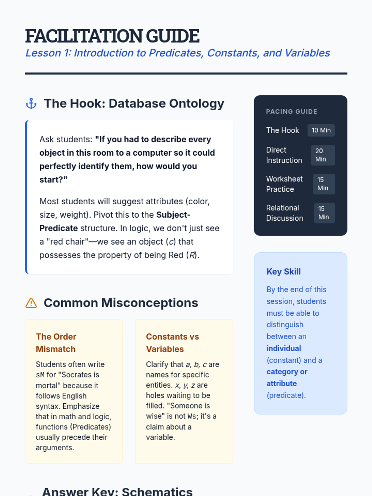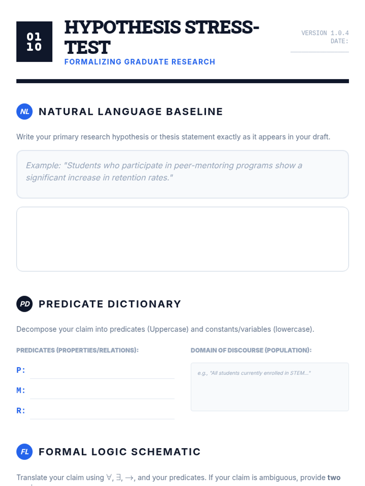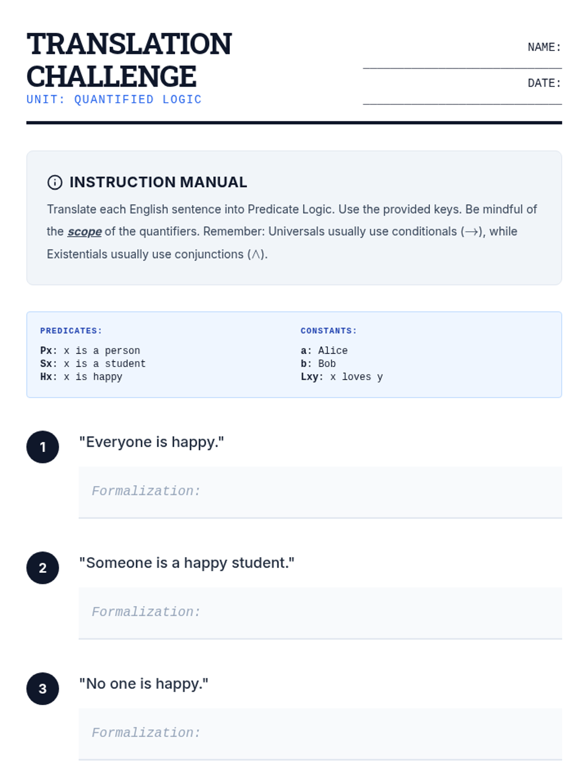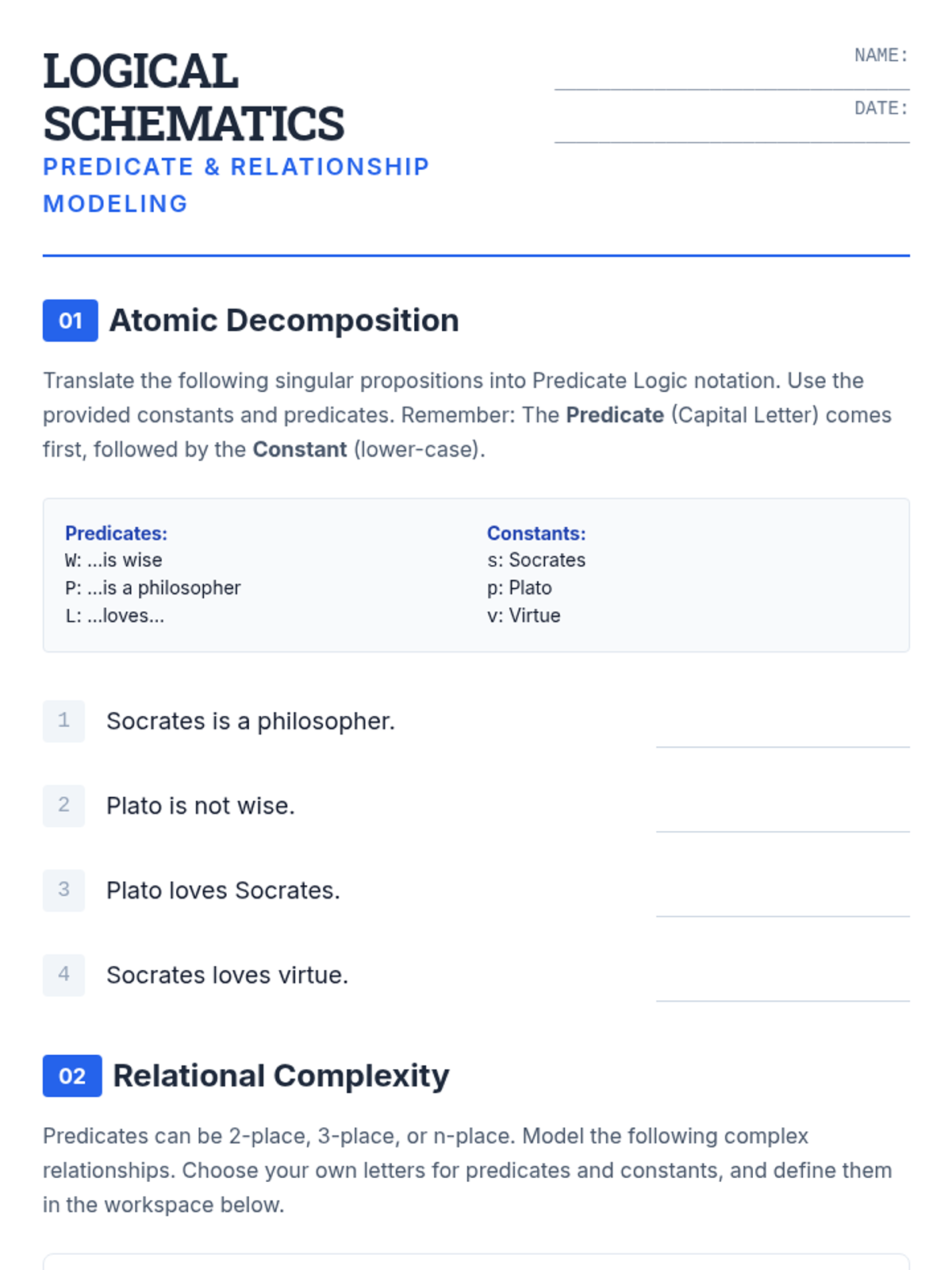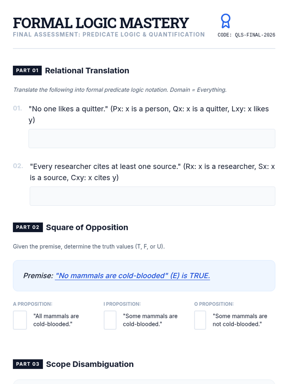A comprehensive graduate-level sequence on Predicate Logic, exploring the internal structure of sentences, quantification (All, Some, None), and relational logic to improve research precision and rhetorical analysis.