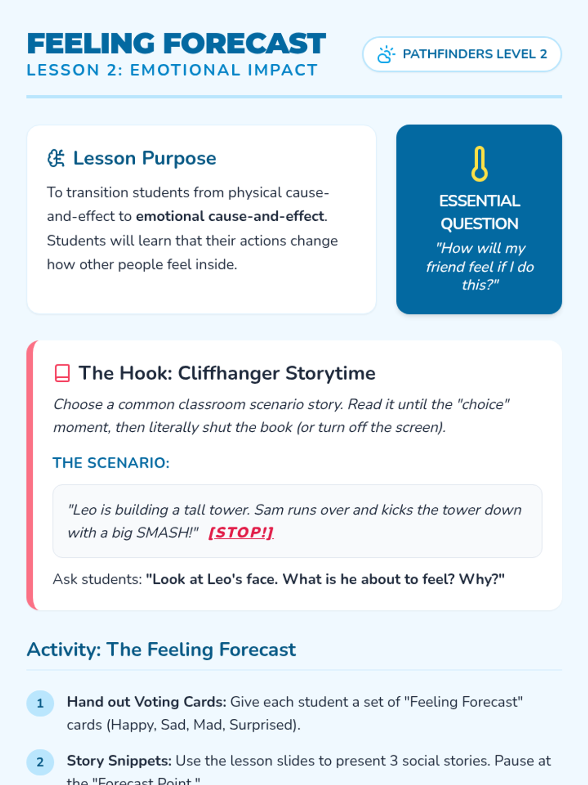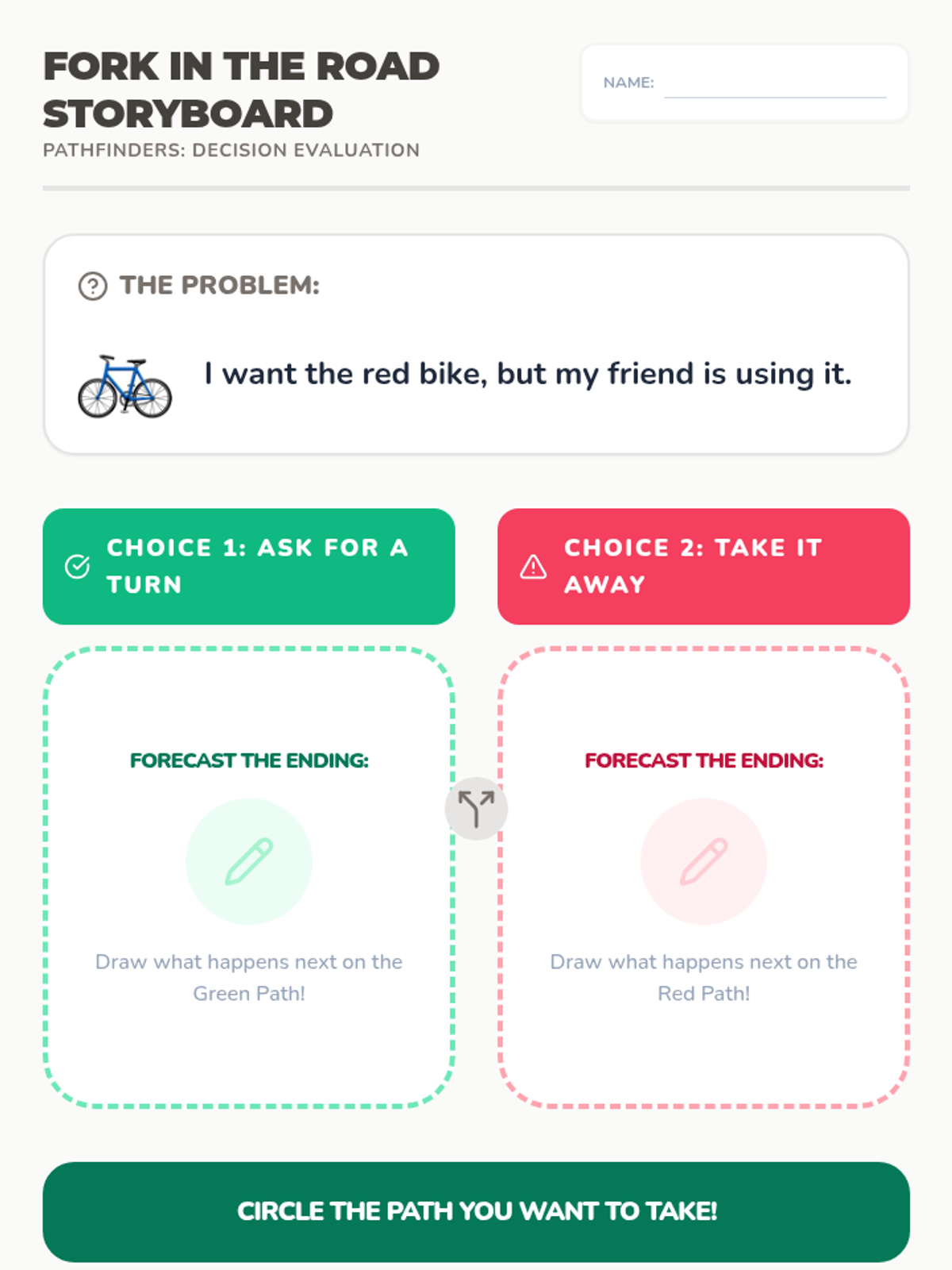 A Kindergarten sequence focused on social communication and decision evaluation. Students learn to predict the outcomes of their actions, moving from physical cause-and-effect to social conflict resolution through the 'Pathfinder' framework.