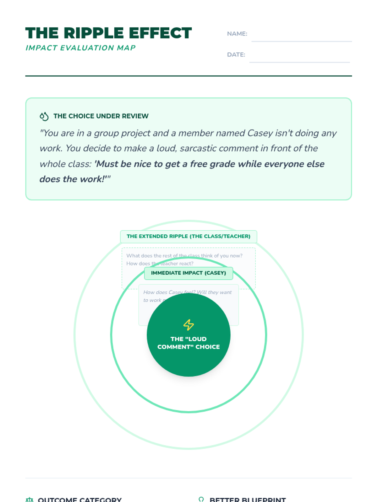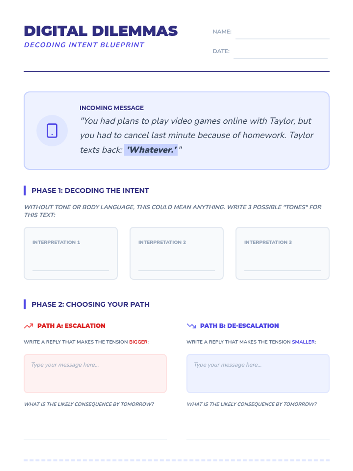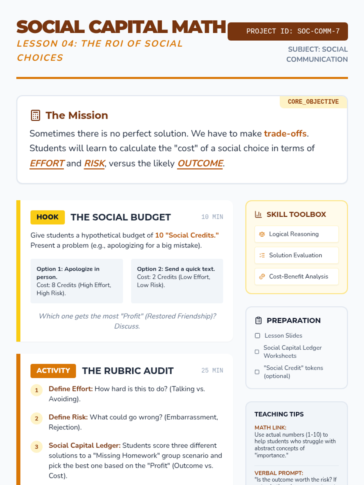 This sequence guides 7th-grade students through the process of evaluating social choices by predicting short- and long-term consequences, understanding the impact on others, and navigating digital communication. Students learn to weigh pros and cons using a 'social capital' framework to make informed, empathetic decisions in complex middle school scenarios.
