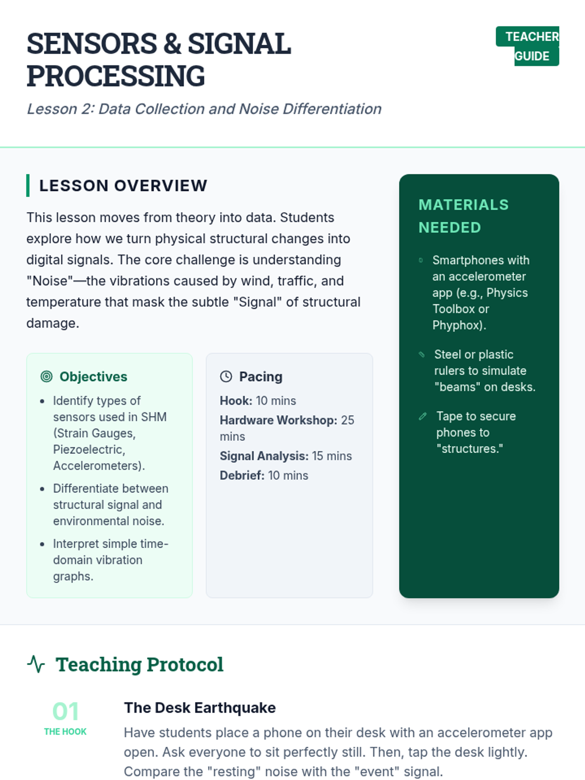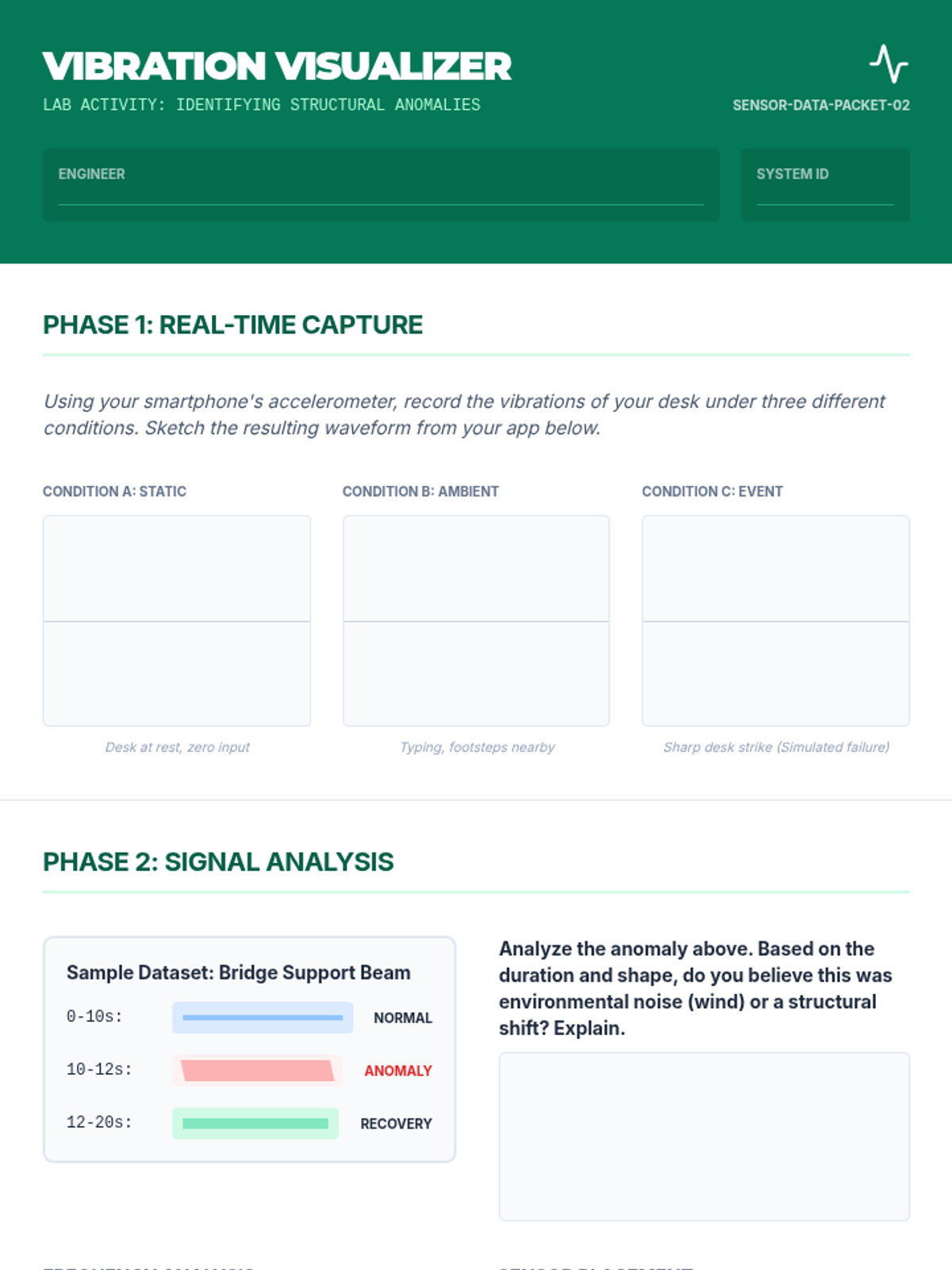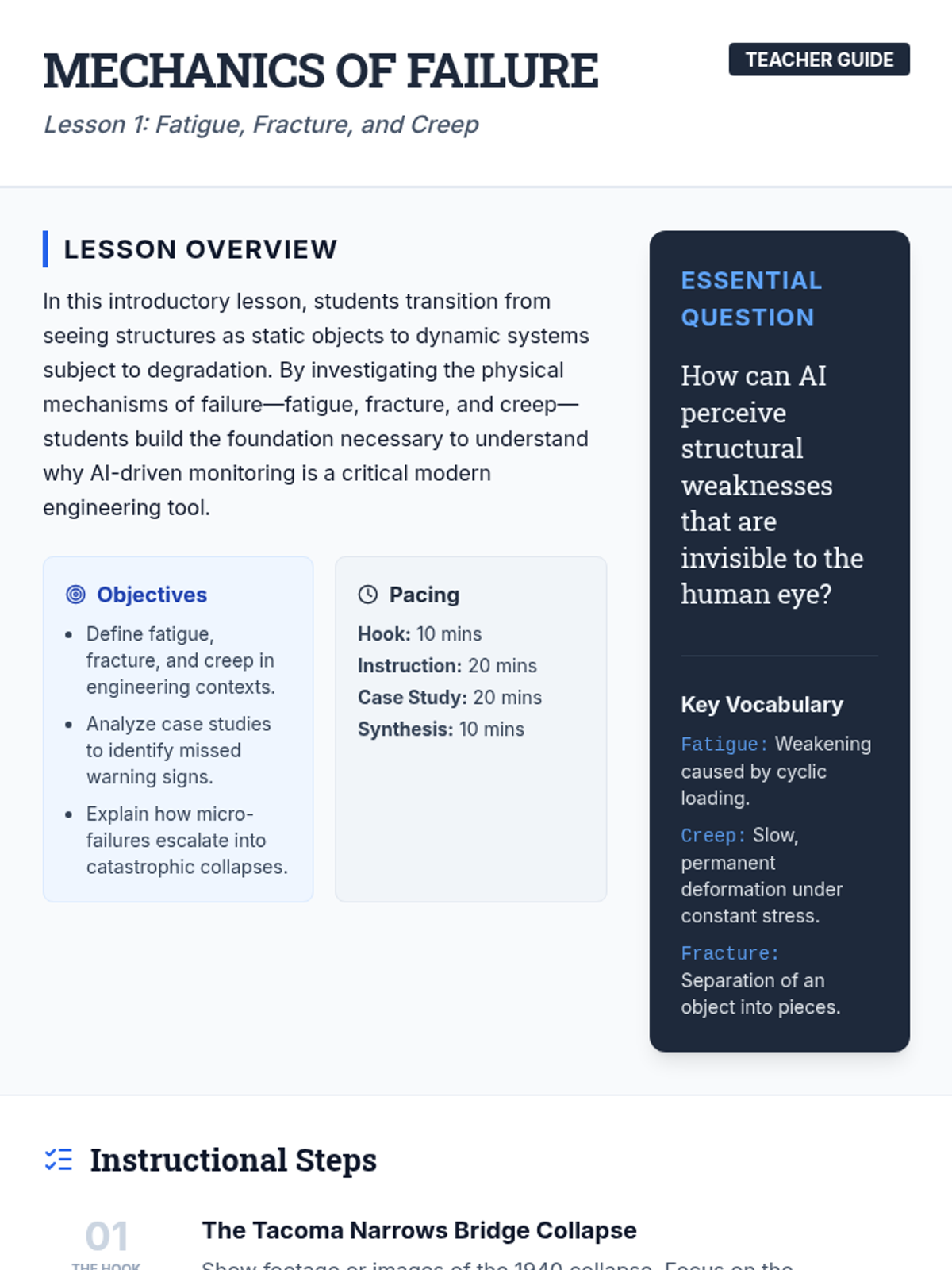 This sequence explores how AI and sensors are used for structural health monitoring (SHM). Students learn about failure modes, sensor technology, Finite Element Analysis (FEA), and anomaly detection algorithms to predict and prevent engineering disasters.