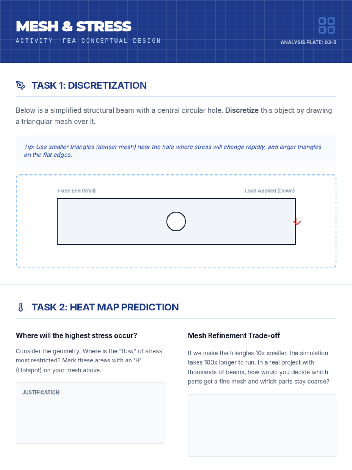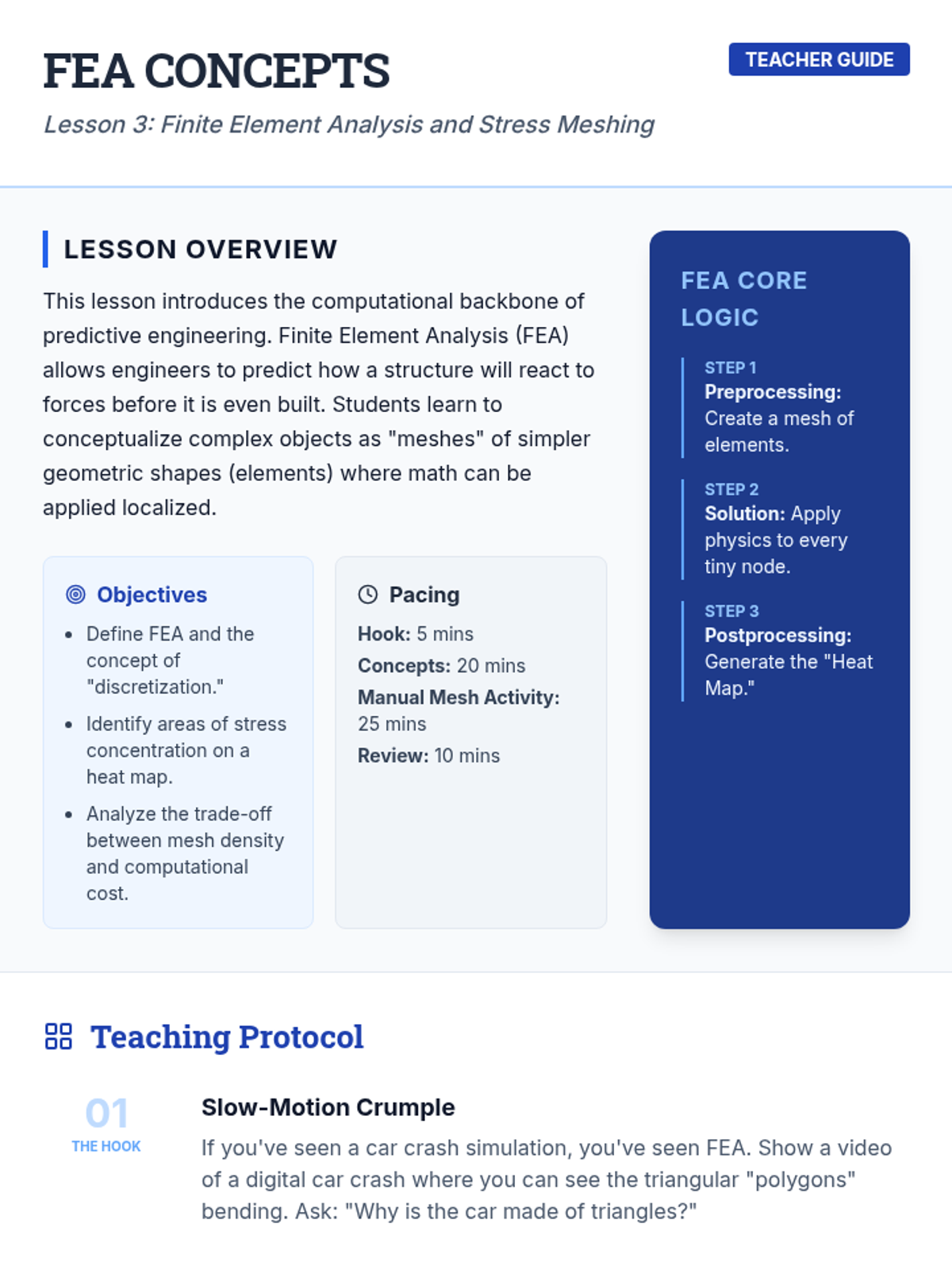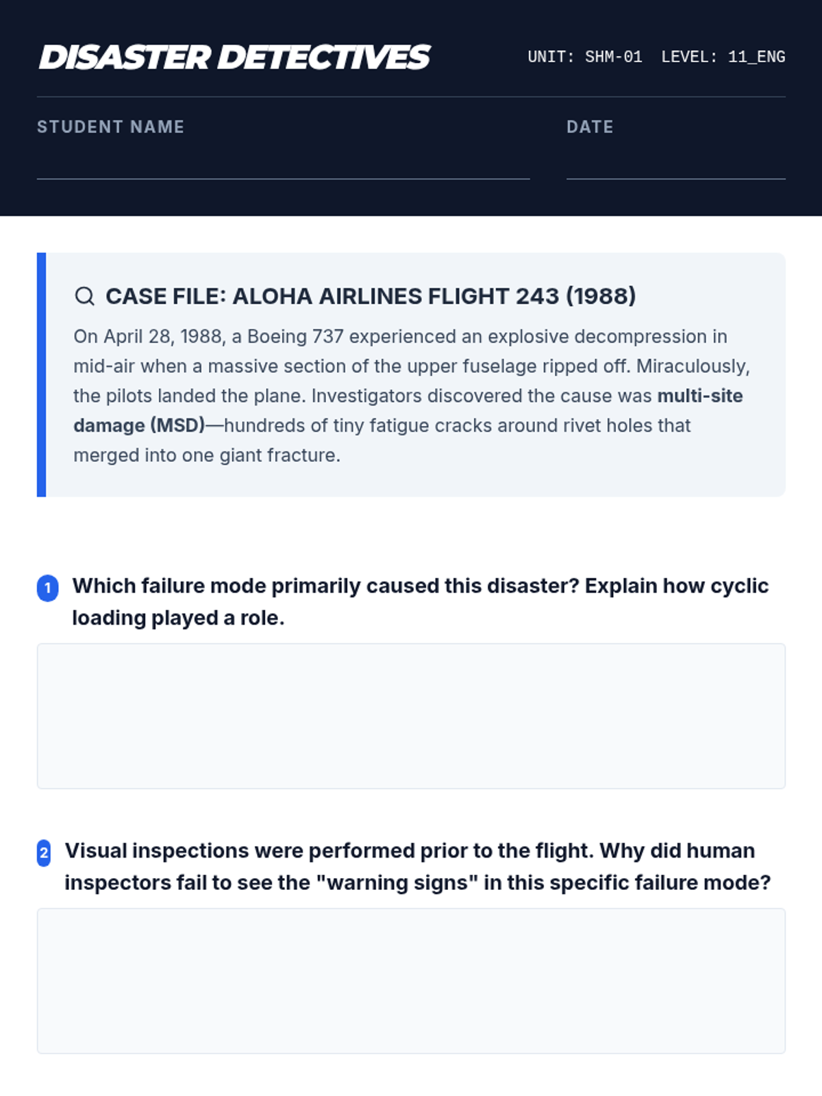 This sequence explores how AI and sensors are used for structural health monitoring (SHM). Students learn about failure modes, sensor technology, Finite Element Analysis (FEA), and anomaly detection algorithms to predict and prevent engineering disasters.