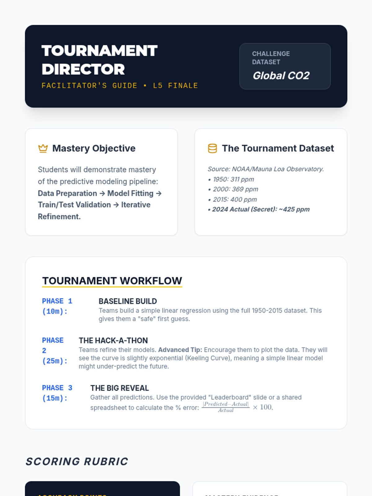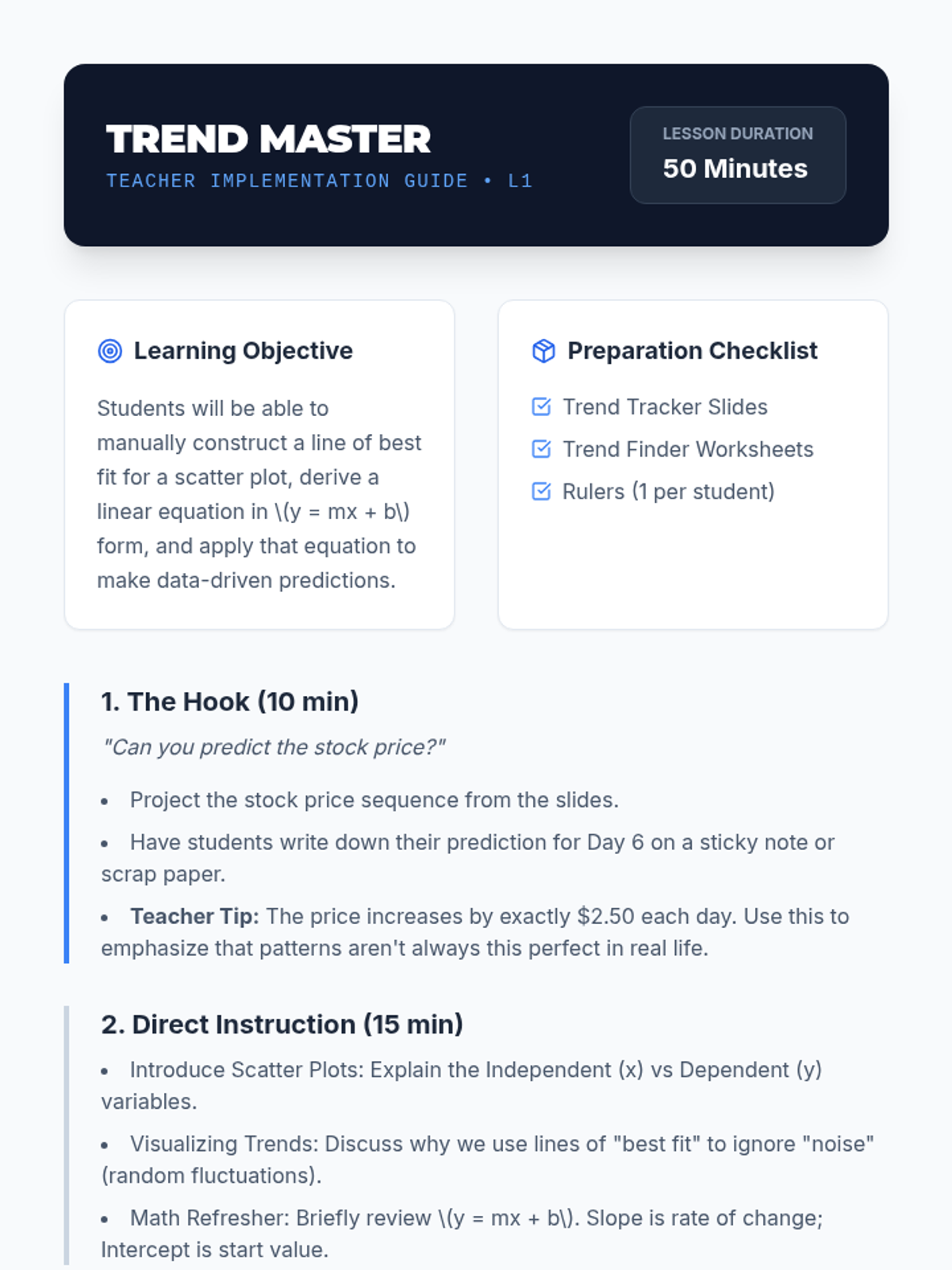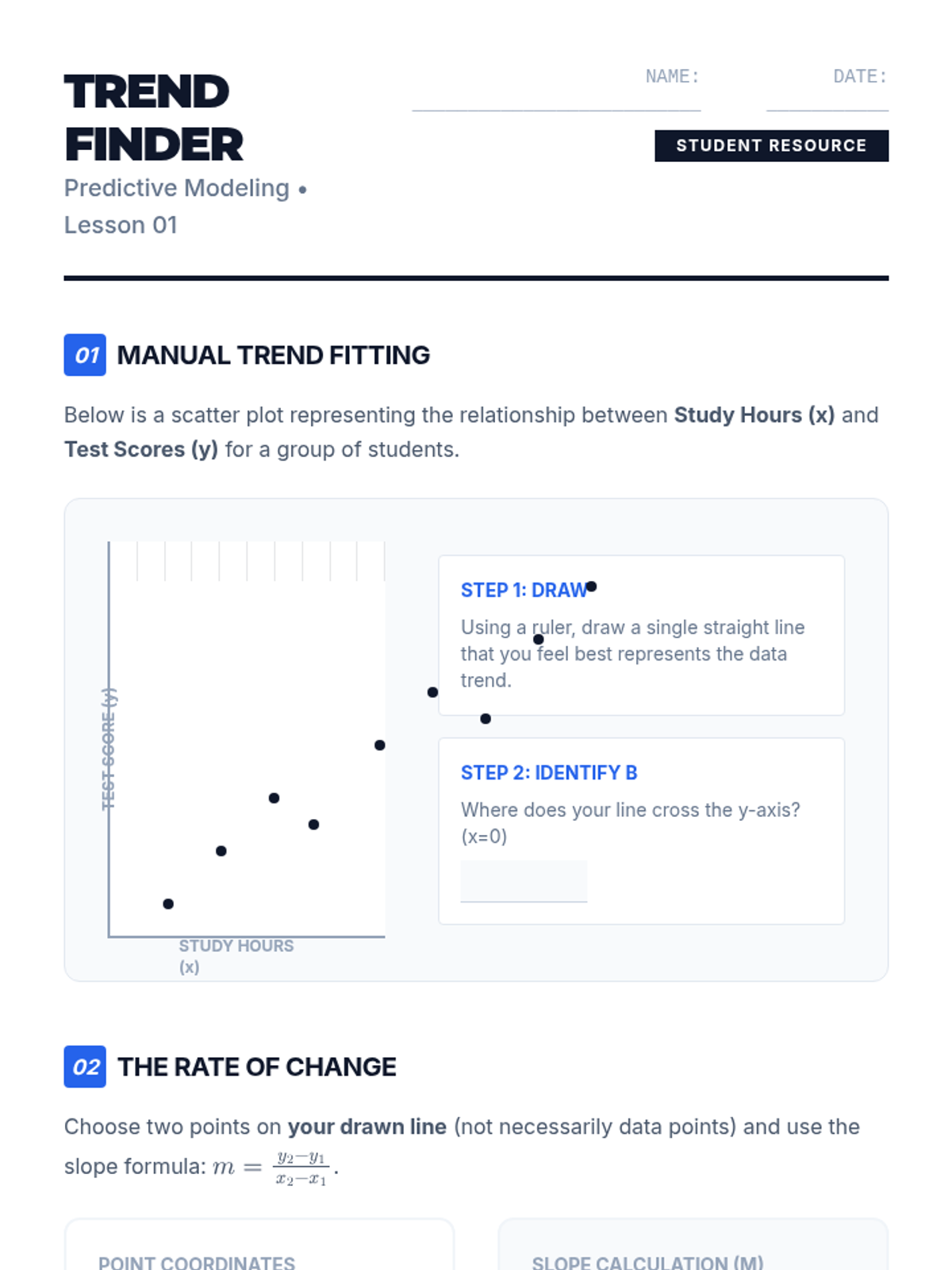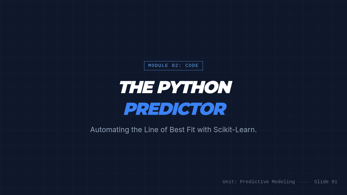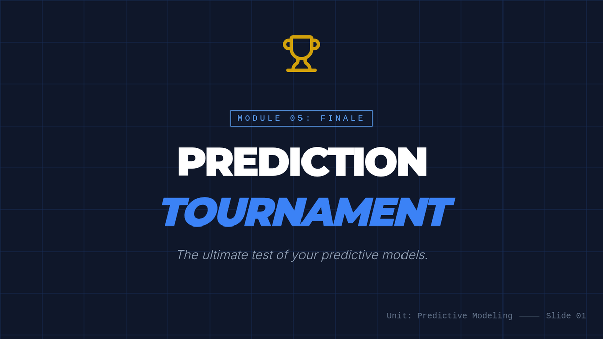 A comprehensive unit on data analysis and predictive modeling. Students learn to identify trends, implement linear regression in Python, validate models using training and testing splits, and explore categorical classification through real-world case studies and a gamified tournament.