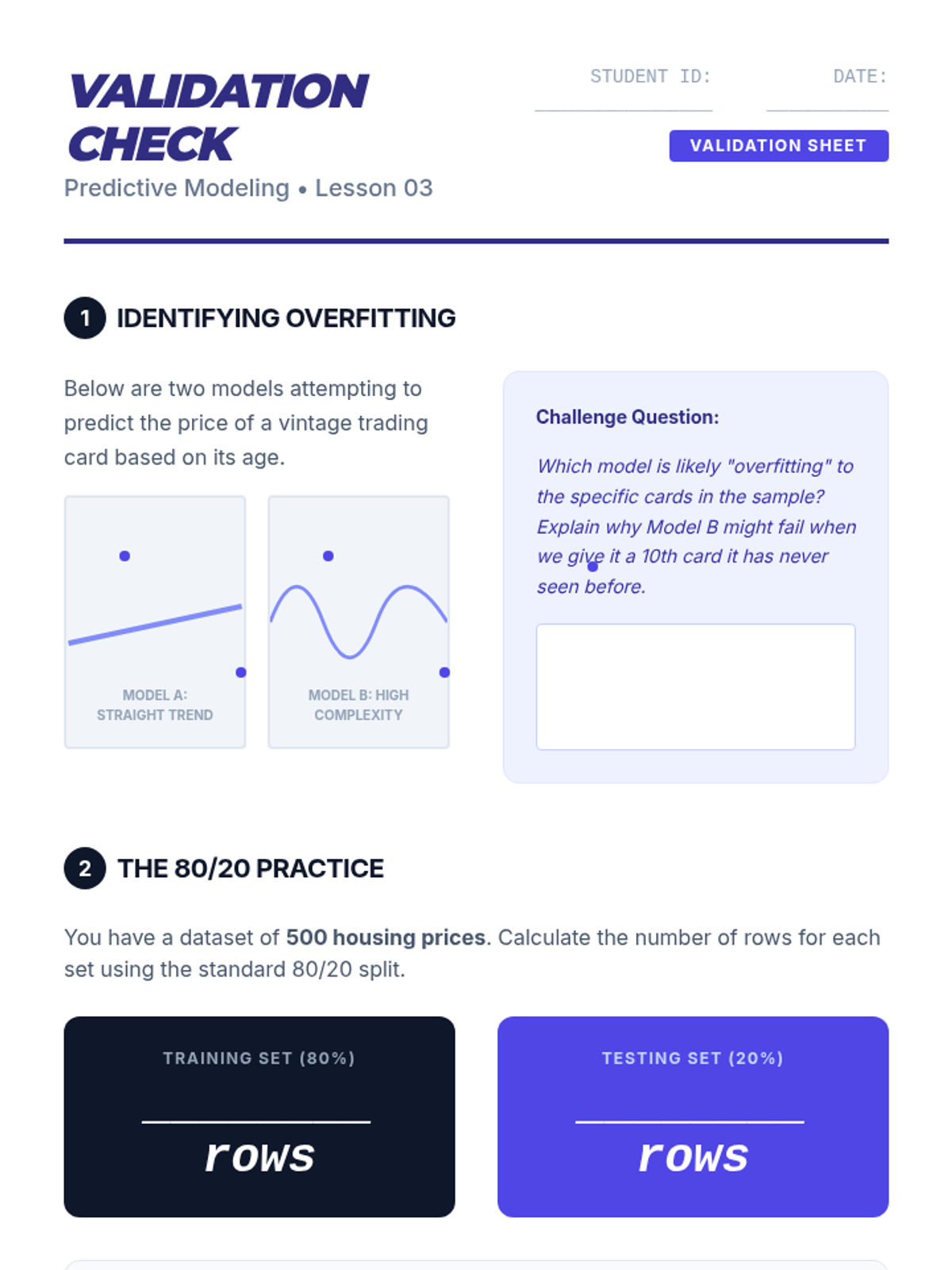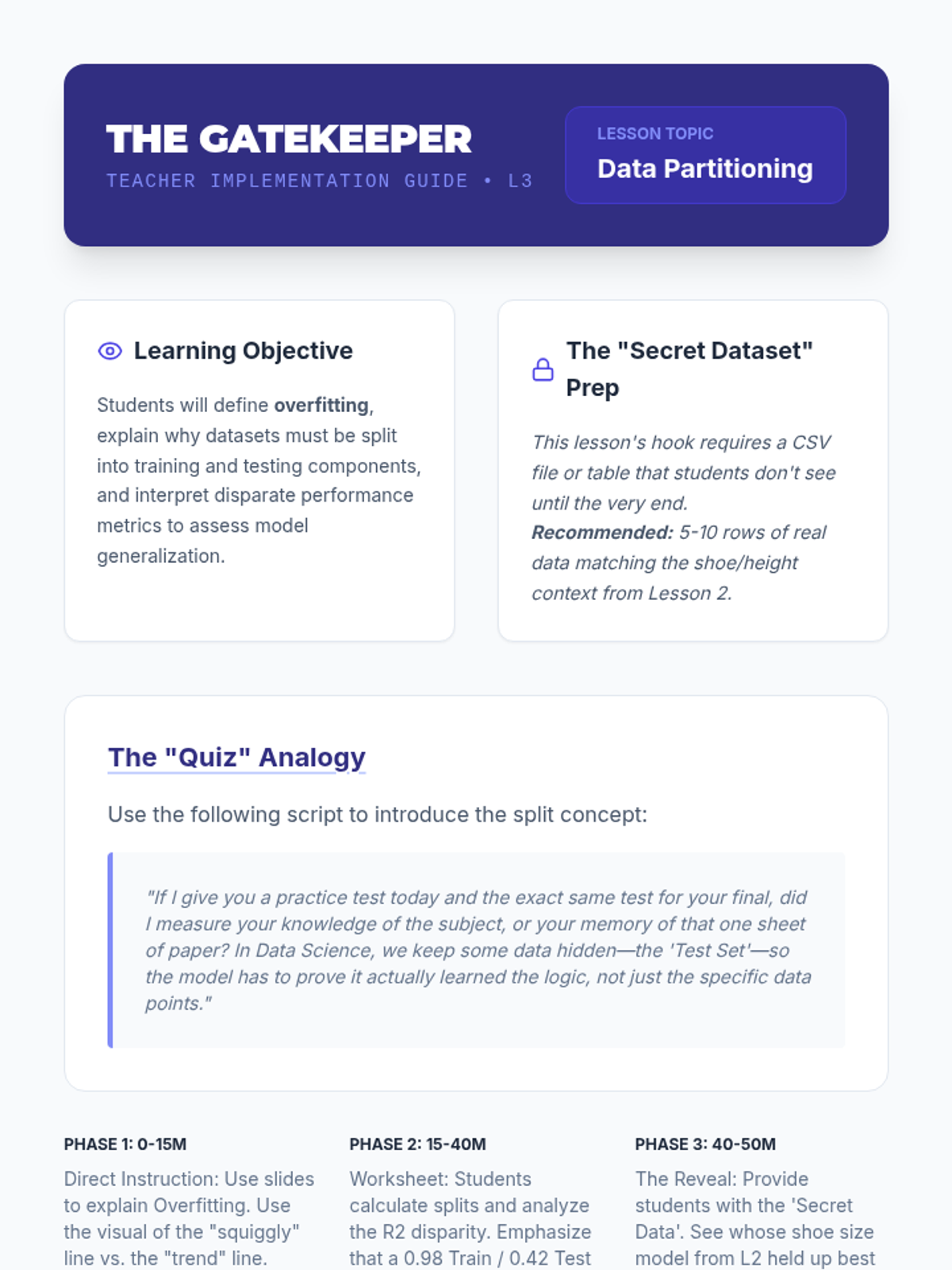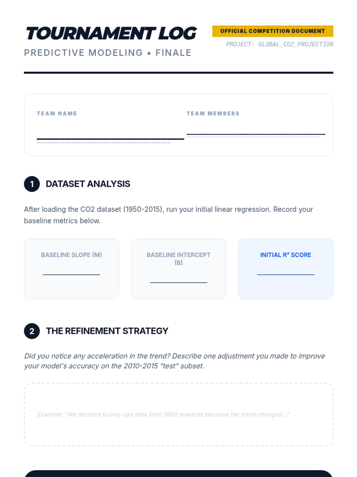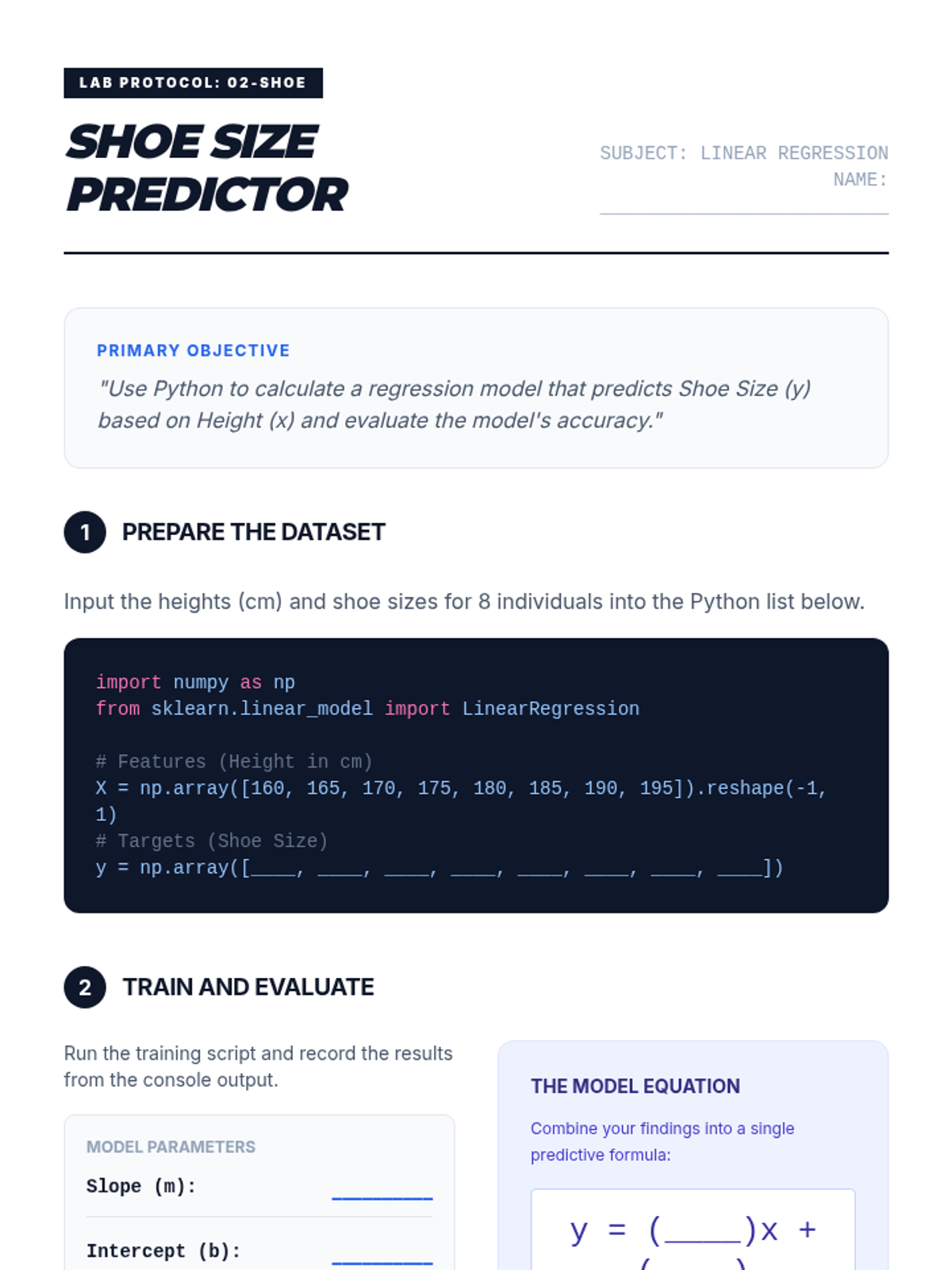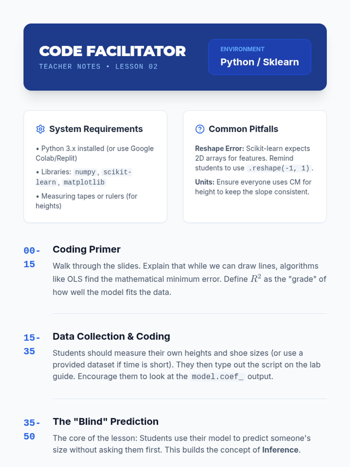A comprehensive unit on data analysis and predictive modeling. Students learn to identify trends, implement linear regression in Python, validate models using training and testing splits, and explore categorical classification through real-world case studies and a gamified tournament.