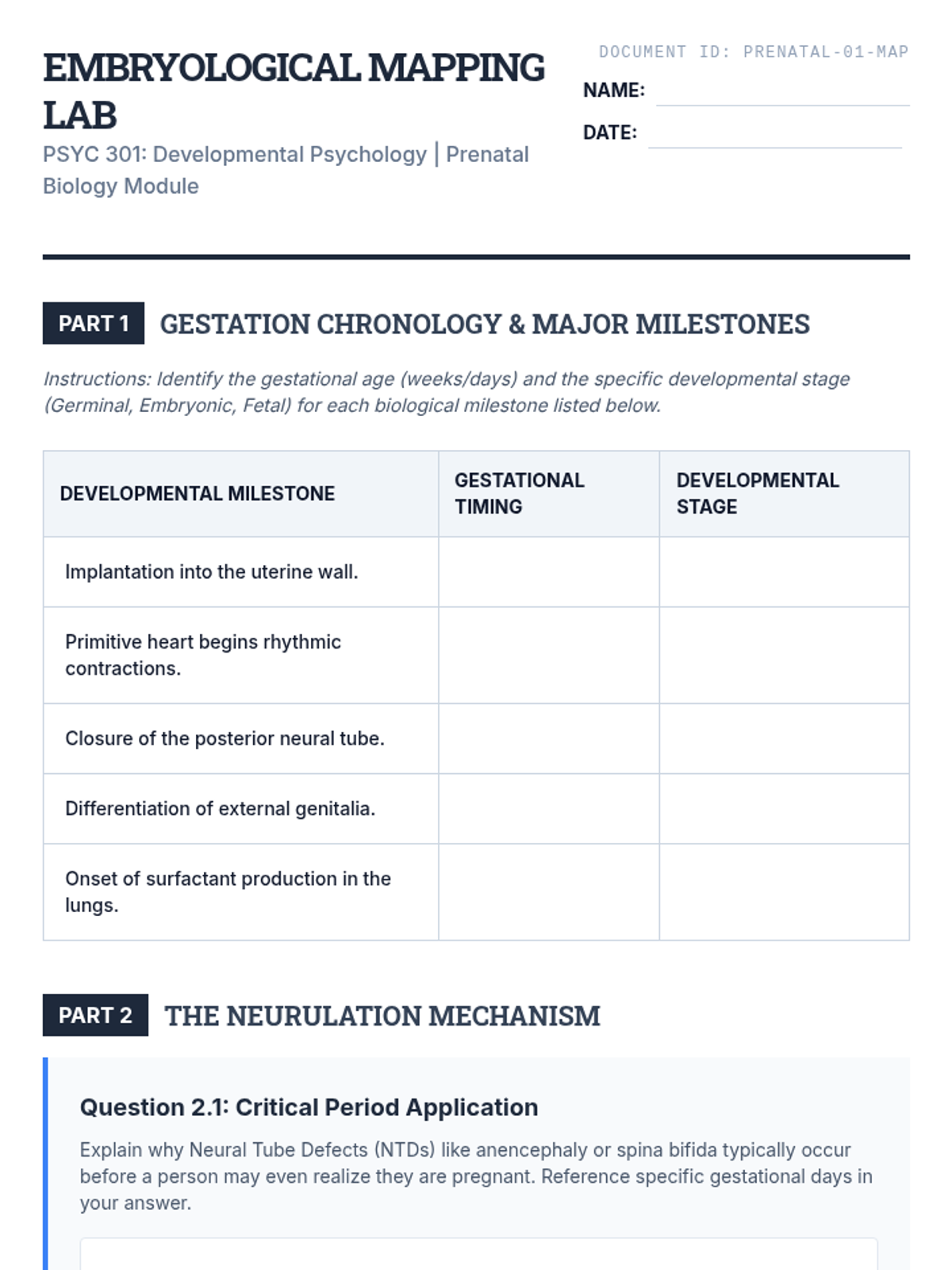 A comprehensive undergraduate psychology sequence examining the biological and environmental factors influencing prenatal development and the first two years of life. Students will analyze gestation stages, teratogenic risks, neonatal assessment techniques, and the development of motor, cognitive, and attachment systems.