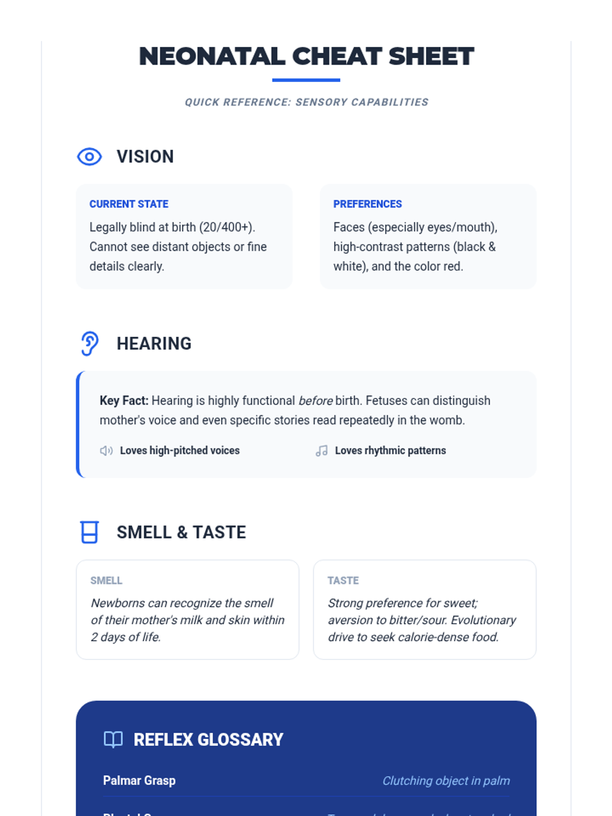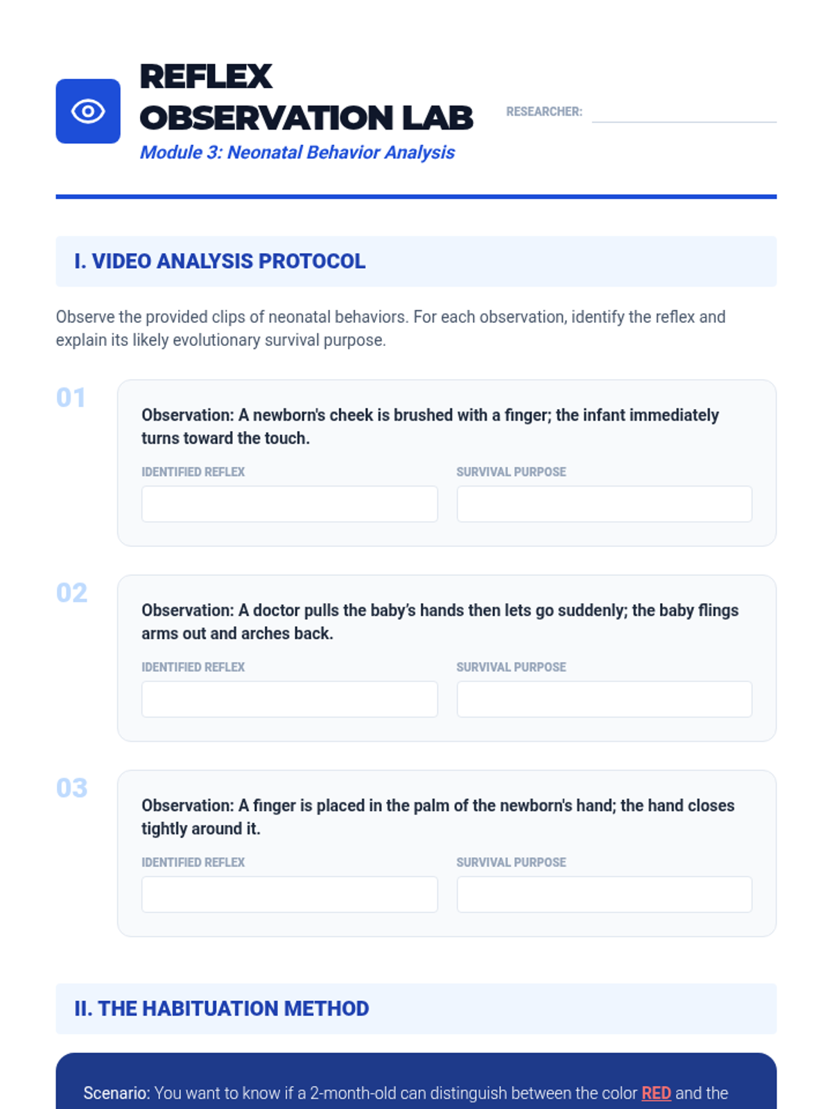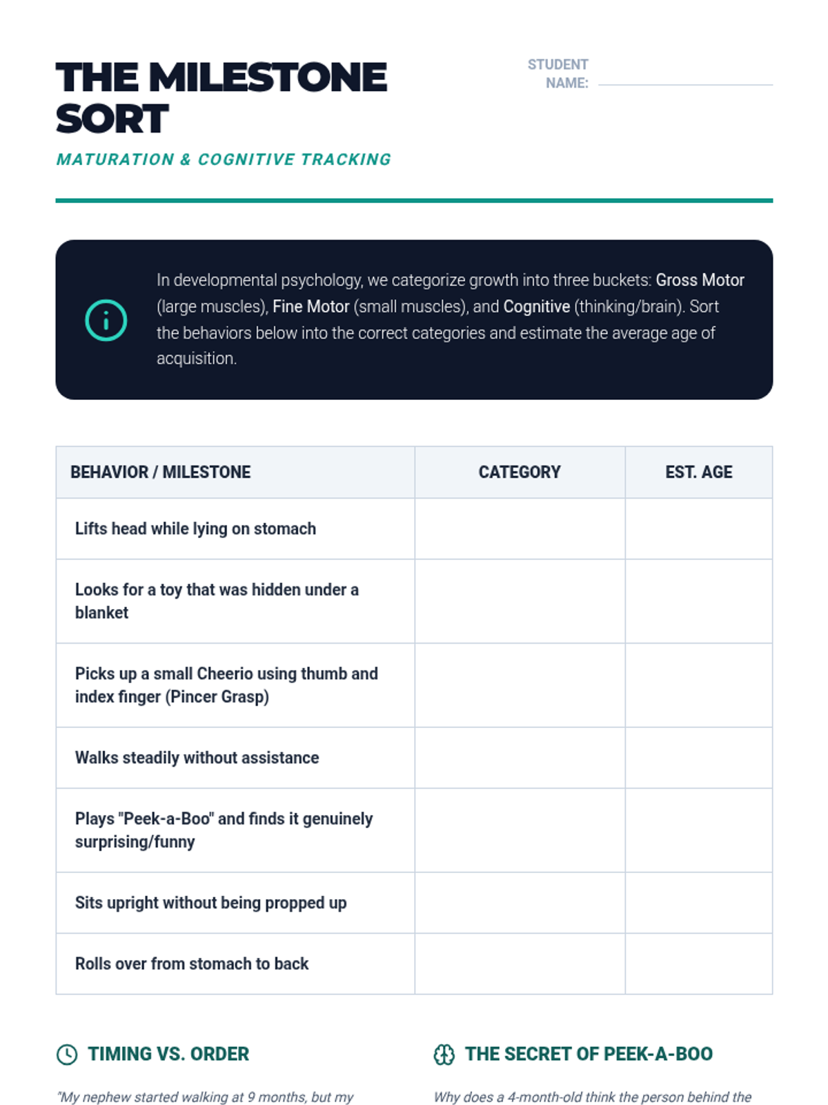 This sequence guides students through the biological and psychological progression of human life from conception to toddlerhood, analyzing prenatal stages, environmental risks, neonatal reflexes, milestones, and attachment theories.