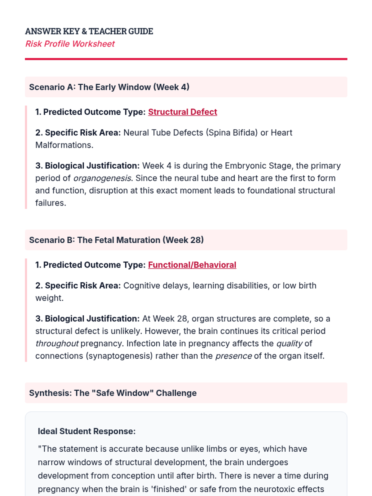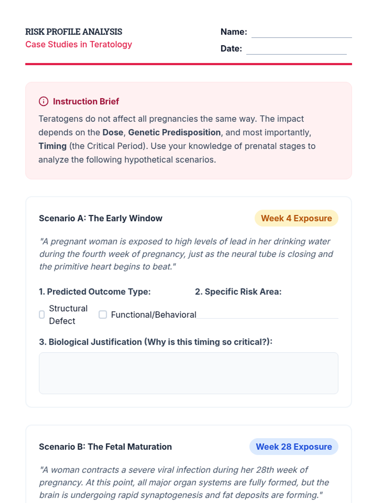 This sequence explores the biological journey from conception to birth, examining the stages of prenatal development, the impact of teratogens during critical periods, and the innate physiological and sensory capabilities of the newborn. Students transition from studying cellular growth to applying clinical assessments like the Apgar scale.
