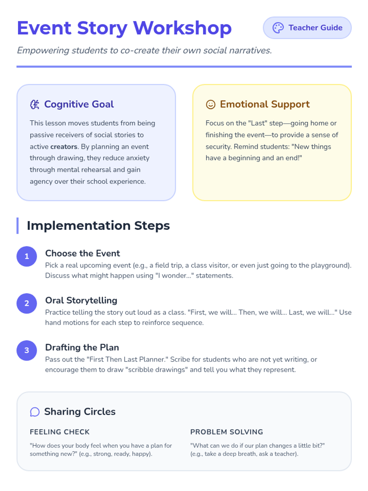 A Pre-K sequence focused on using social stories to help students navigate non-routine school events like safety drills, substitute teachers, assemblies, and nurse visits. This project-based approach empowers students to co-create narratives and prepare for the unexpected with confidence and calm.