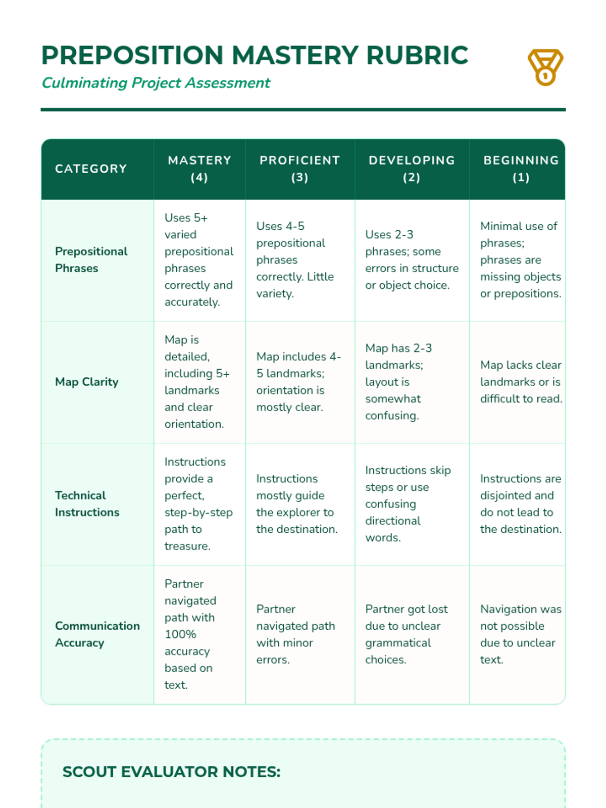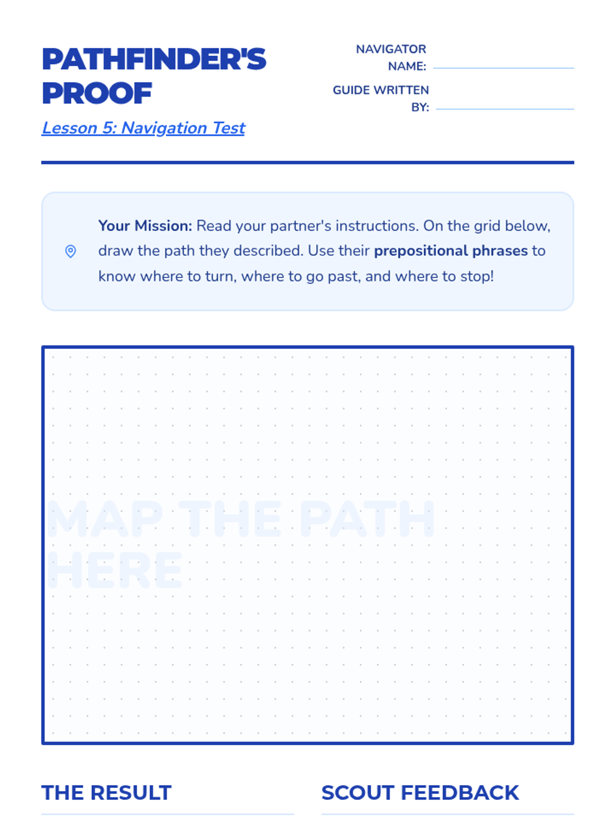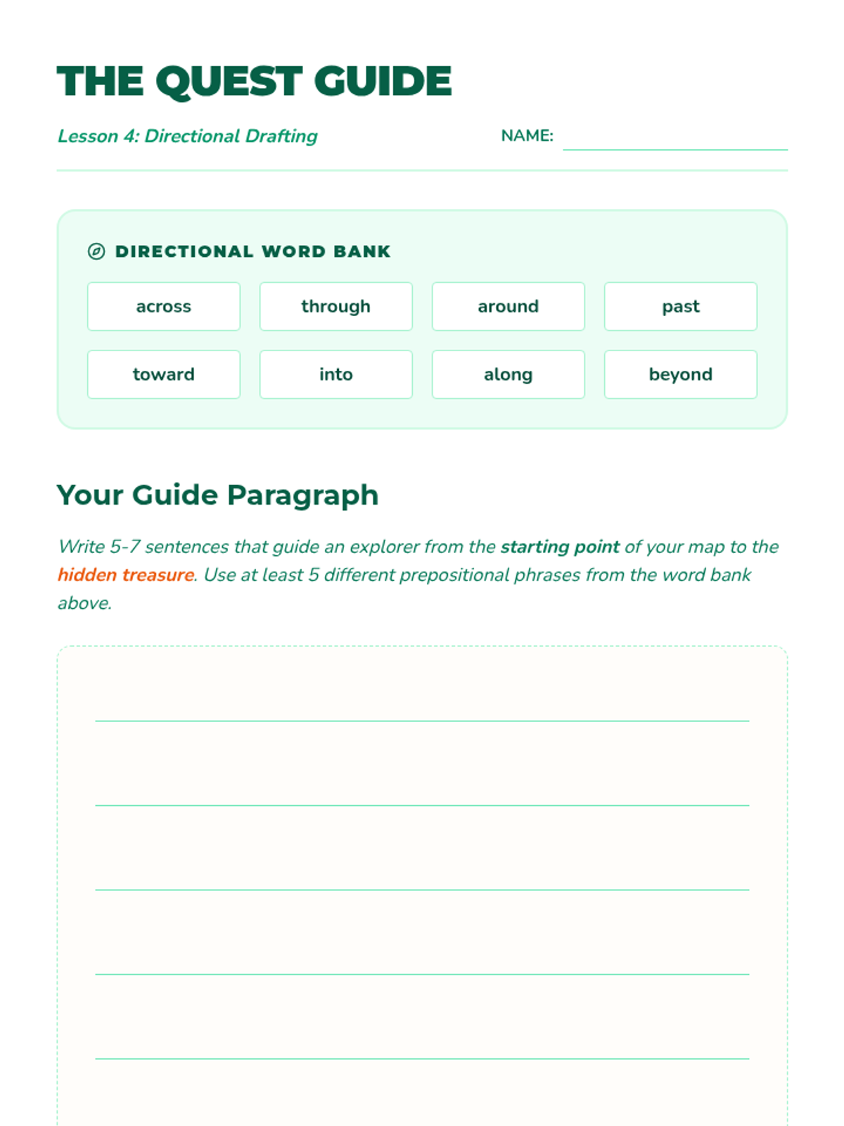 A 5-lesson unit for 4th graders on using prepositions and prepositional phrases to describe spatial relationships, culminating in a creative map-making and navigation project.