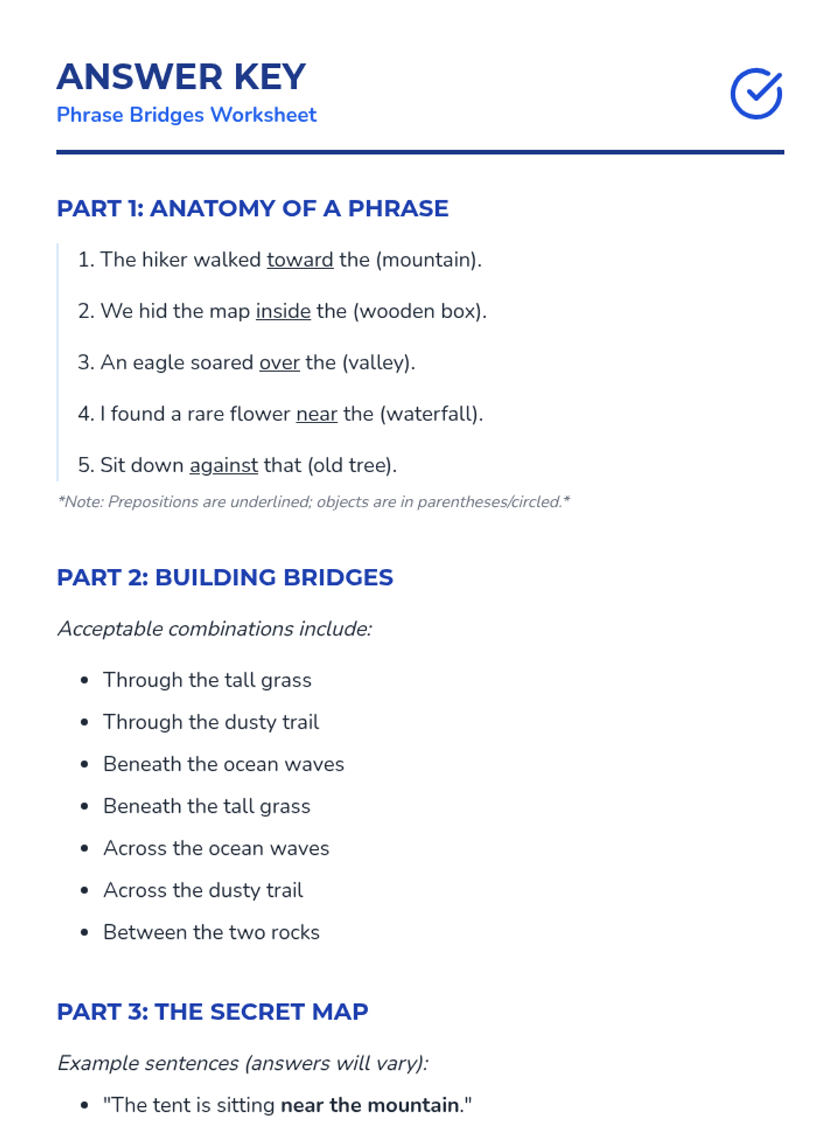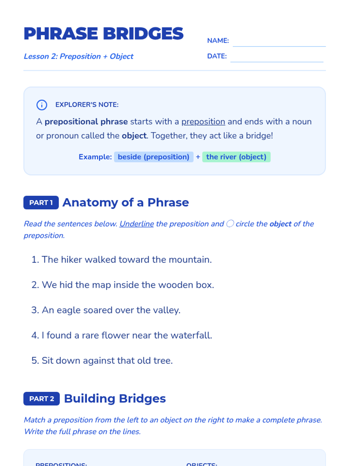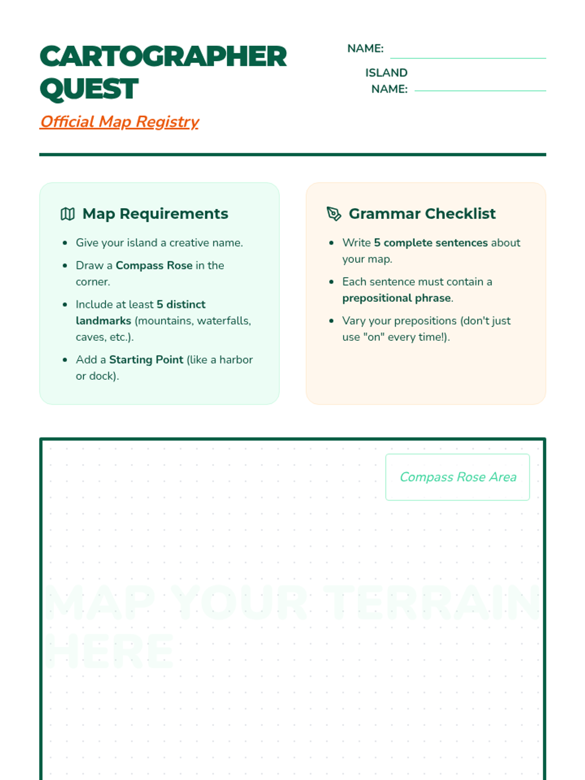 A 5-lesson unit for 4th graders on using prepositions and prepositional phrases to describe spatial relationships, culminating in a creative map-making and navigation project.