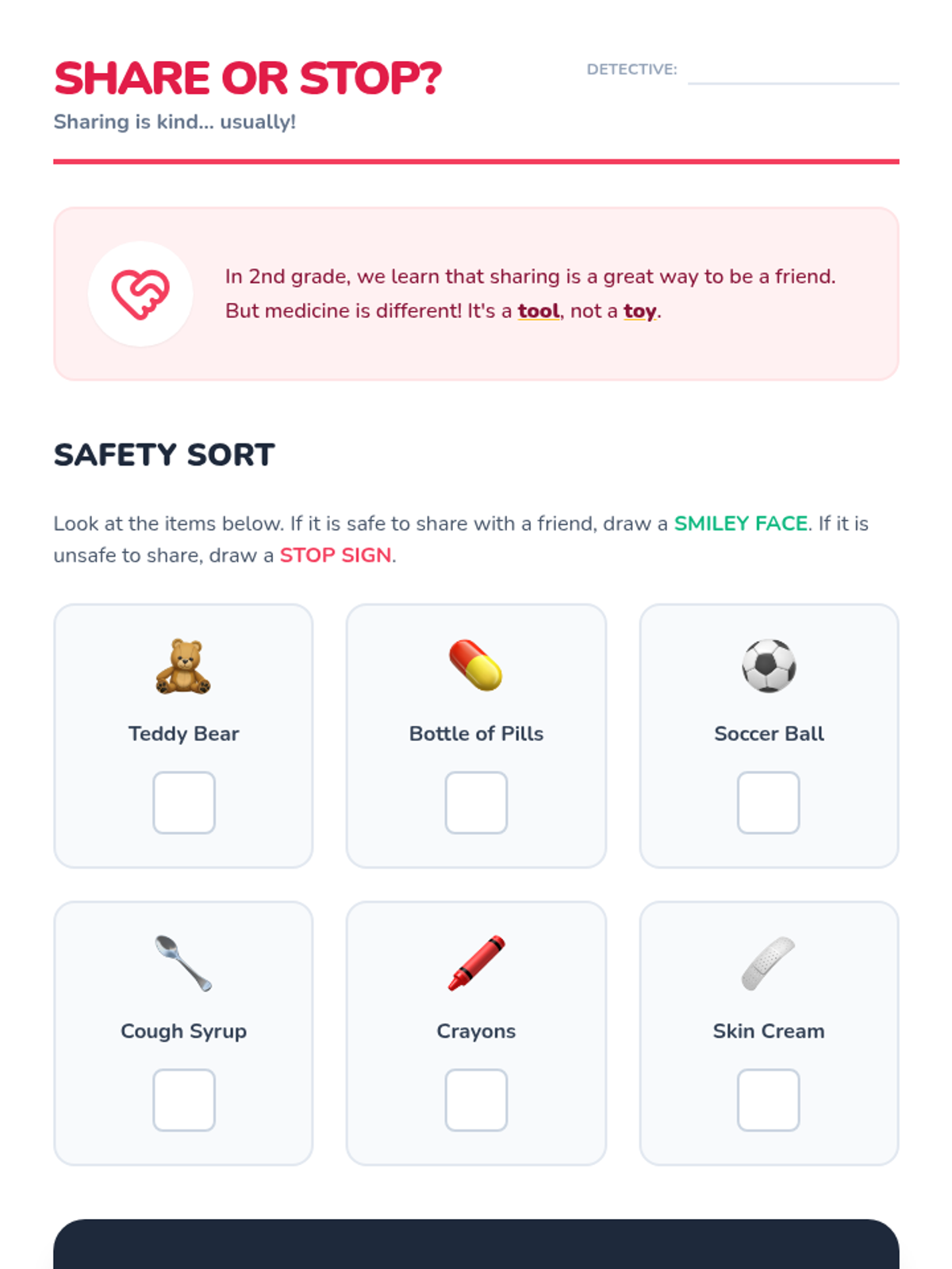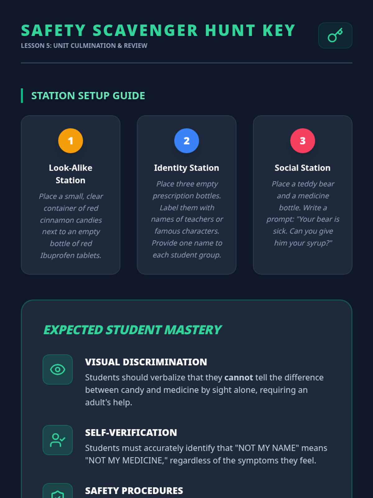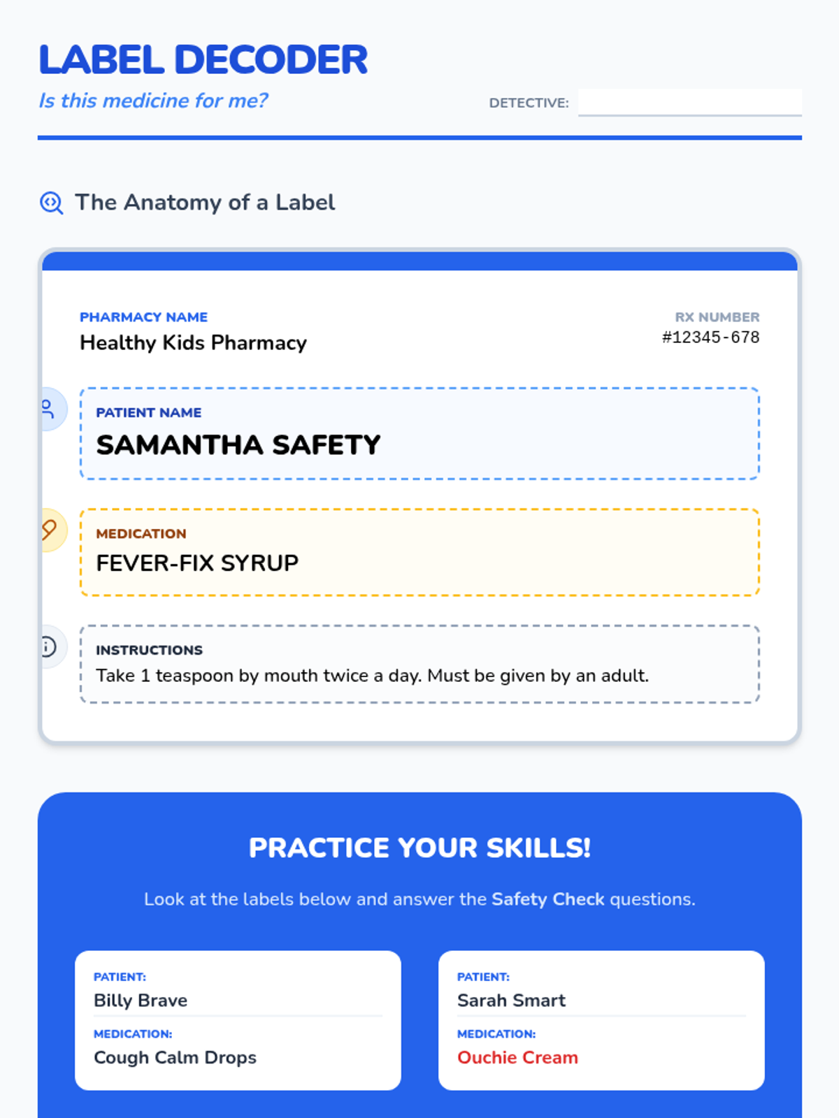 A 5-lesson unit for 2nd graders on prescription drug safety, focusing on distinguishing medicine from candy, reading labels, understanding dosage, and the importance of not sharing medicine. Students develop visual literacy and risk-assessment skills through inquiry-based and game-based learning.