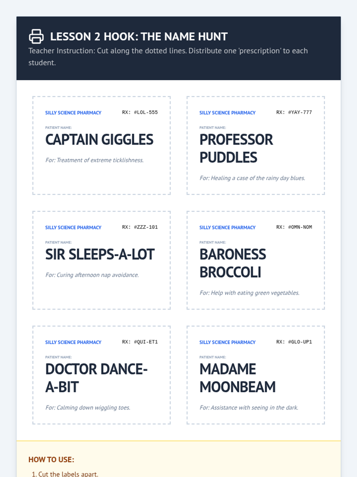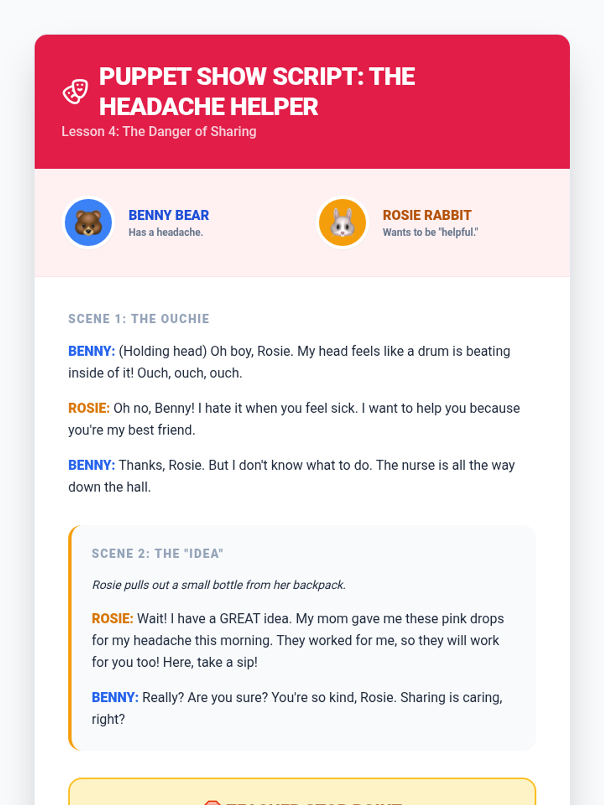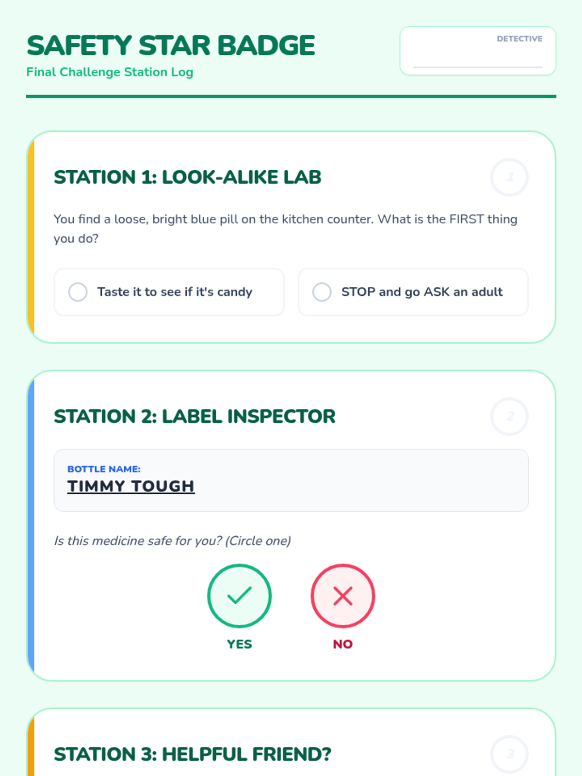 A 5-lesson unit for 2nd graders on prescription drug safety, focusing on distinguishing medicine from candy, reading labels, understanding dosage, and the importance of not sharing medicine. Students develop visual literacy and risk-assessment skills through inquiry-based and game-based learning.