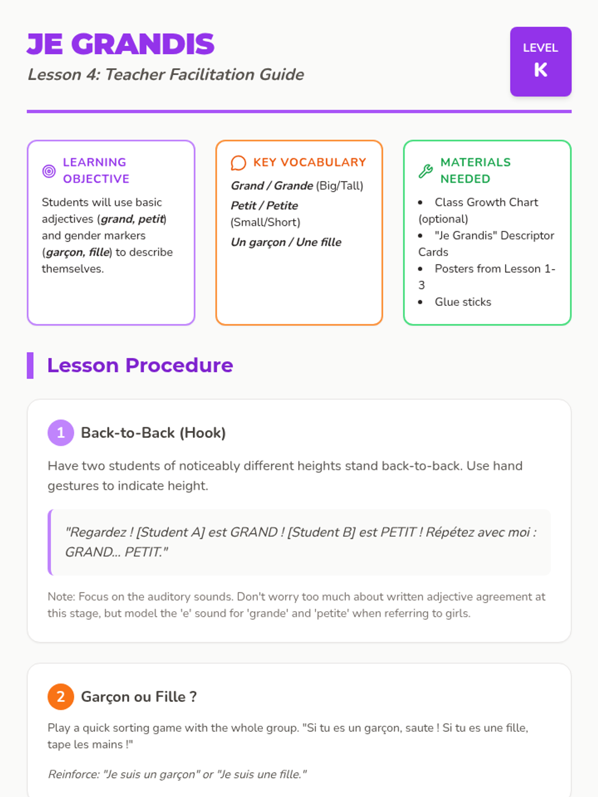 A foundational Spanish sequence for Kindergarteners focusing on greetings, introductions, feelings, and basic politeness through immersive play, songs, and movement.