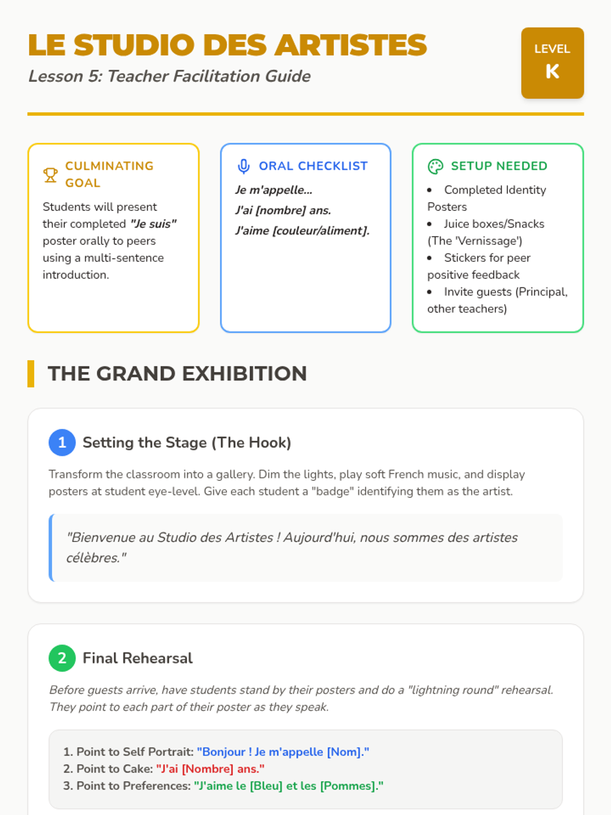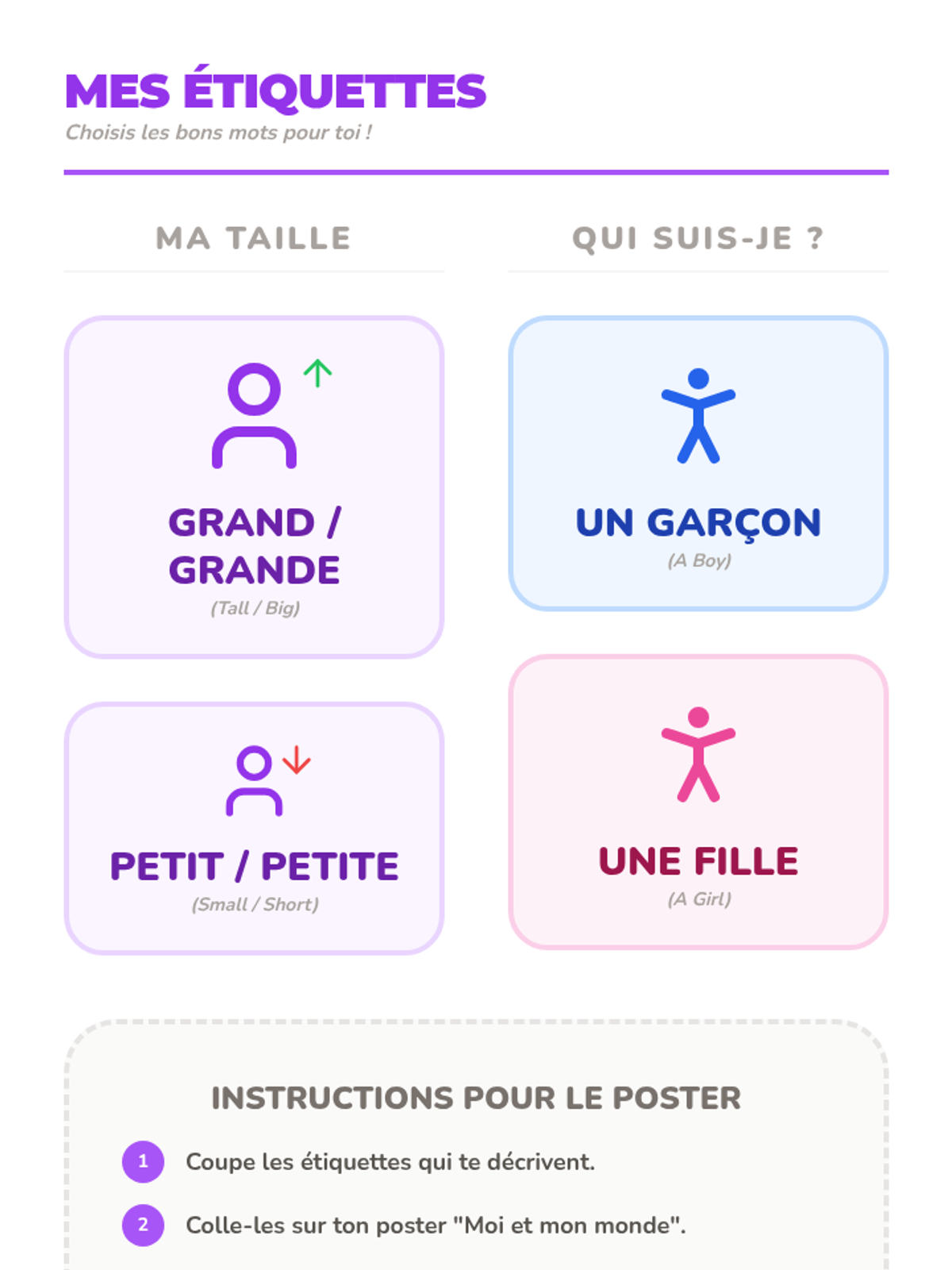 A Kindergarten French immersion project where students learn to share their name, age, and preferences through art and oral presentation, culminating in a 'Je suis' multimedia poster.