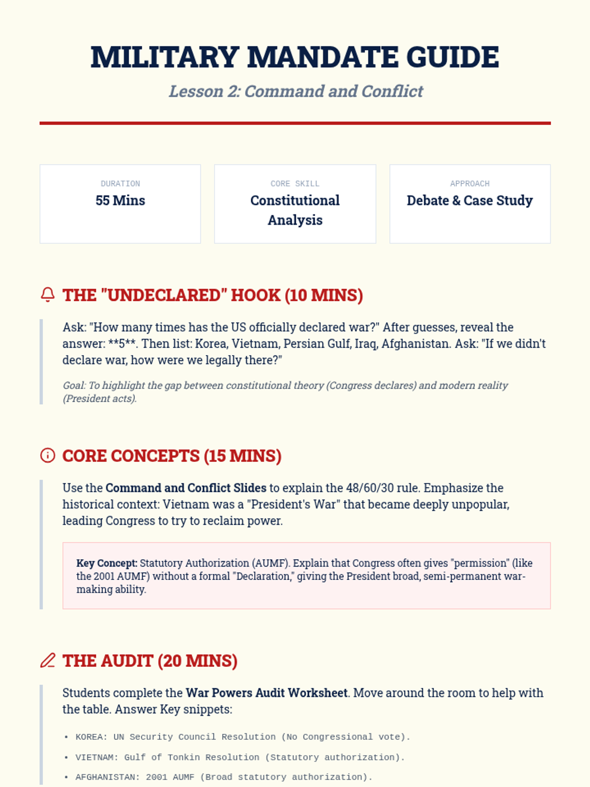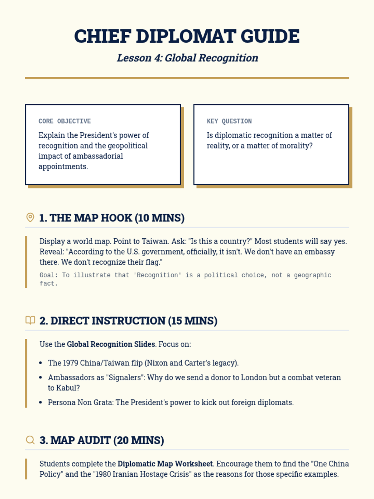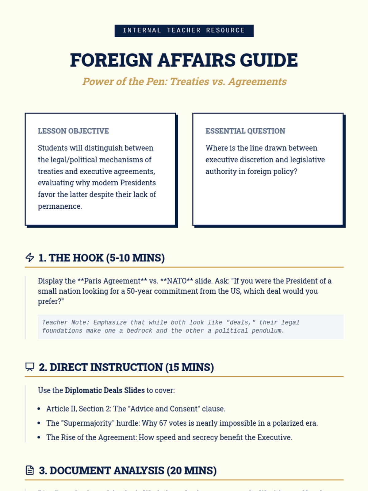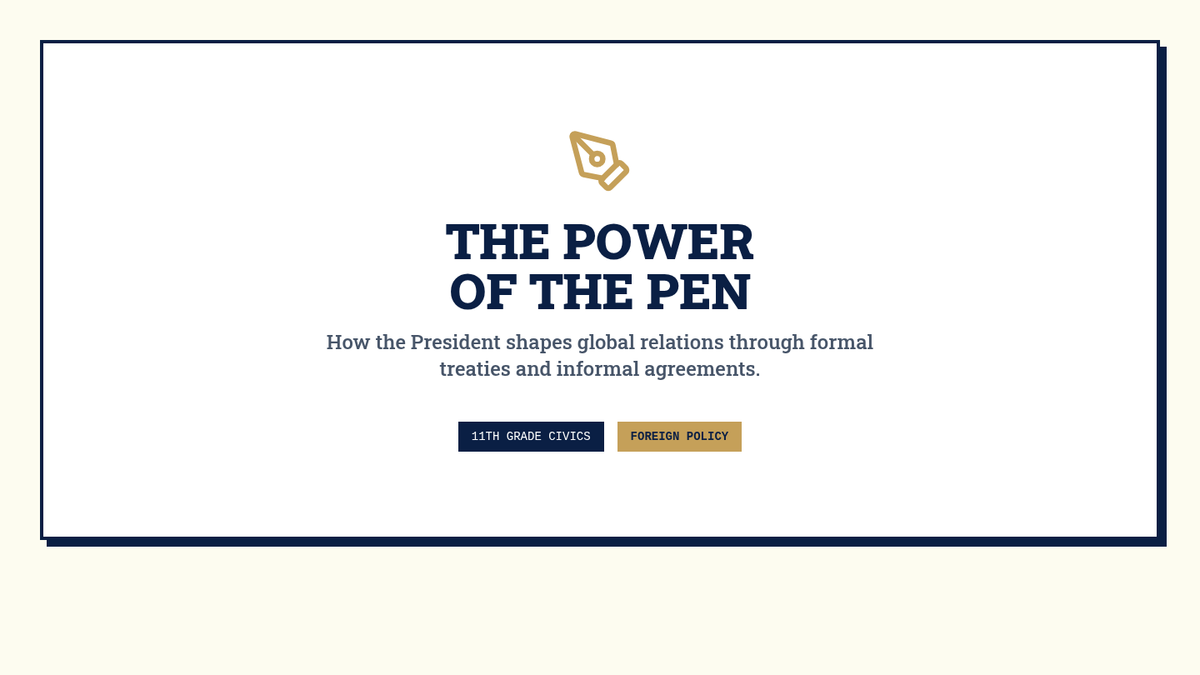 This 11th-grade Civics sequence explores the President's expansive role in foreign policy, from formal treaties to modern-day crisis management. Students analyze the constitutional balance of power, the shift toward executive agreements, and the complexities of the Commander-in-Chief role in the 21st century.