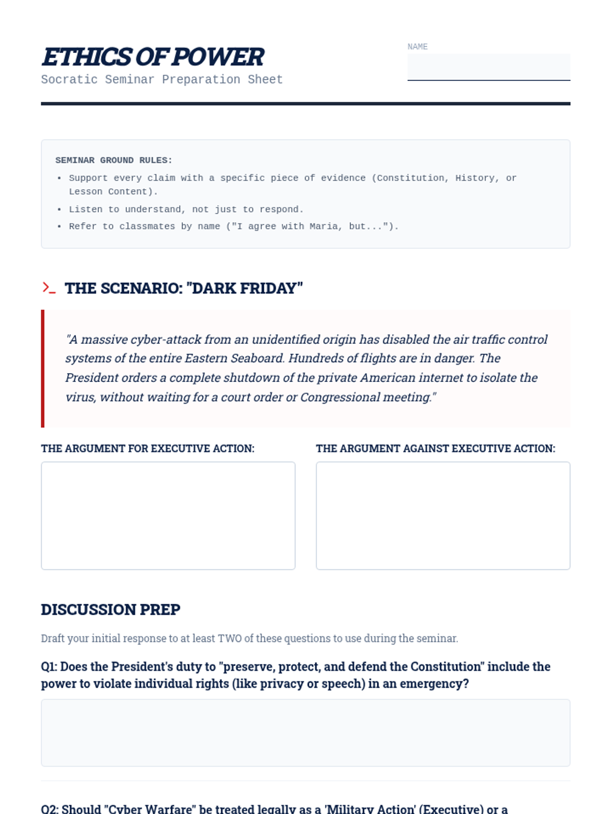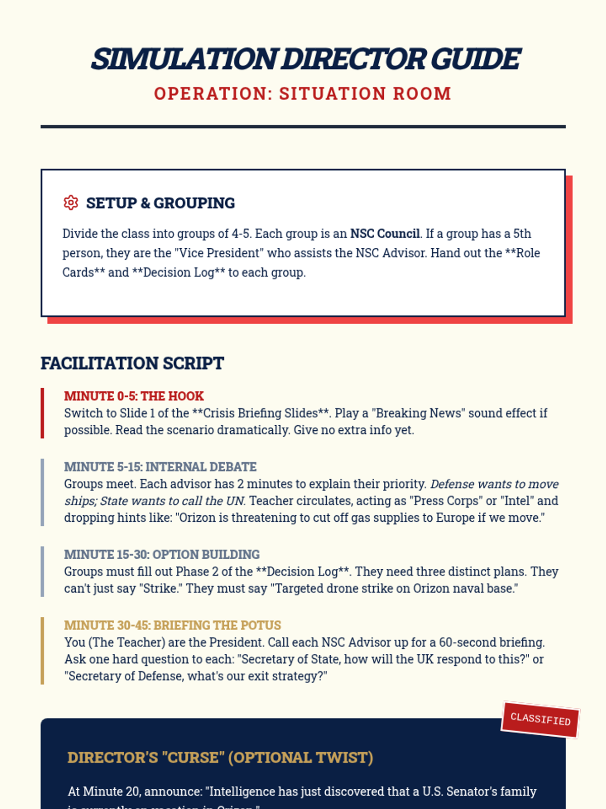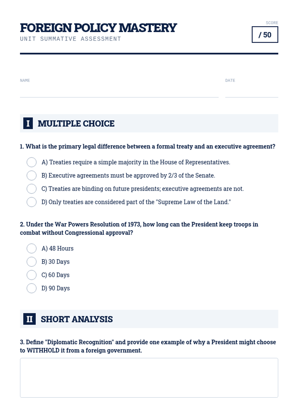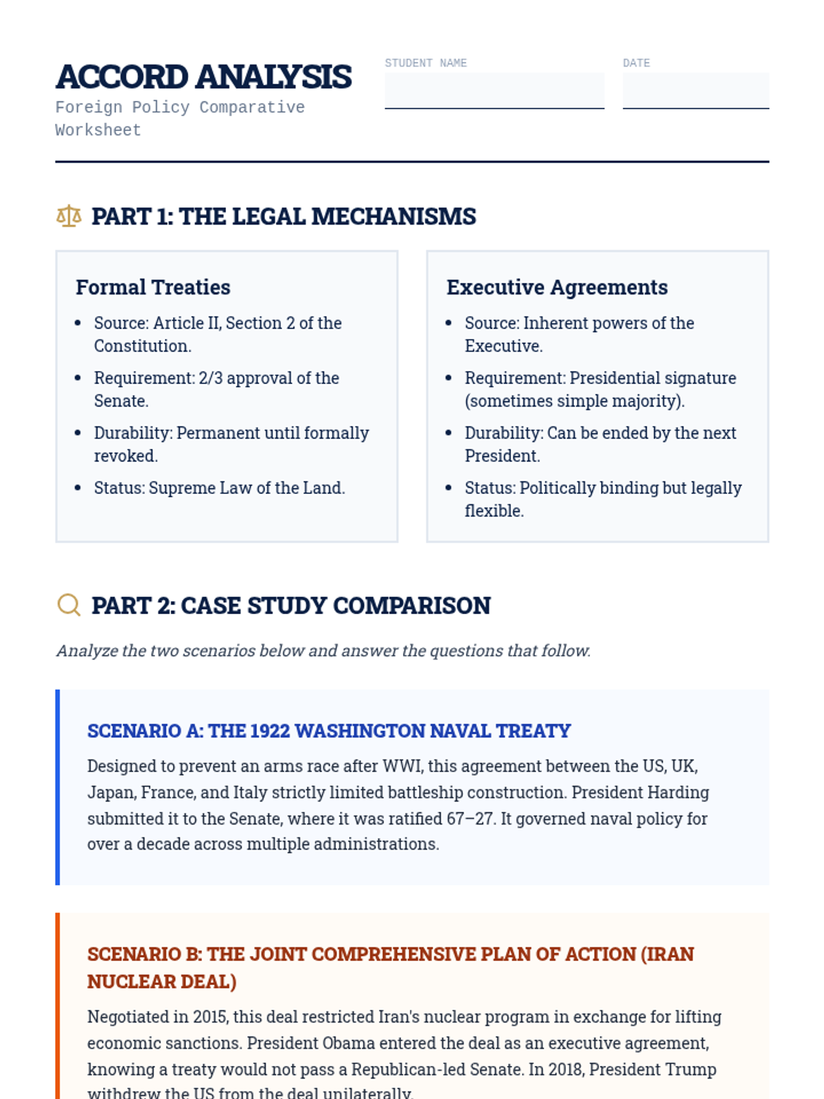 This 11th-grade Civics sequence explores the President's expansive role in foreign policy, from formal treaties to modern-day crisis management. Students analyze the constitutional balance of power, the shift toward executive agreements, and the complexities of the Commander-in-Chief role in the 21st century.