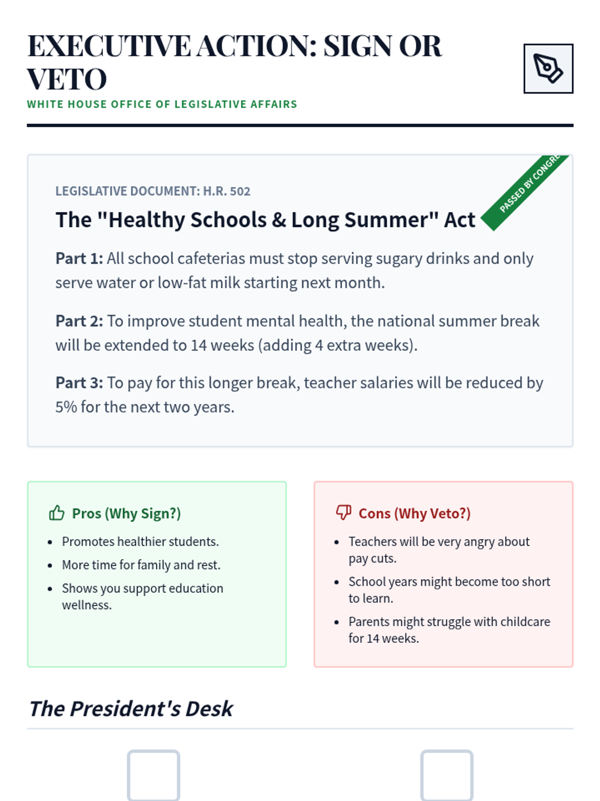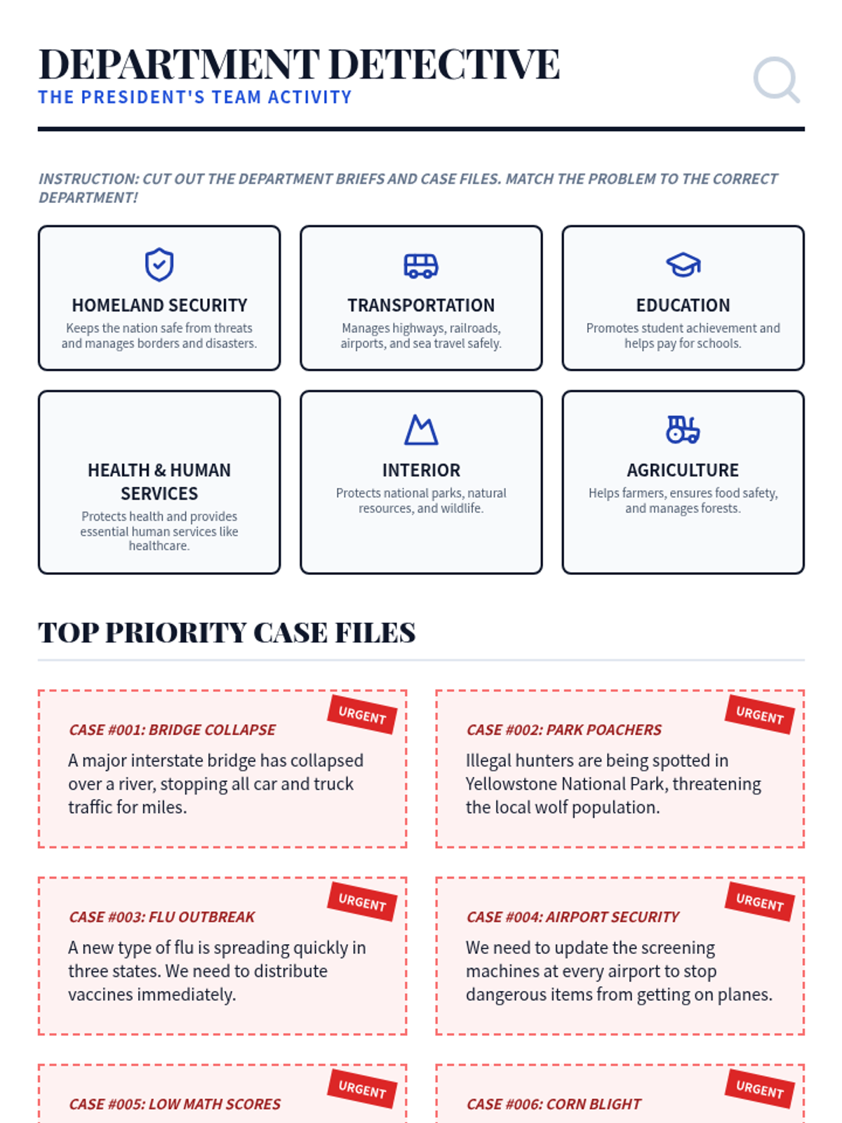 A comprehensive 5th-grade unit exploring the United States Executive Branch. Students analyze the constitutional powers of the President, the roles of the Cabinet and federal bureaucracy, and the complex decision-making processes required to lead the nation.