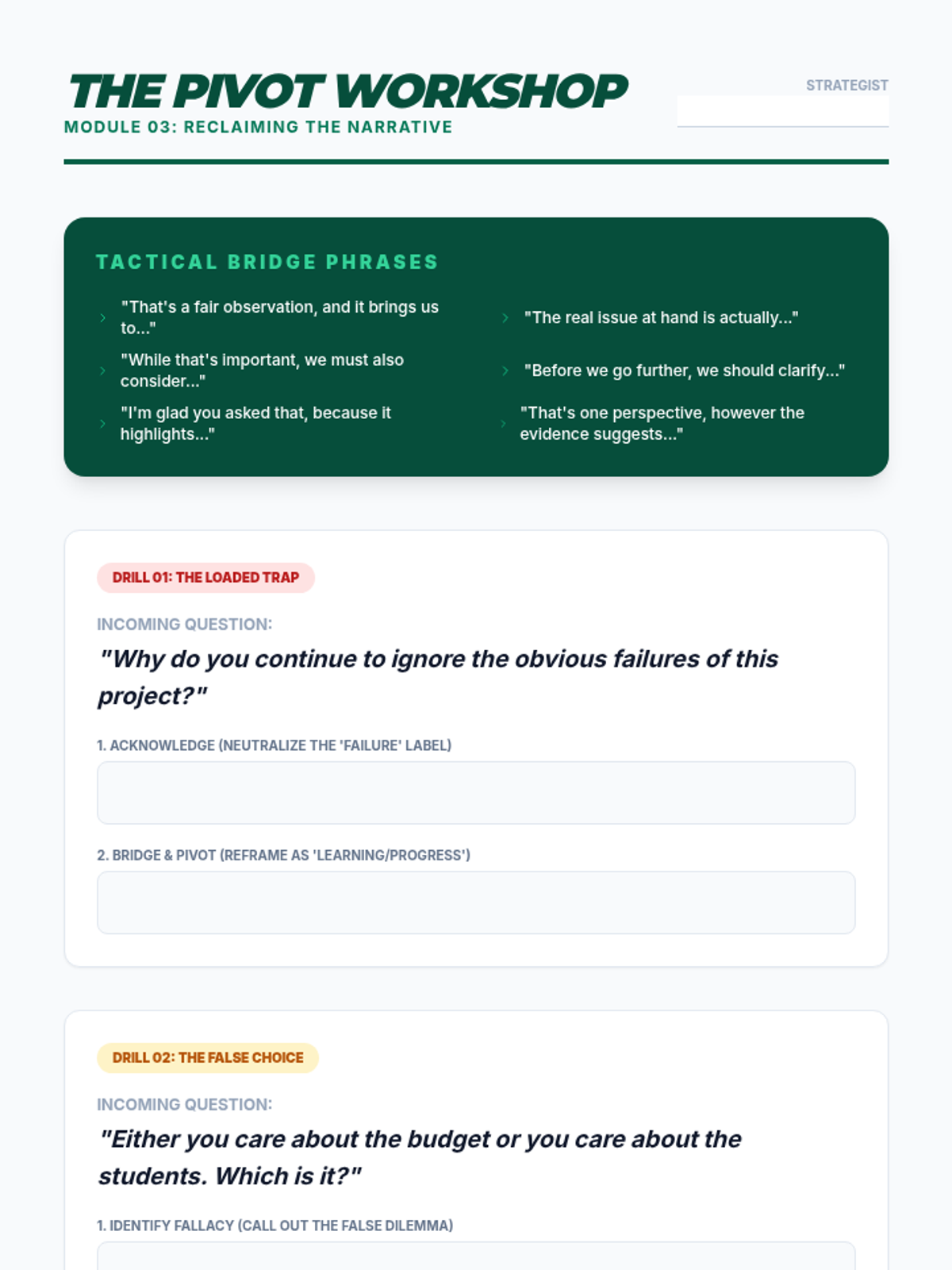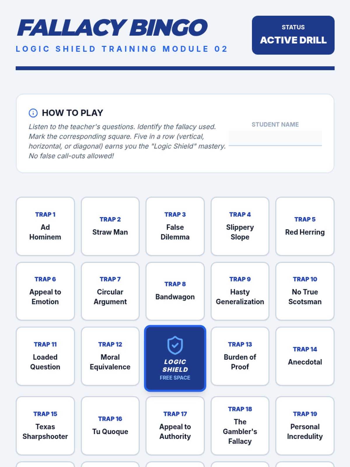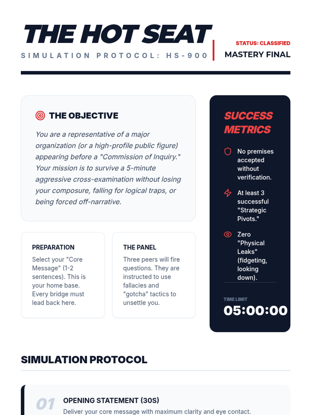 A high-stakes sequence for 11th graders focusing on defensive rhetoric, fallacy detection, and strategic communication during cross-examination. Students learn to maintain credibility and logical consistency while under aggressive scrutiny.