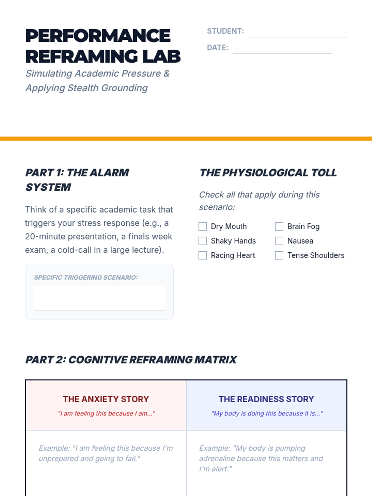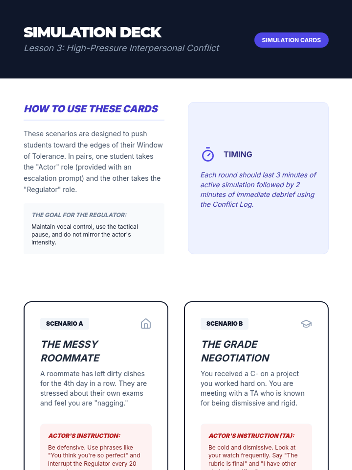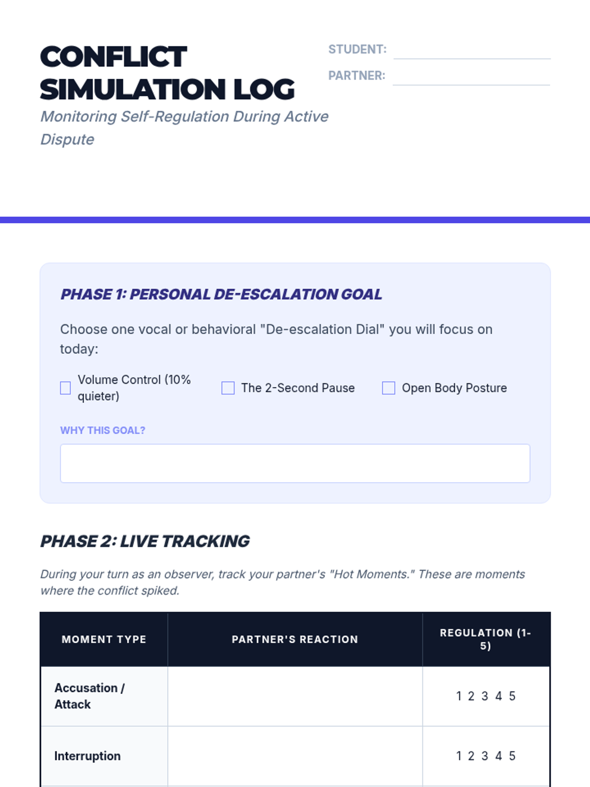An applied sequence for undergraduate students to master self-regulation and de-escalation techniques in high-pressure academic and interpersonal contexts. Students move from identifying personal physiological triggers to practicing real-time regulation during active conflict and performance.