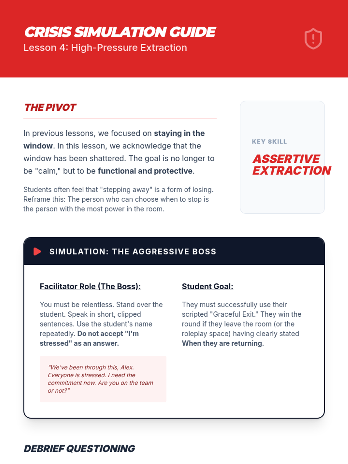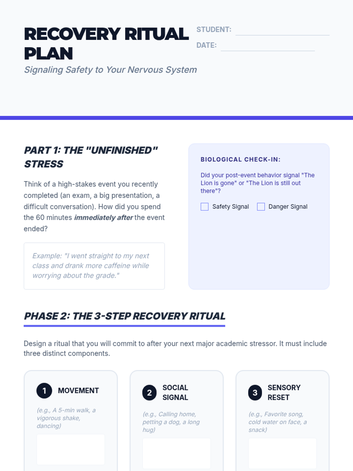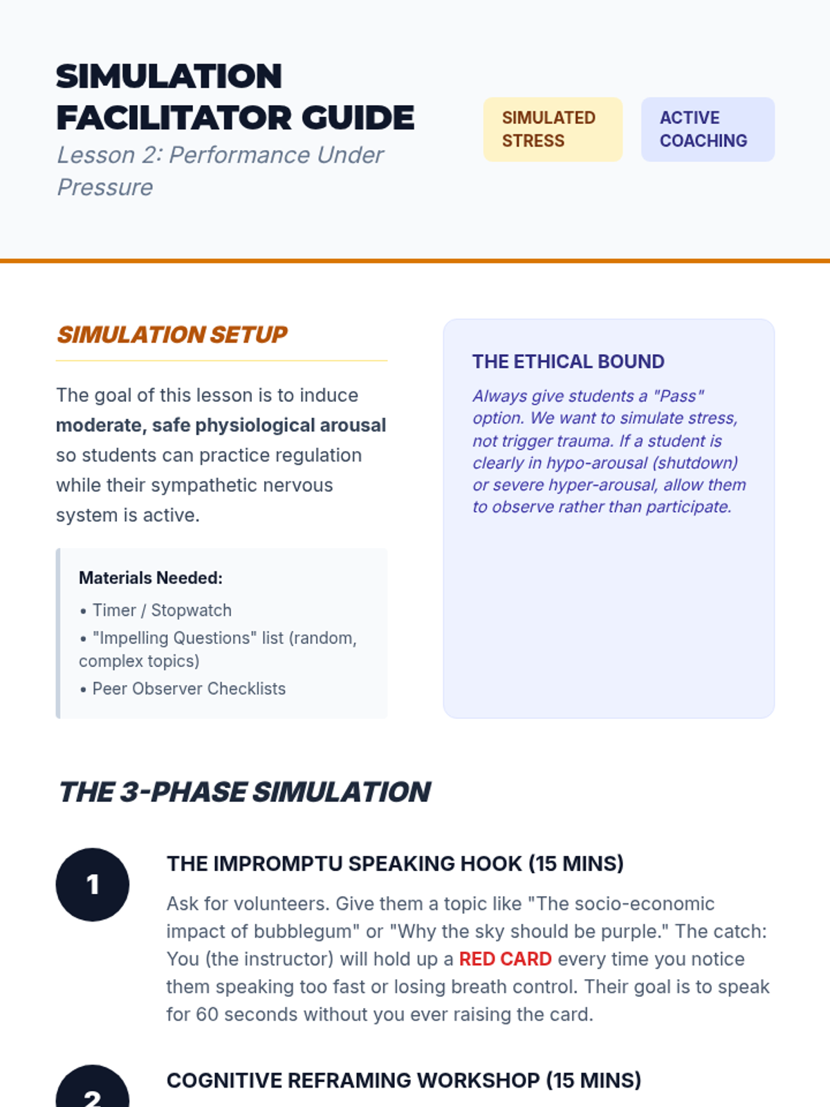 An applied sequence for undergraduate students to master self-regulation and de-escalation techniques in high-pressure academic and interpersonal contexts. Students move from identifying personal physiological triggers to practicing real-time regulation during active conflict and performance.