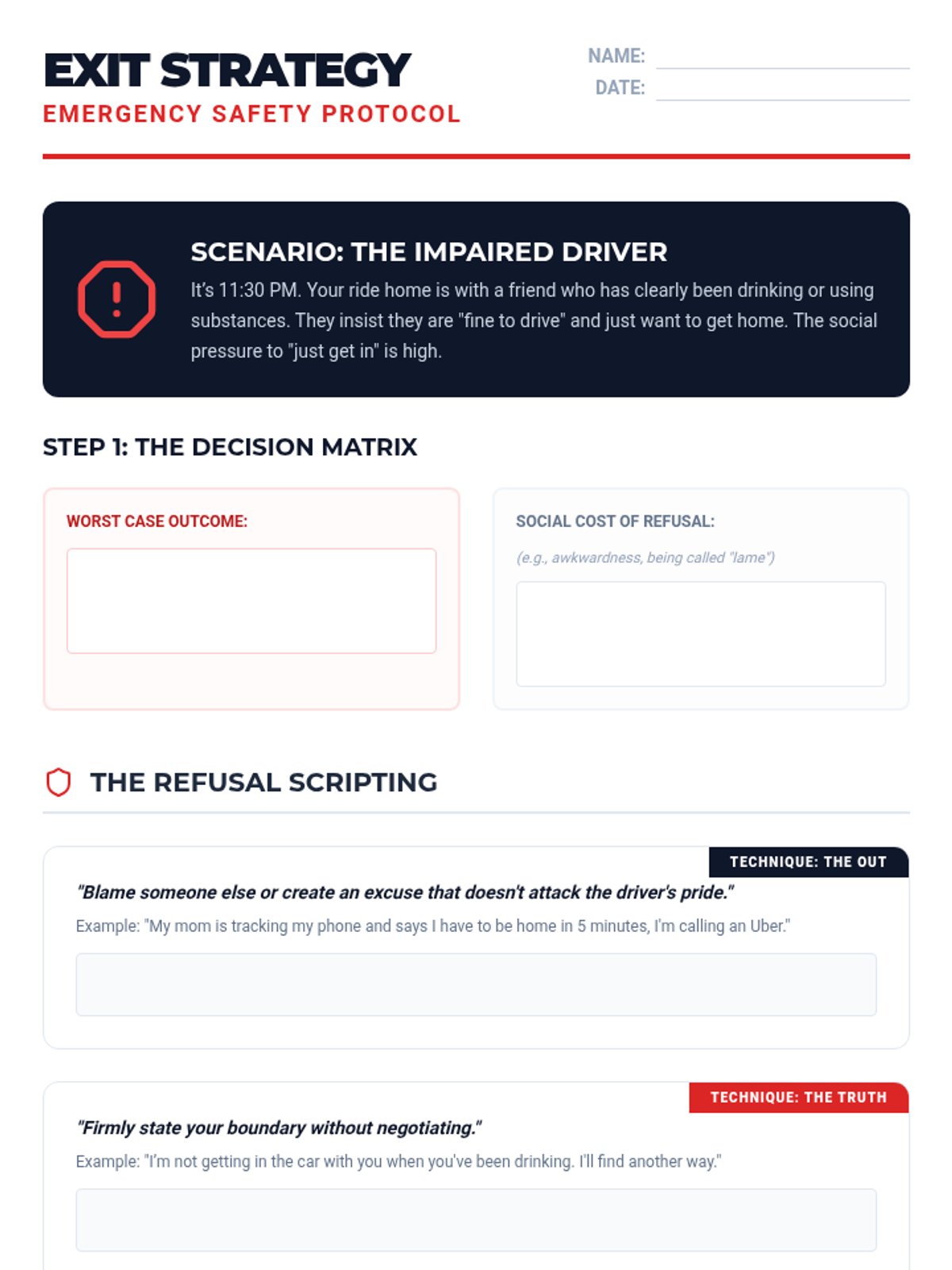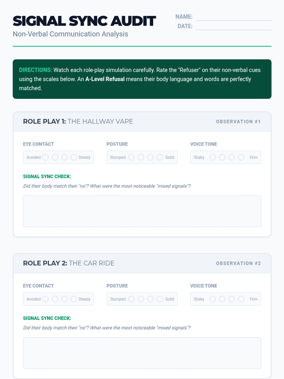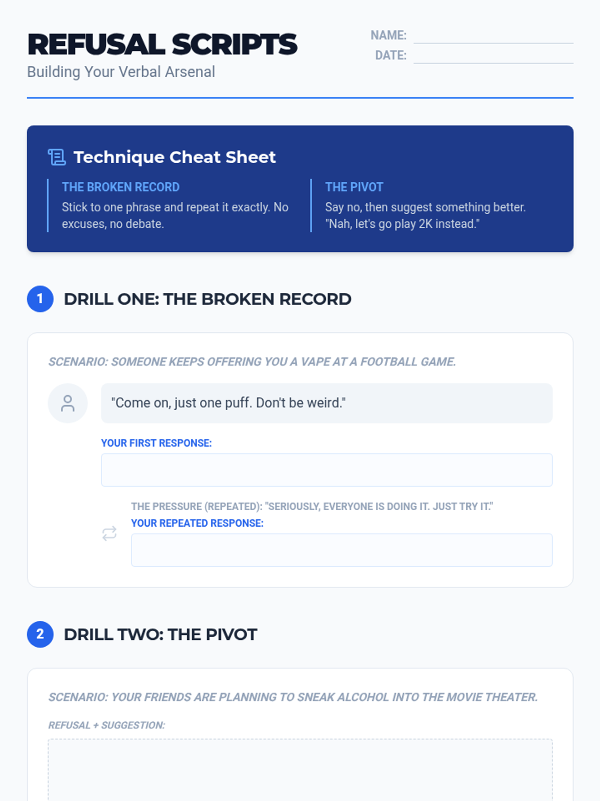 A comprehensive sequence for 9th-grade students focused on building concrete refusal skills through role-play and simulation. Students move from identifying subtle pressure to mastering verbal and non-verbal techniques, culminating in a high-stakes party simulation.