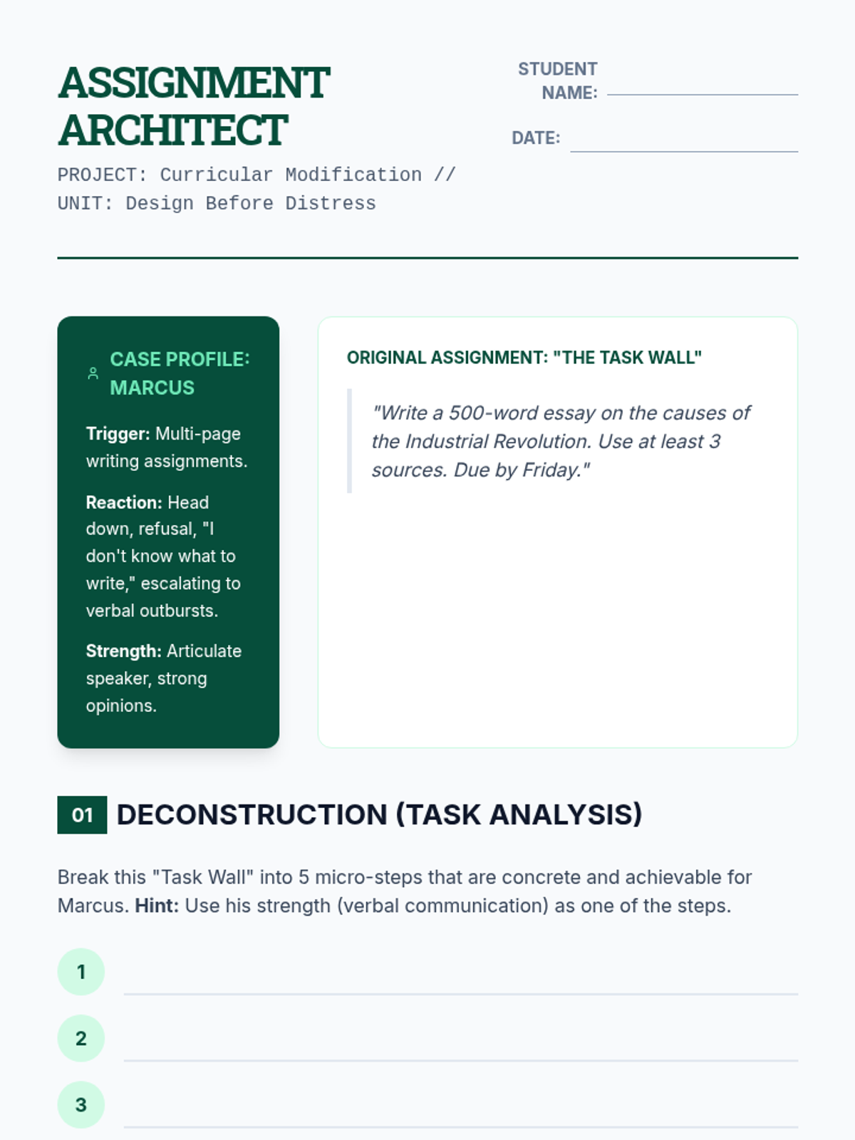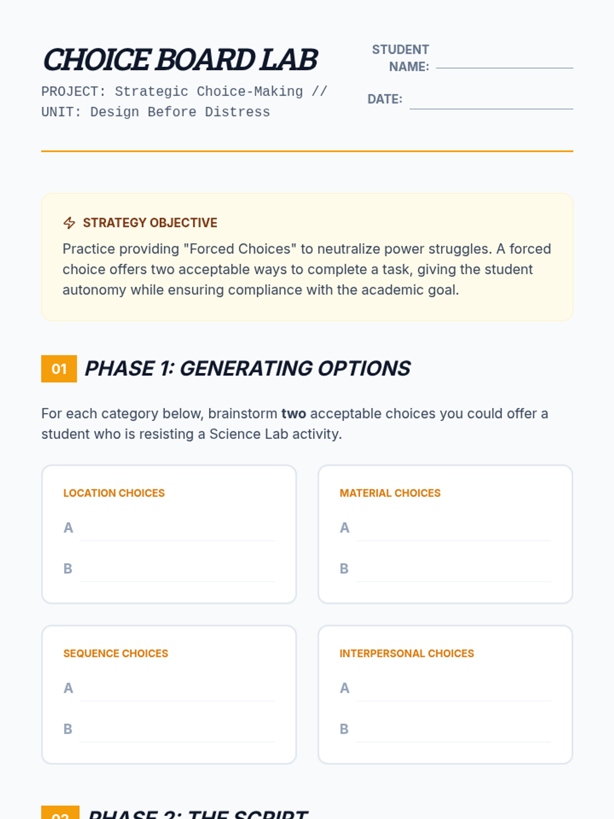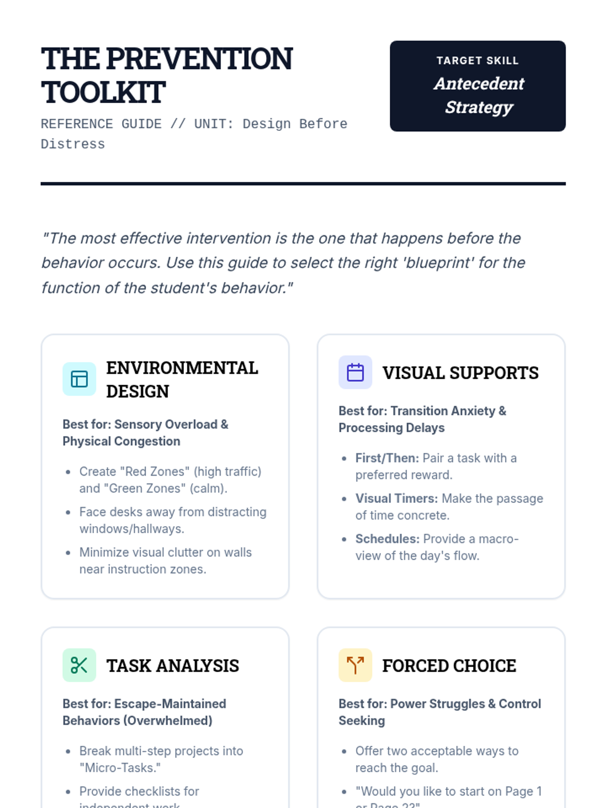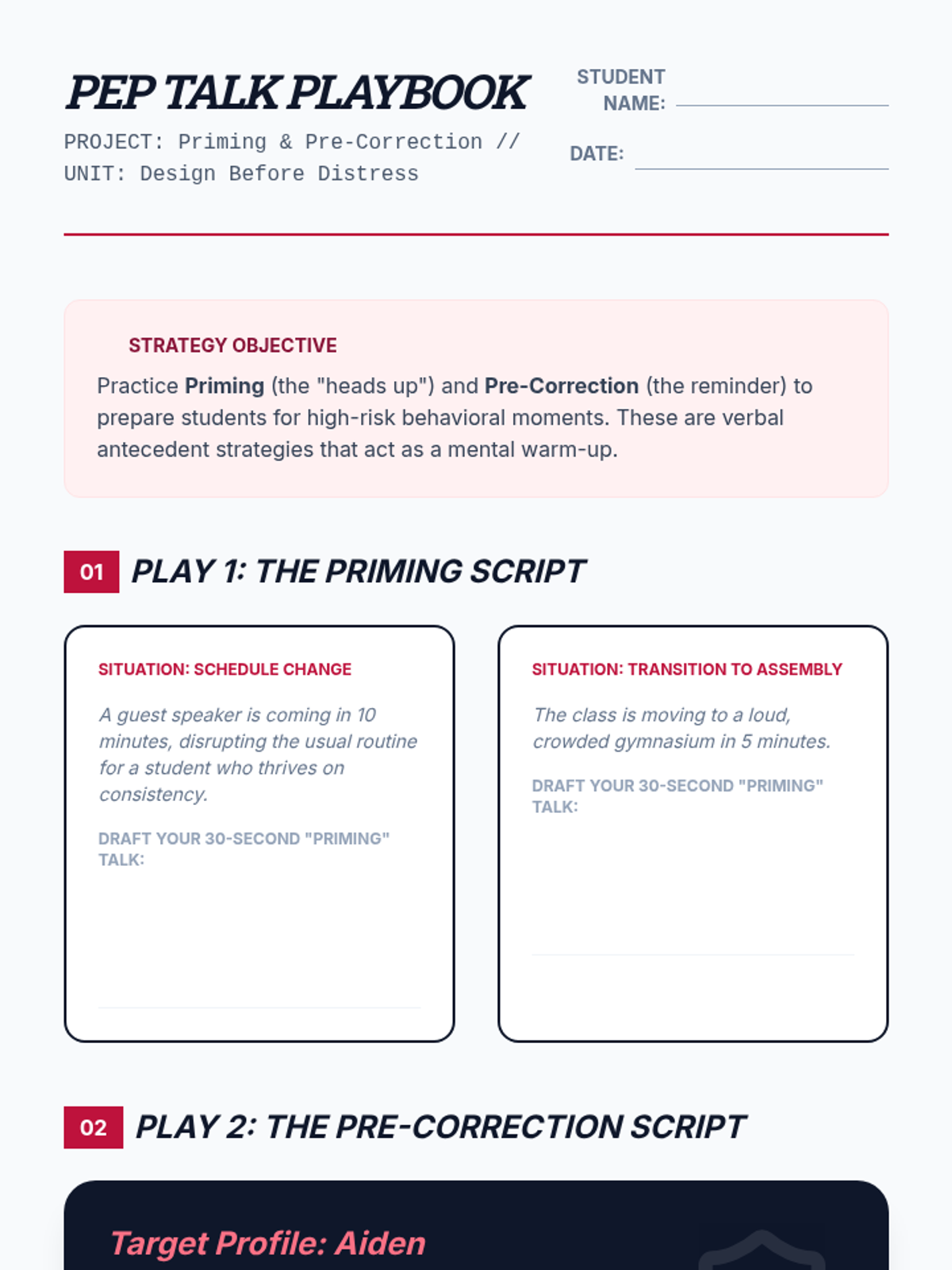 A comprehensive sequence for high school students focused on proactive behavioral intervention through antecedent strategies. Students learn to engineer environments, visuals, curricula, and communication to prevent problem behaviors before they occur.