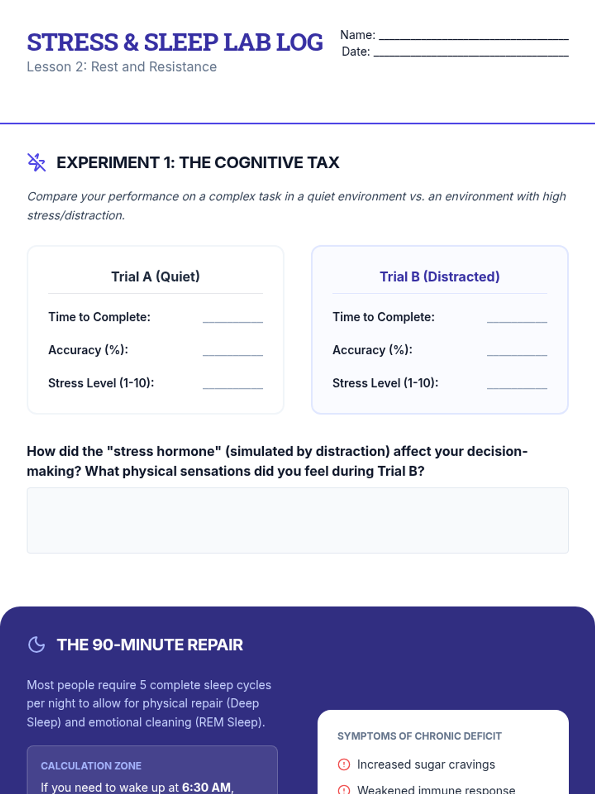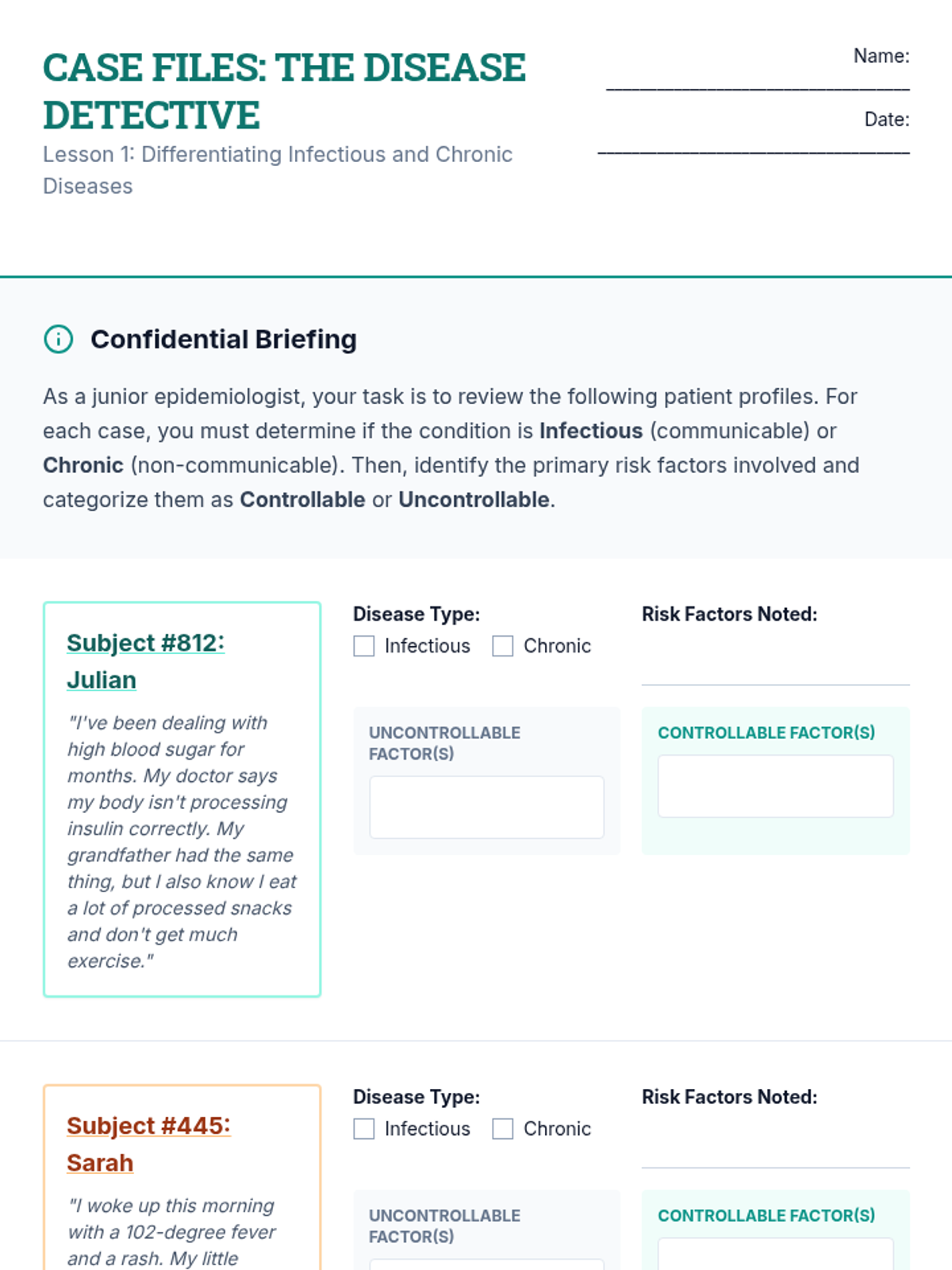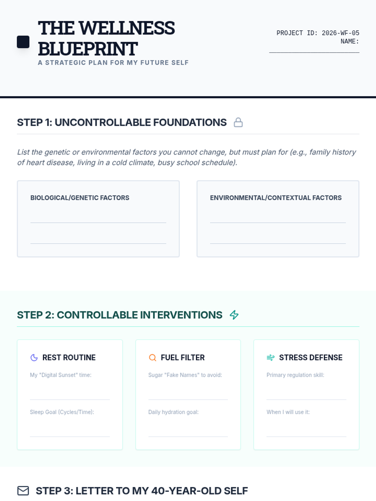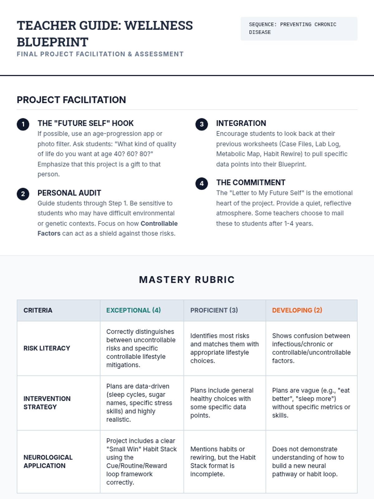 An 8th-grade sequence focused on the prevention of chronic diseases through lifestyle habits. Students explore the differences between infectious and chronic diseases, the impact of sleep and stress, metabolic health, and the neuroscience of habit formation, culminating in a personalized wellness blueprint.