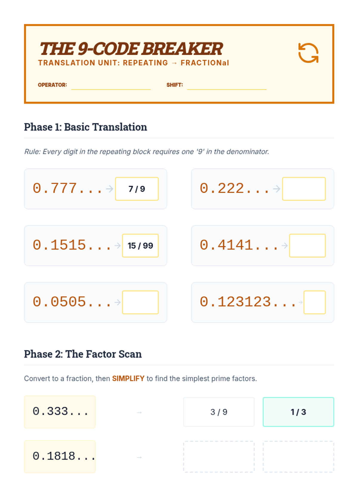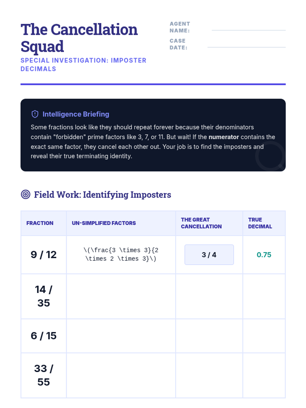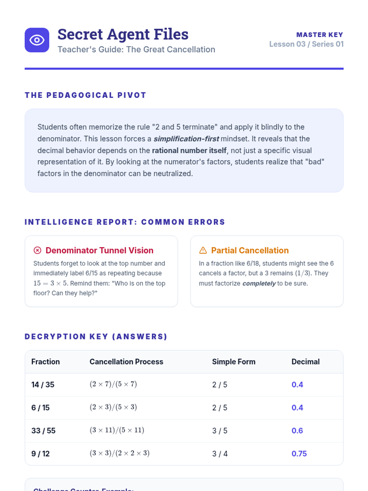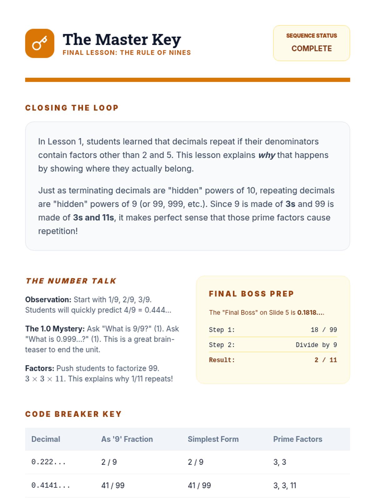 A series of inquiry-based lessons exploring the deep connection between prime factorization and decimal representations. Students move from predicting decimal types to mental conversion strategies and advanced simplification.