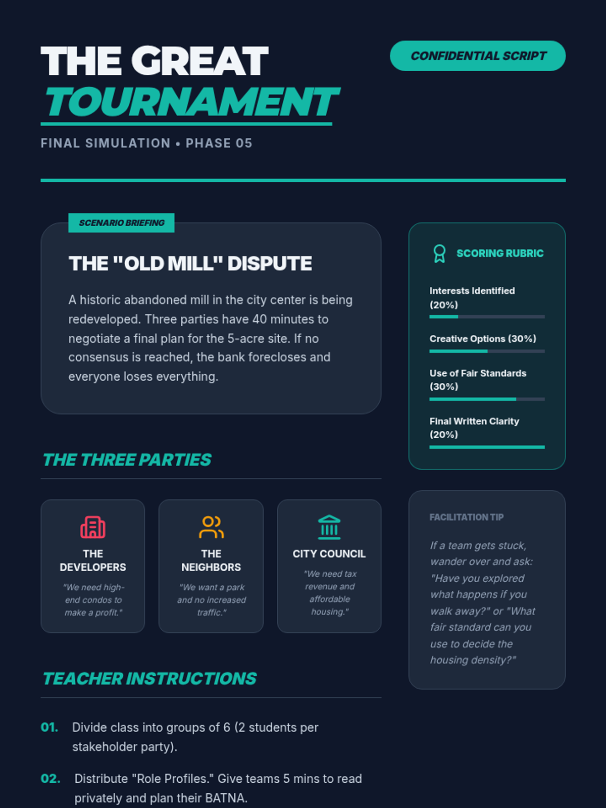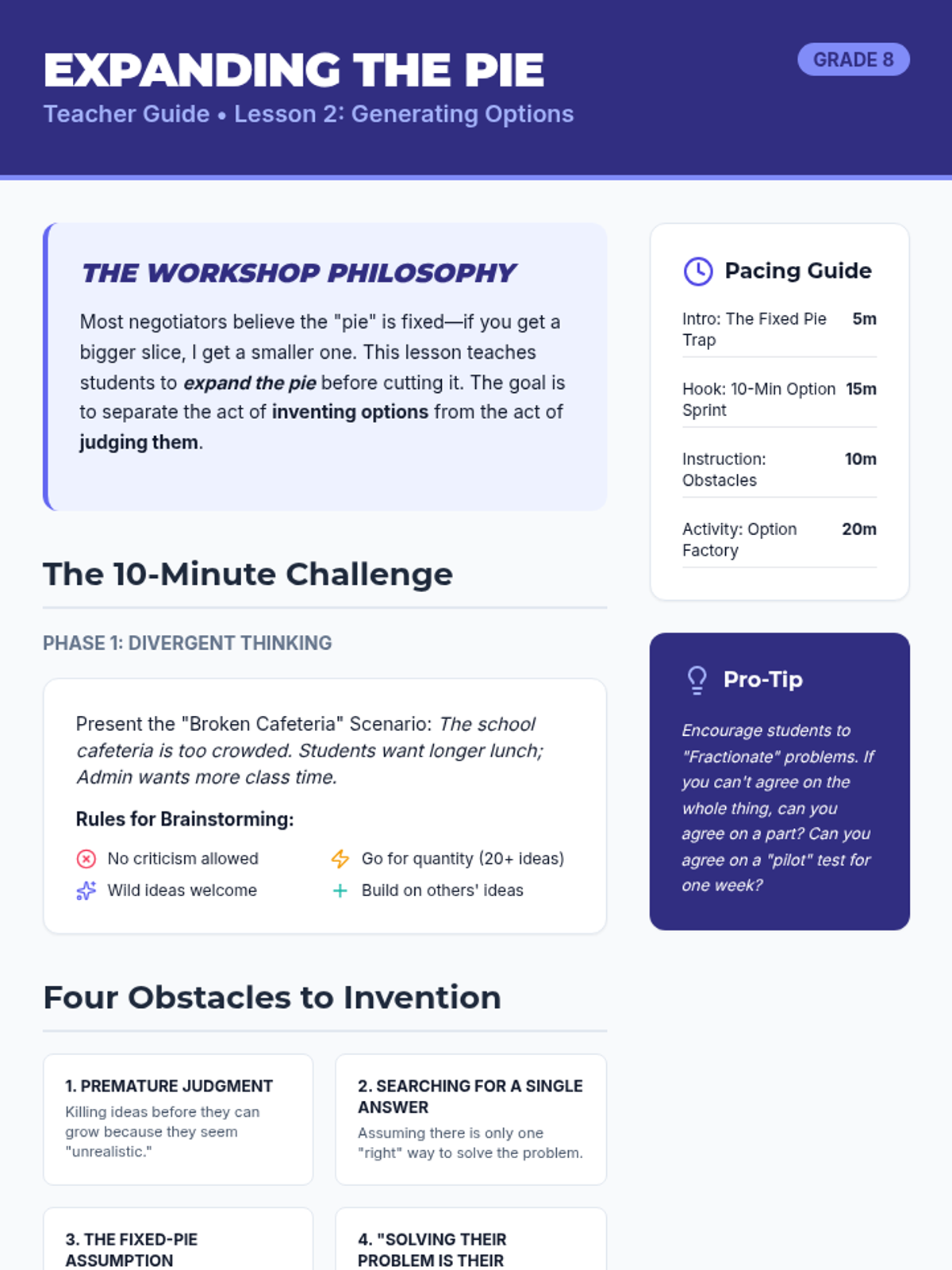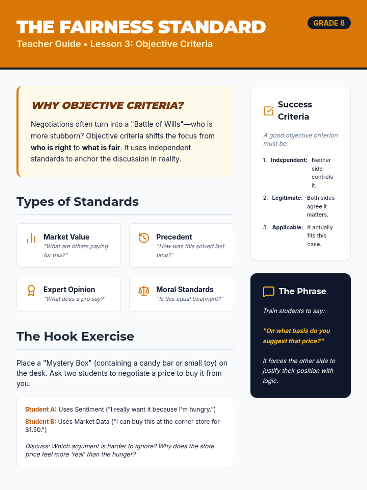 A game-based sequence teaching 8th-grade students the mechanics of principled negotiation. Students learn to move from competitive 'win-lose' mindsets to collaborative 'win-win' solutions by identifying interests, generating options, using objective criteria, and understanding their BATNA.
