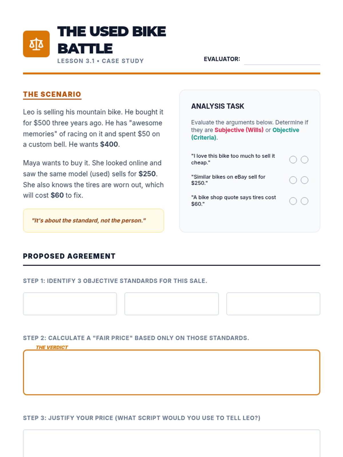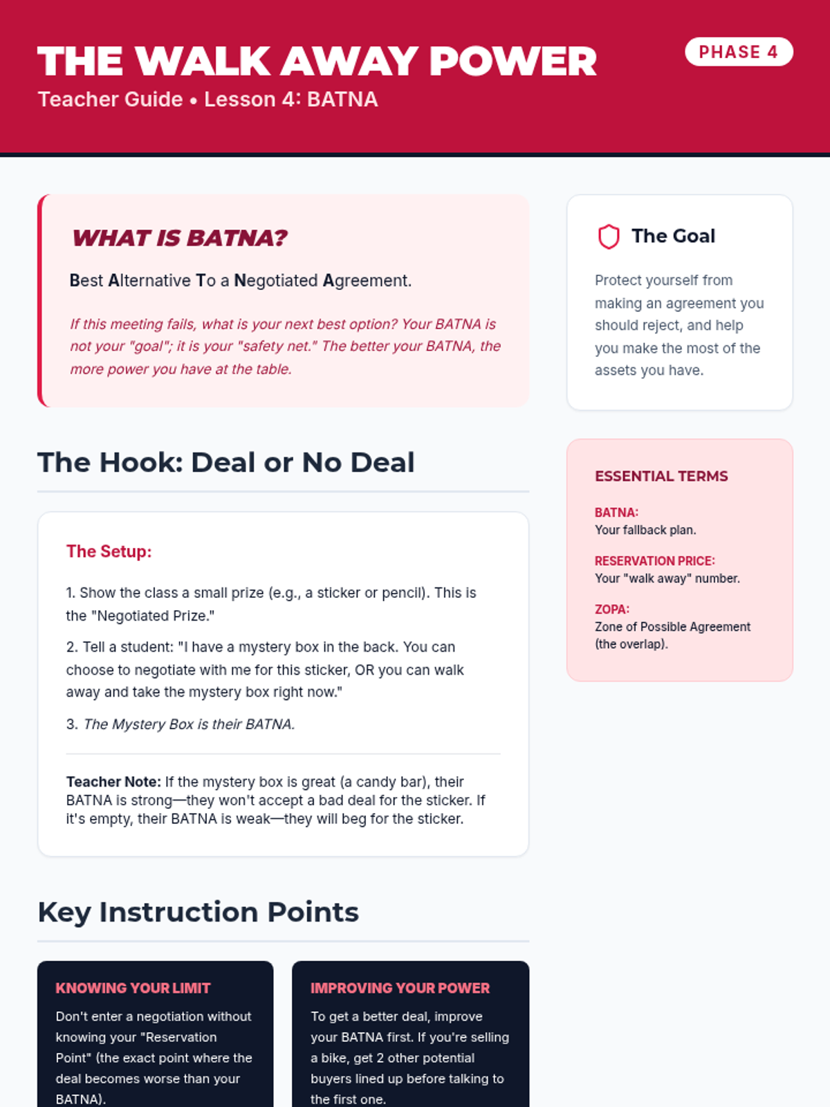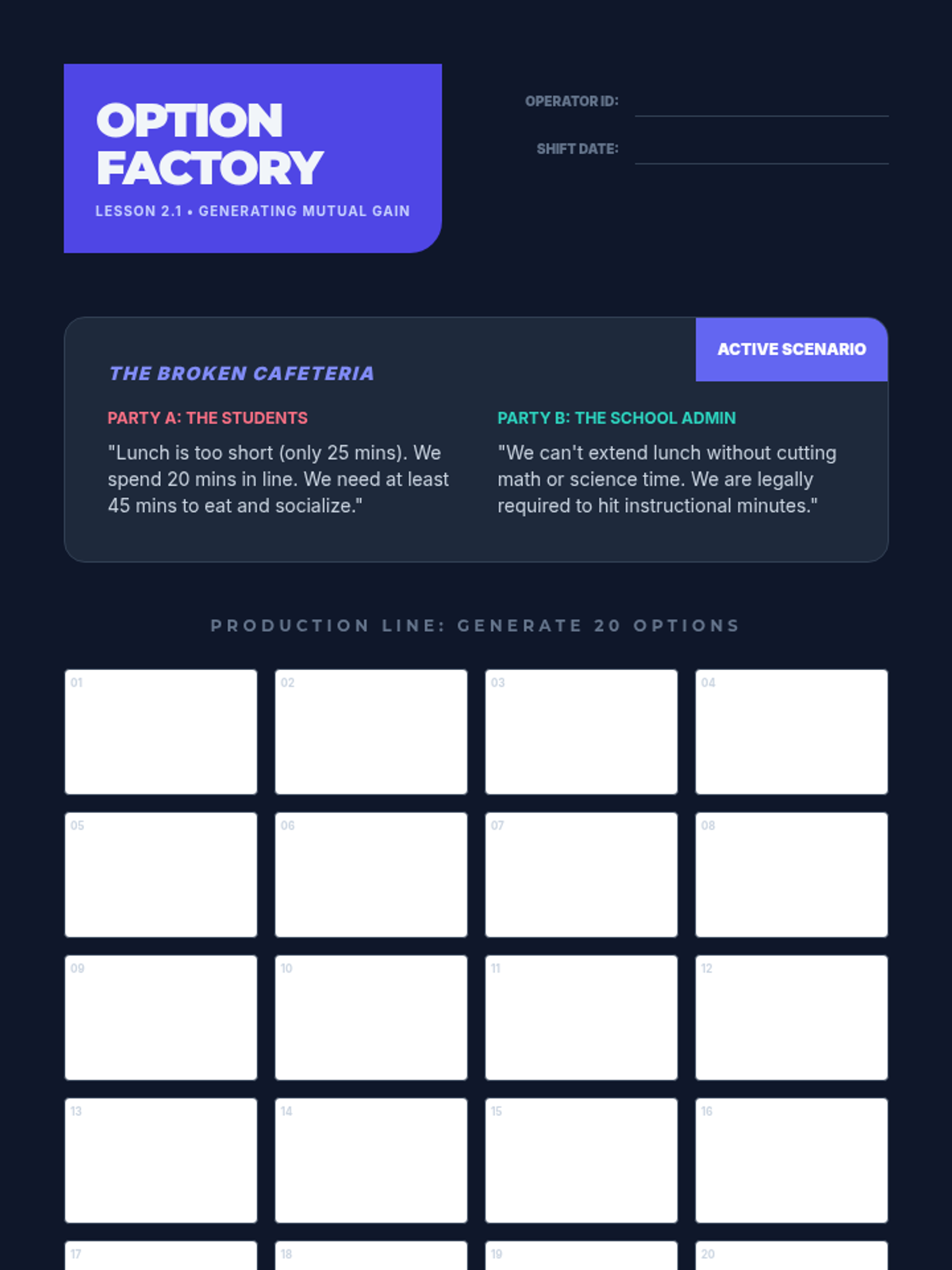 A game-based sequence teaching 8th-grade students the mechanics of principled negotiation. Students learn to move from competitive 'win-lose' mindsets to collaborative 'win-win' solutions by identifying interests, generating options, using objective criteria, and understanding their BATNA.