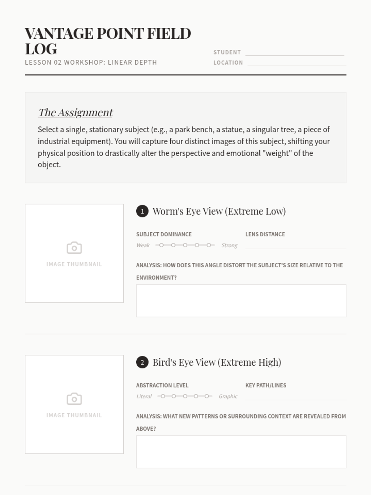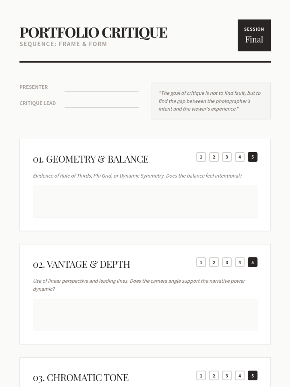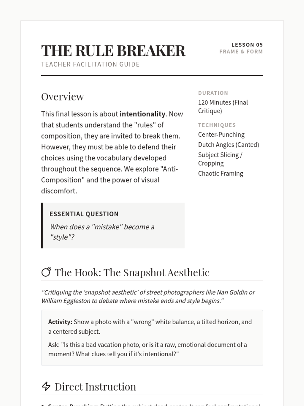 A comprehensive exploration of visual language in photography, moving from classical geometric principles to intentional rule-breaking. Students will master the 'grammar' of the frame through analysis, field practice, and critical critique.