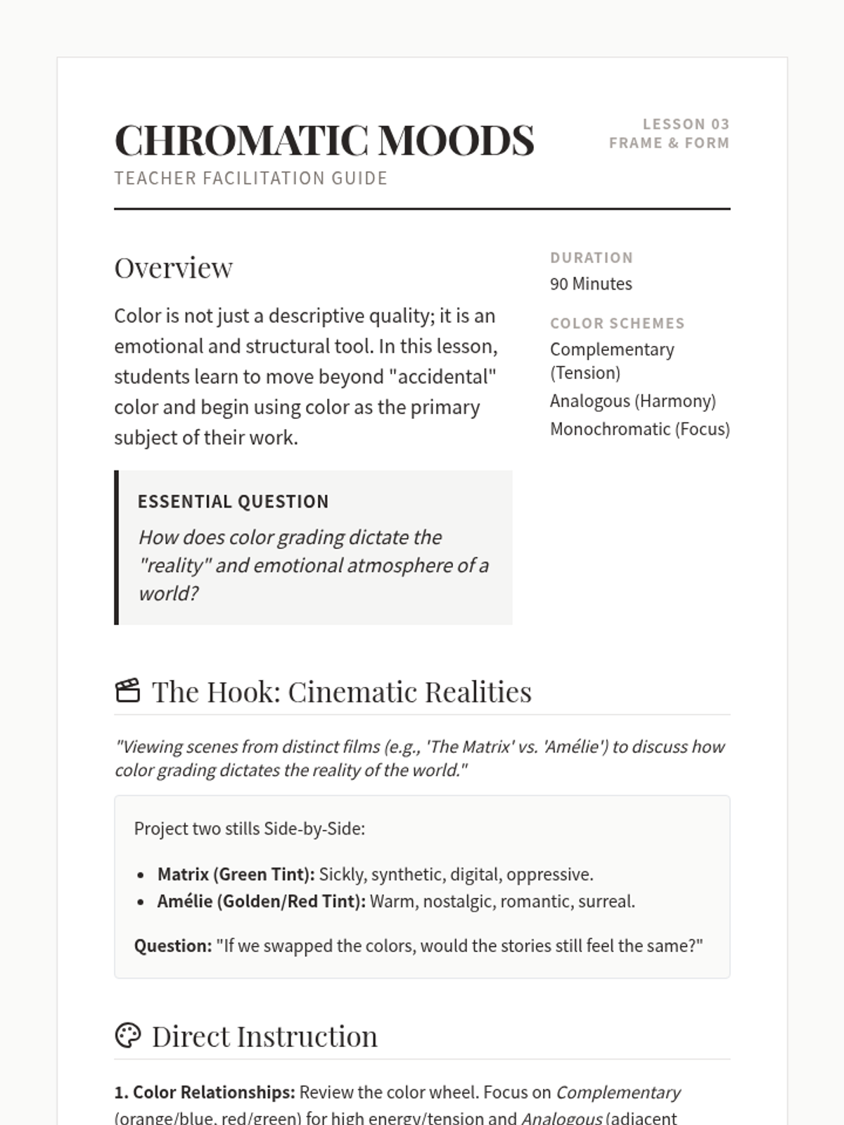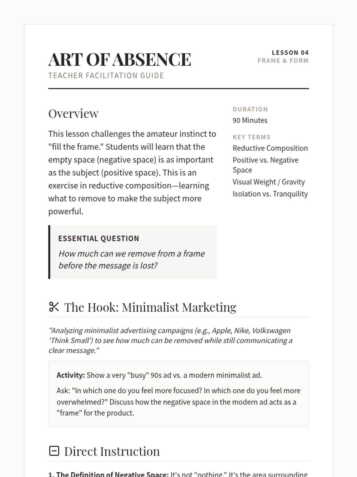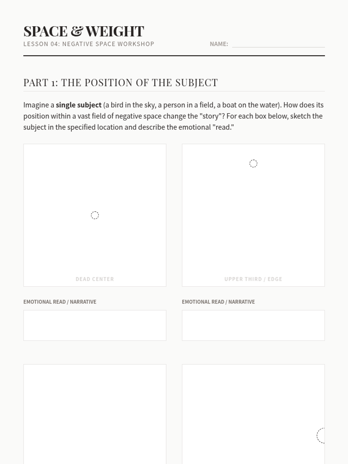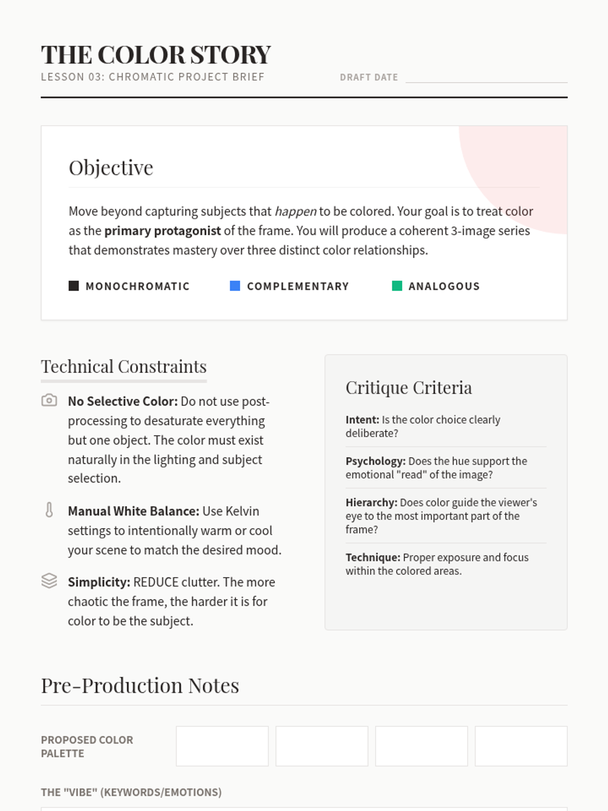 A comprehensive exploration of visual language in photography, moving from classical geometric principles to intentional rule-breaking. Students will master the 'grammar' of the frame through analysis, field practice, and critical critique.