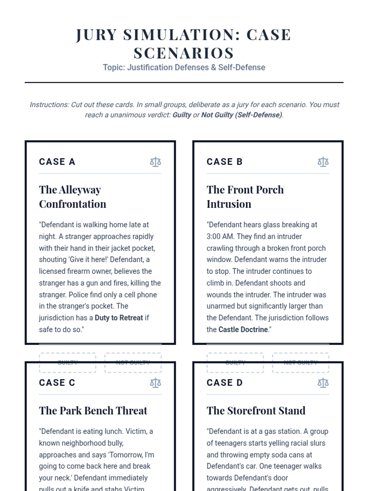 A rigorous undergraduate sequence exploring the fundamental principles of substantive criminal law, including actus reus, mens rea, homicide grading, inchoate offenses, and legal defenses using the IRAC method.