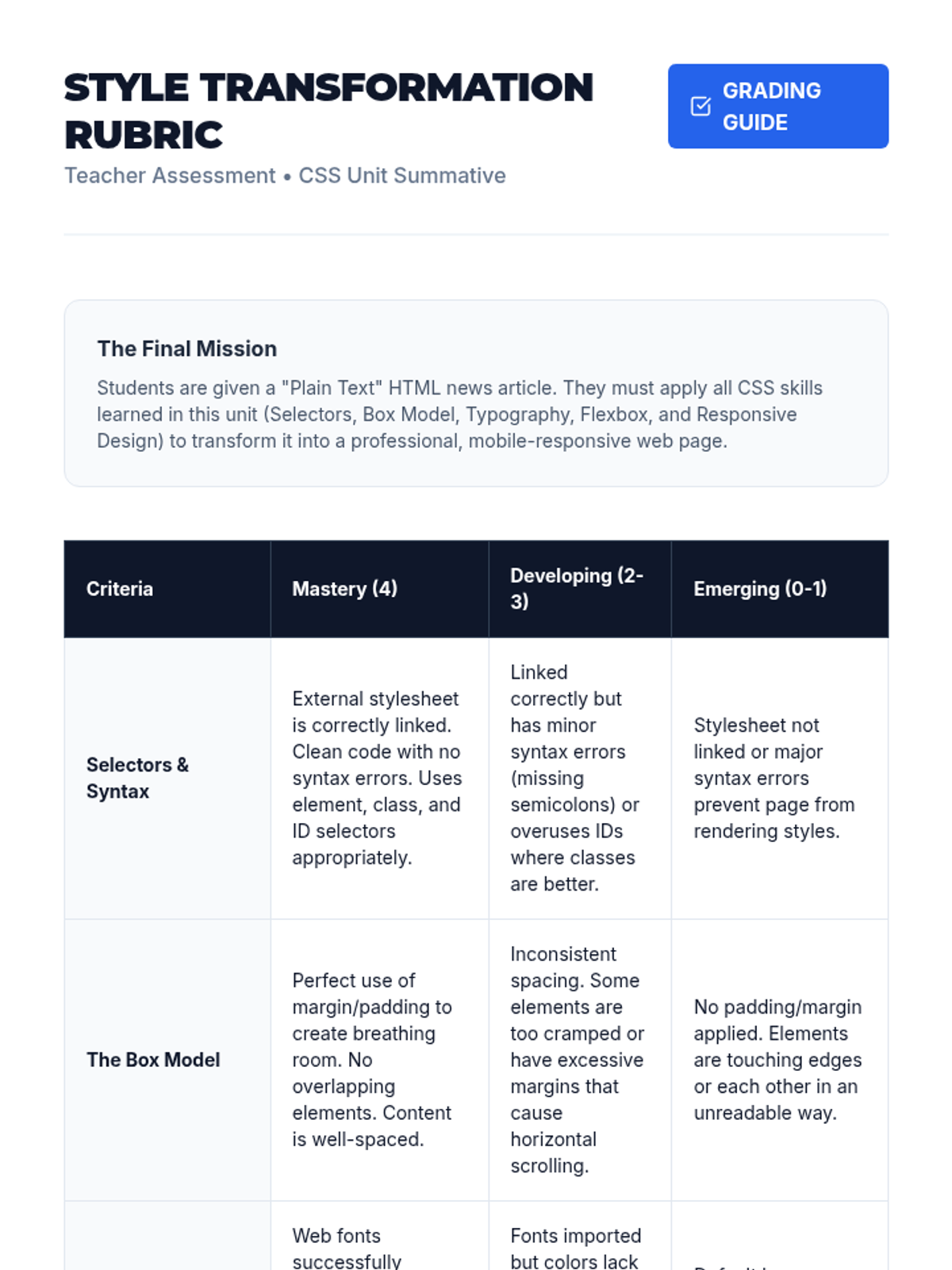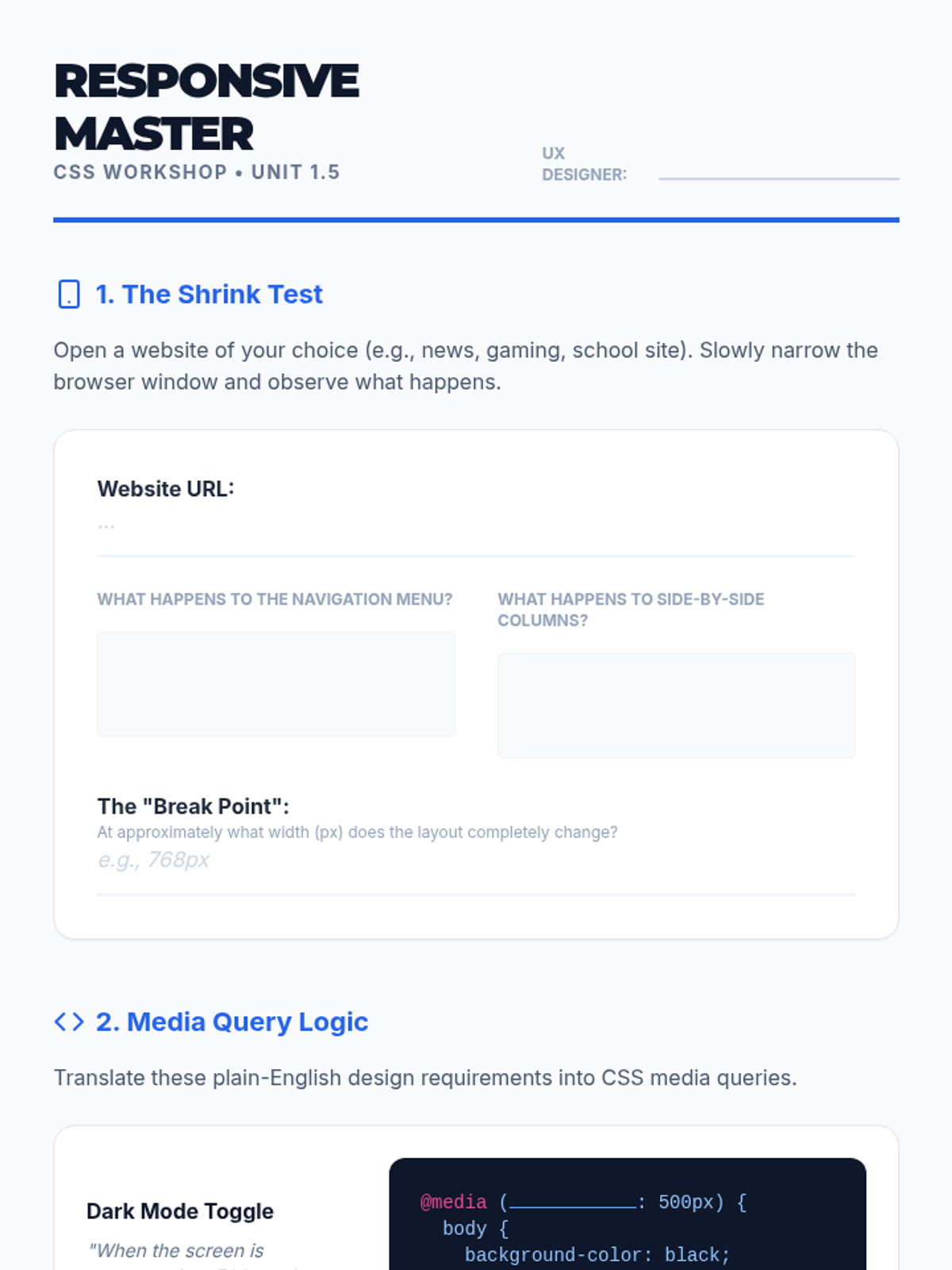 A comprehensive sequence for 11th-grade students focusing on responsive web design, mobile-first philosophy, and modern CSS layout techniques including Flexbox and CSS Grid. Students will transition from understanding the 'viewport' to building a fully responsive business landing page.