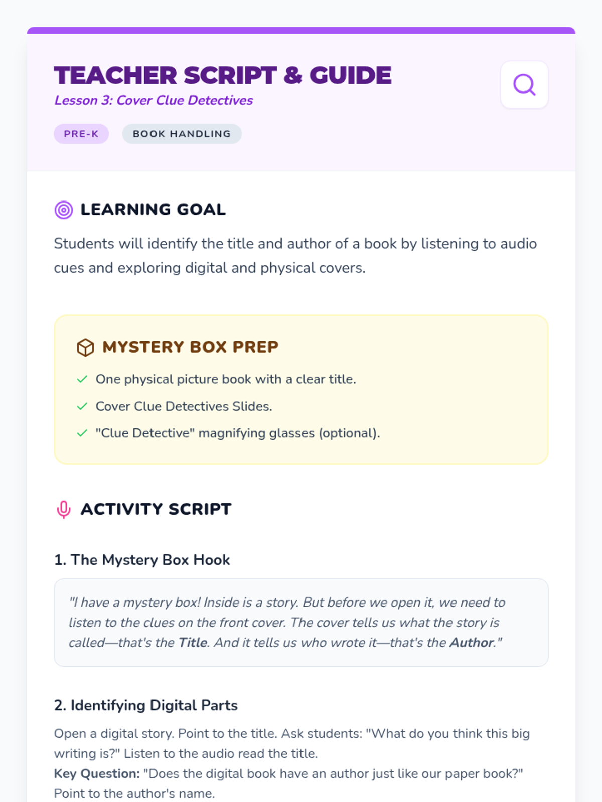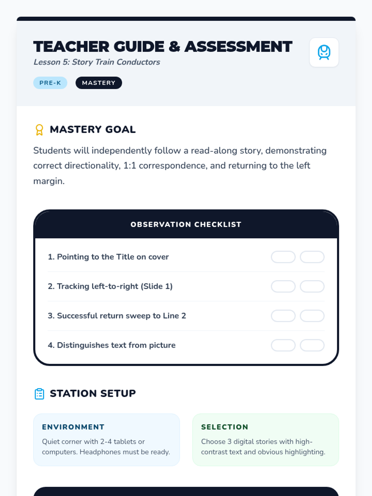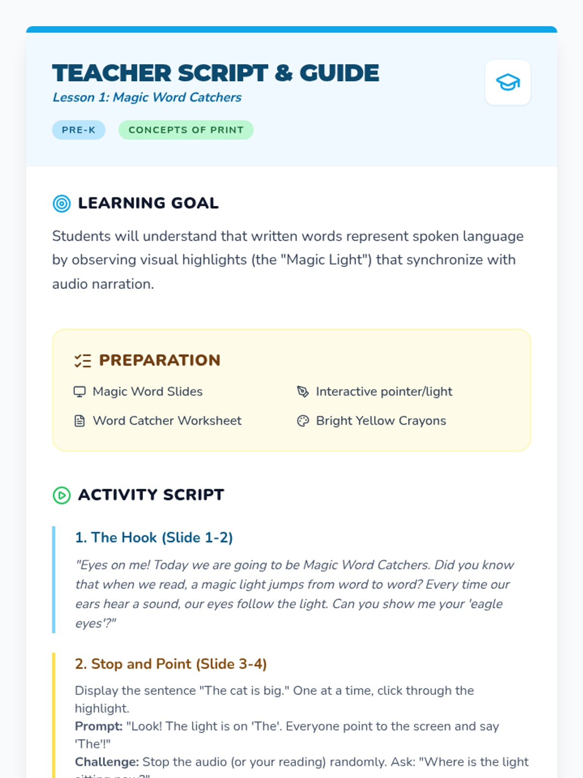 This Pre-K sequence introduces students to concepts of print through audio-visual synchronization, focusing on word tracking, directionality, book parts, and distinguishing text from illustrations.