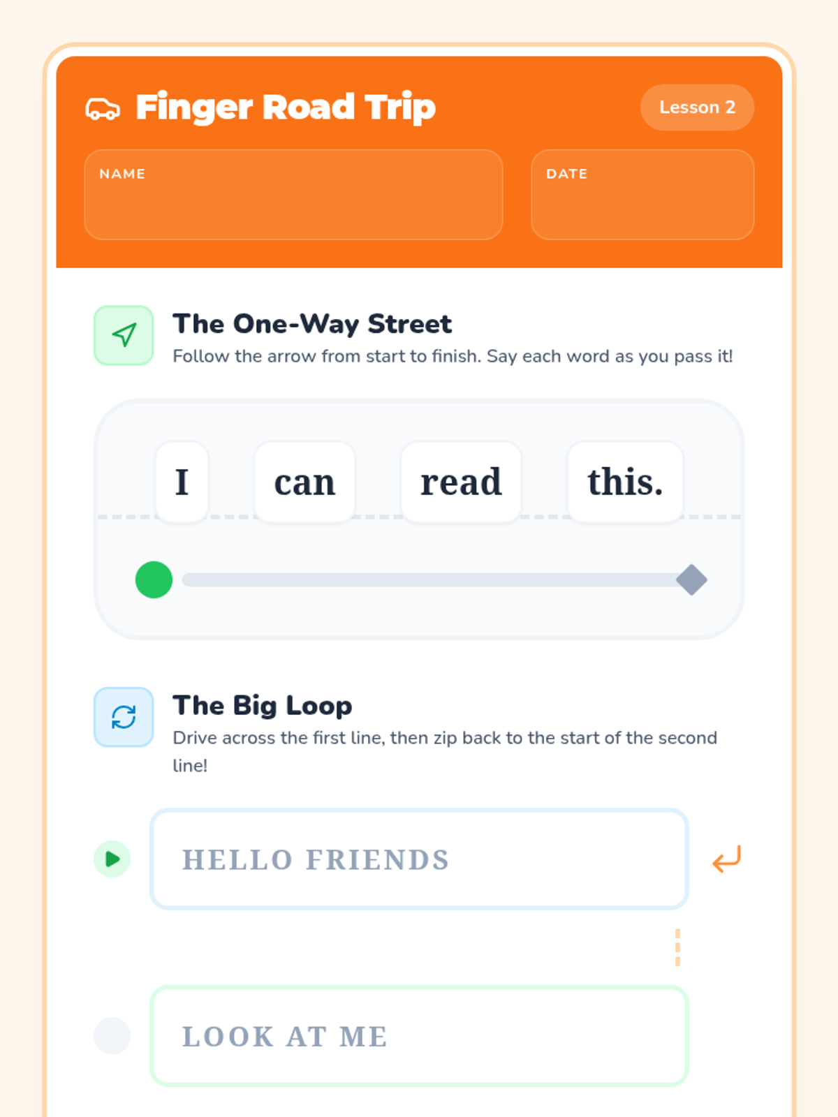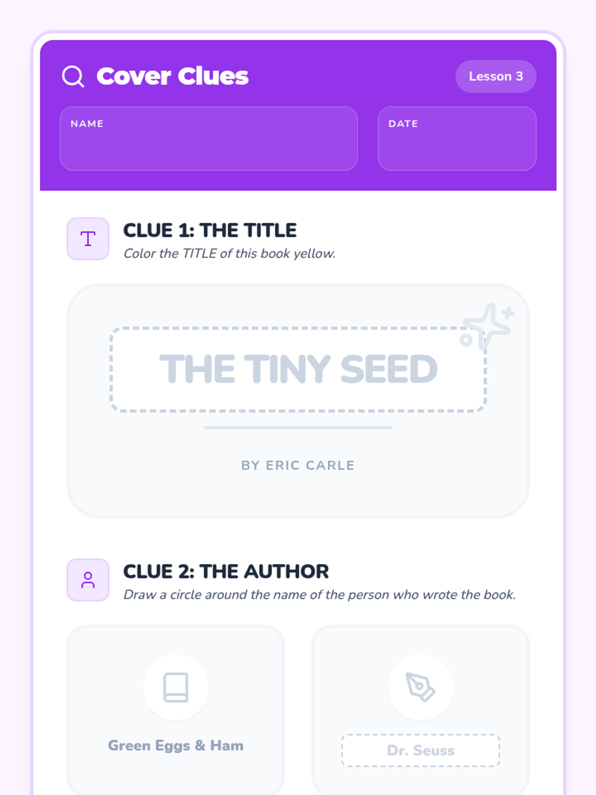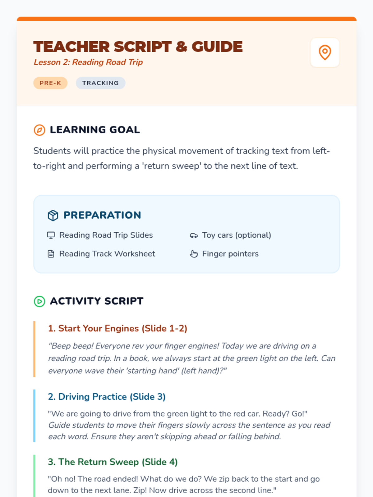 This Pre-K sequence introduces students to concepts of print through audio-visual synchronization, focusing on word tracking, directionality, book parts, and distinguishing text from illustrations.