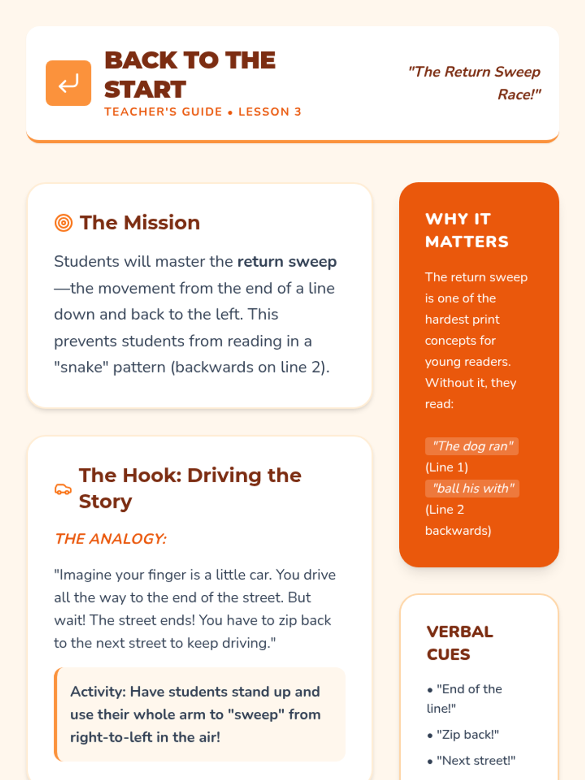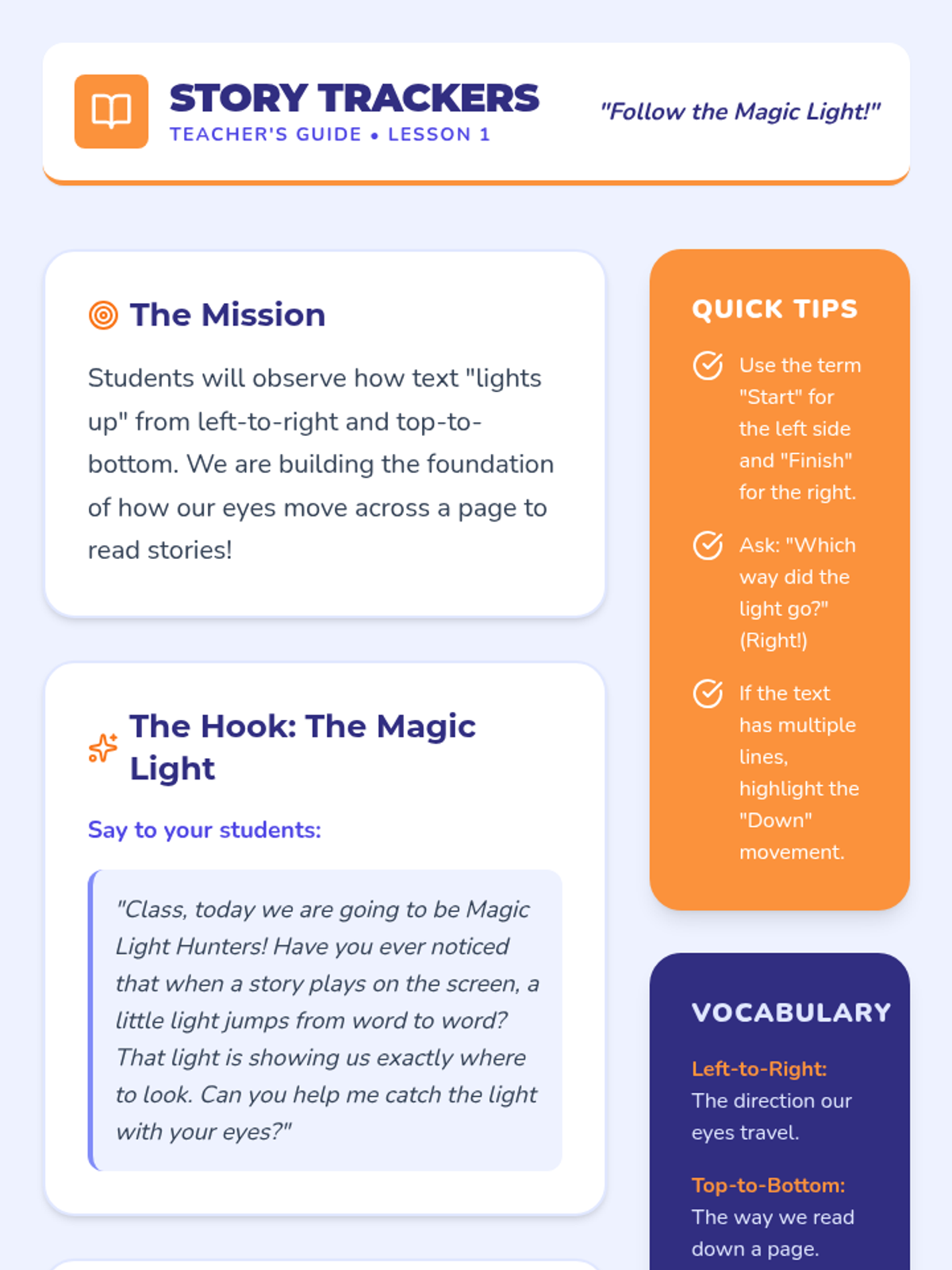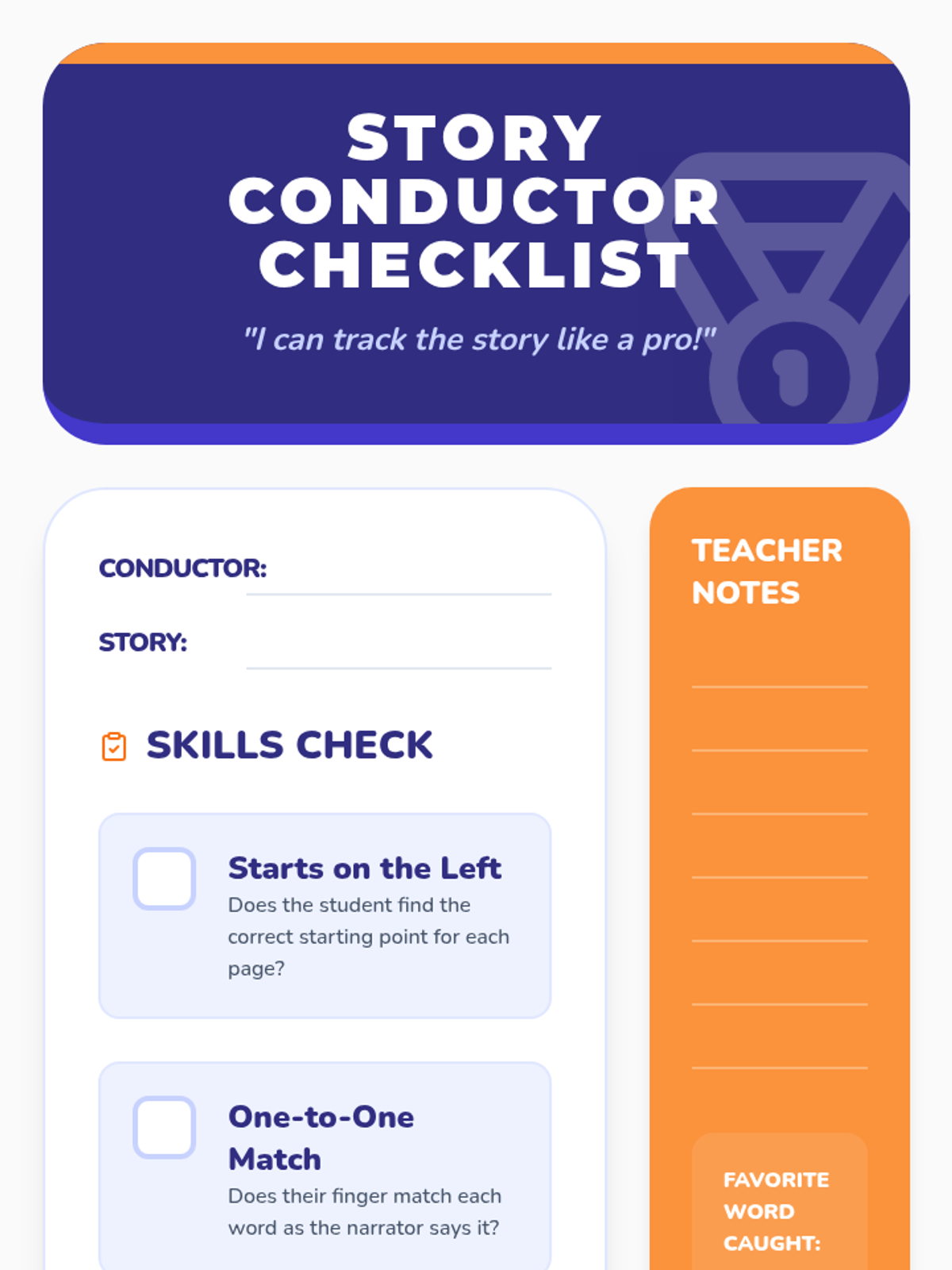 A sequence for Kindergarten students focusing on print concepts like directionality, one-to-one correspondence, return sweep, and punctuation using read-along digital resources. Students move from observation to independent tracking.