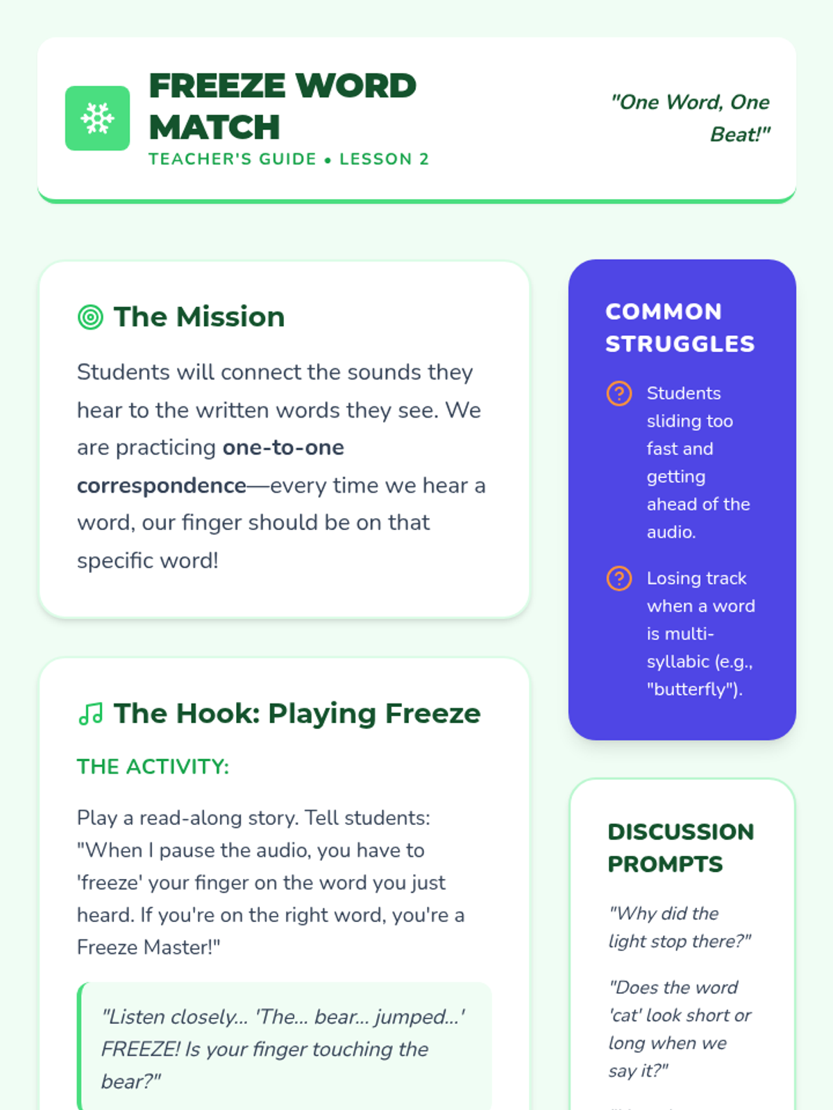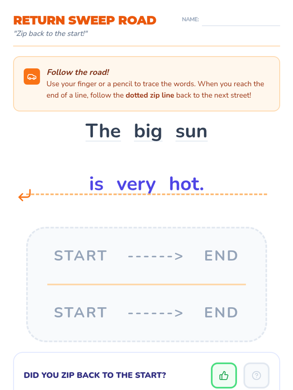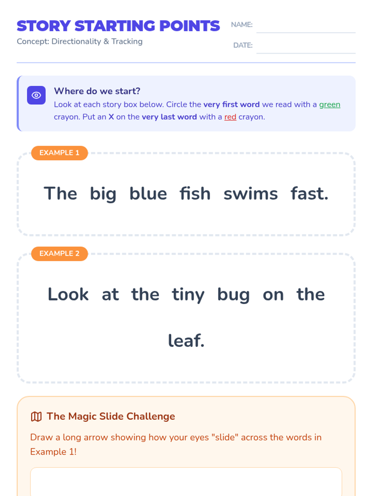 A sequence for Kindergarten students focusing on print concepts like directionality, one-to-one correspondence, return sweep, and punctuation using read-along digital resources. Students move from observation to independent tracking.