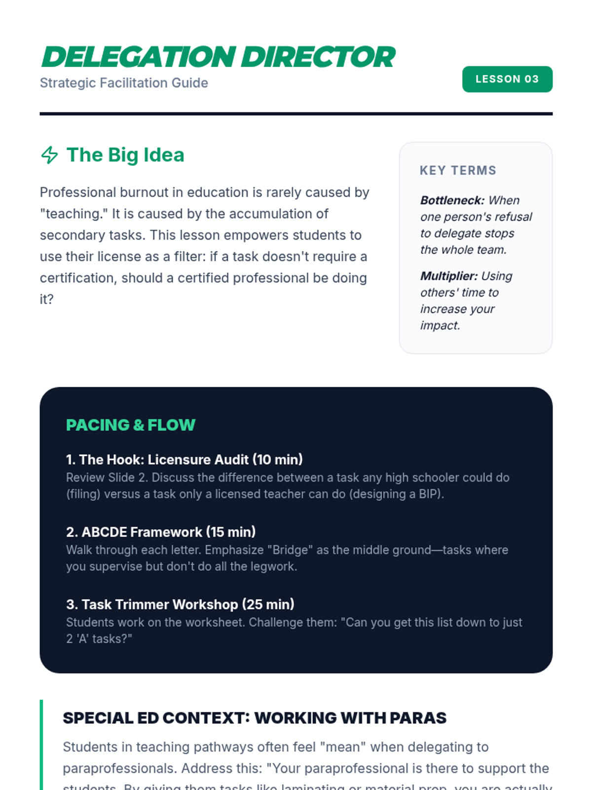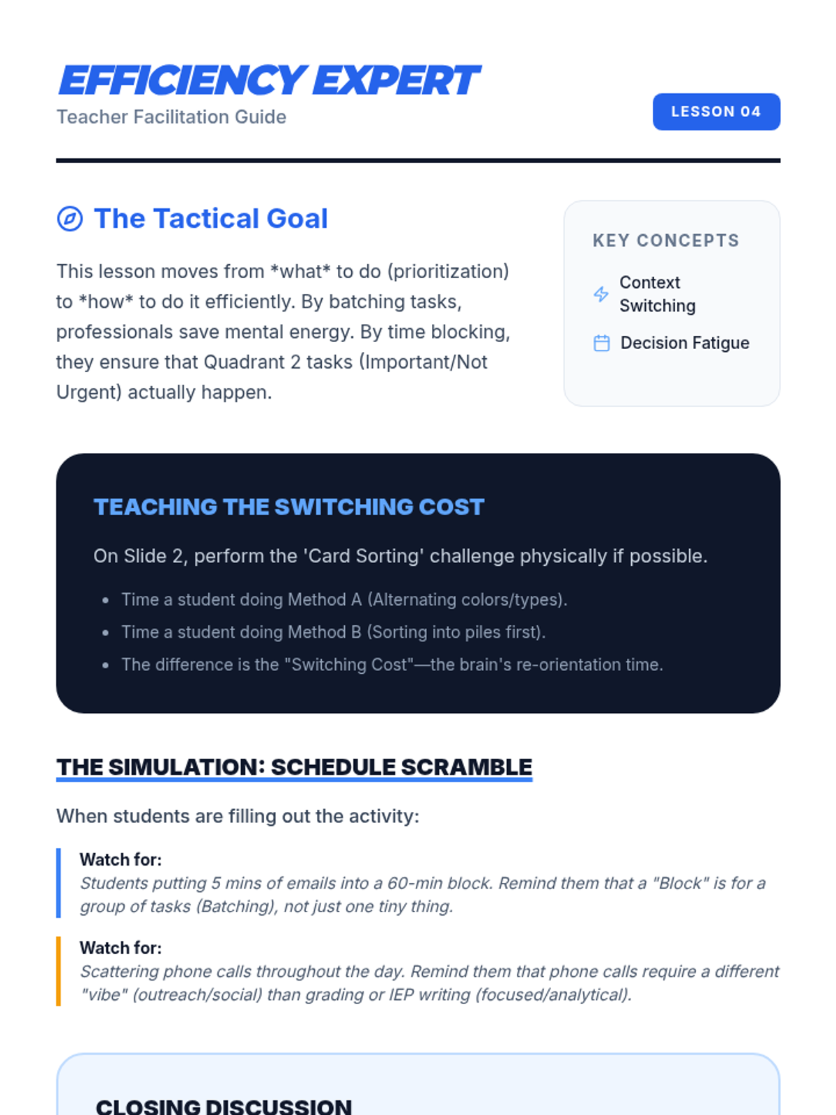 A professional executive functioning sequence for 11th-grade students (specifically those in teaching or professional pathways) focused on high-stakes prioritization. Students master the Eisenhower Matrix, ABCDE method, and time-blocking to navigate the complex demands of educational environments.