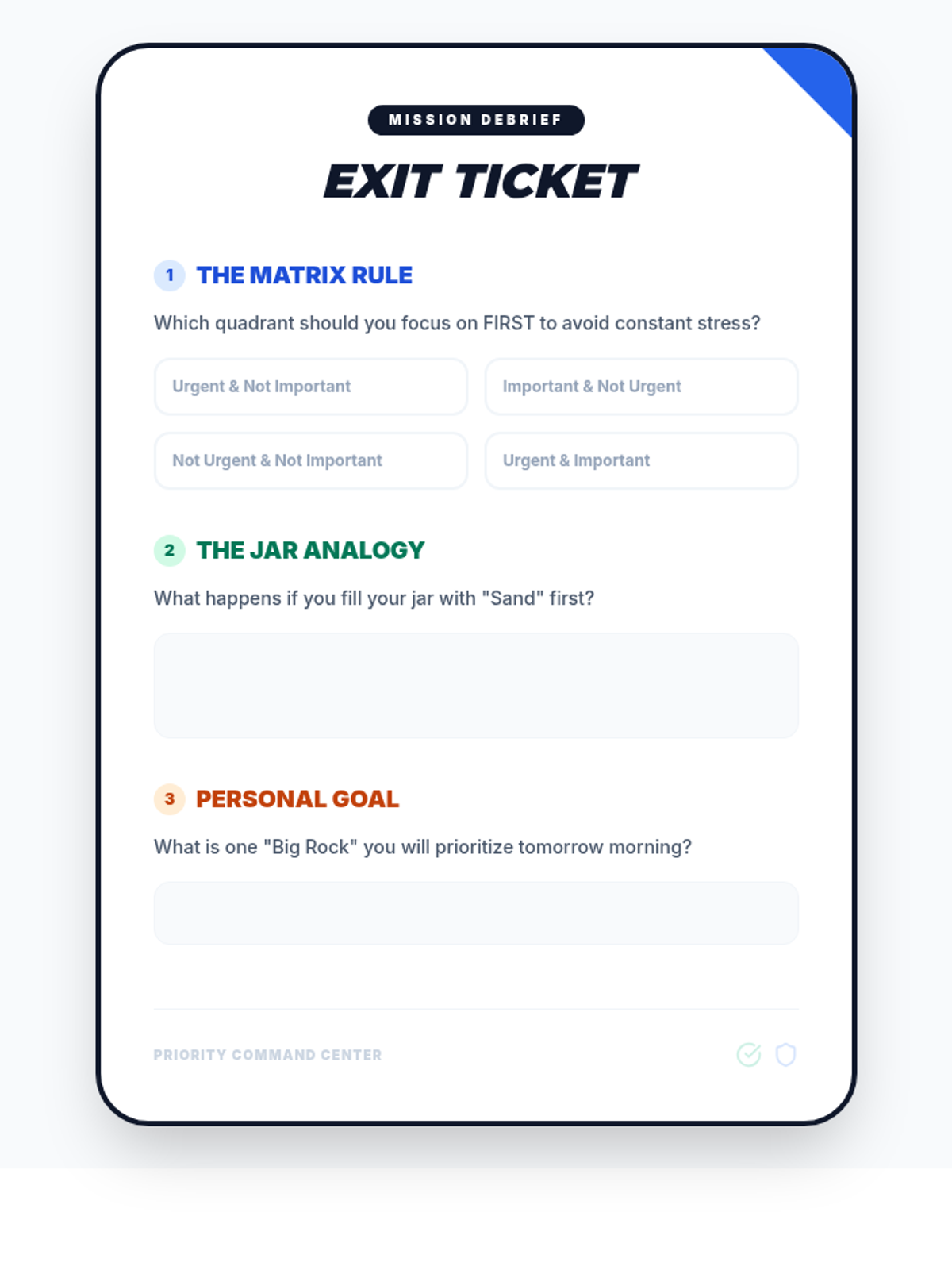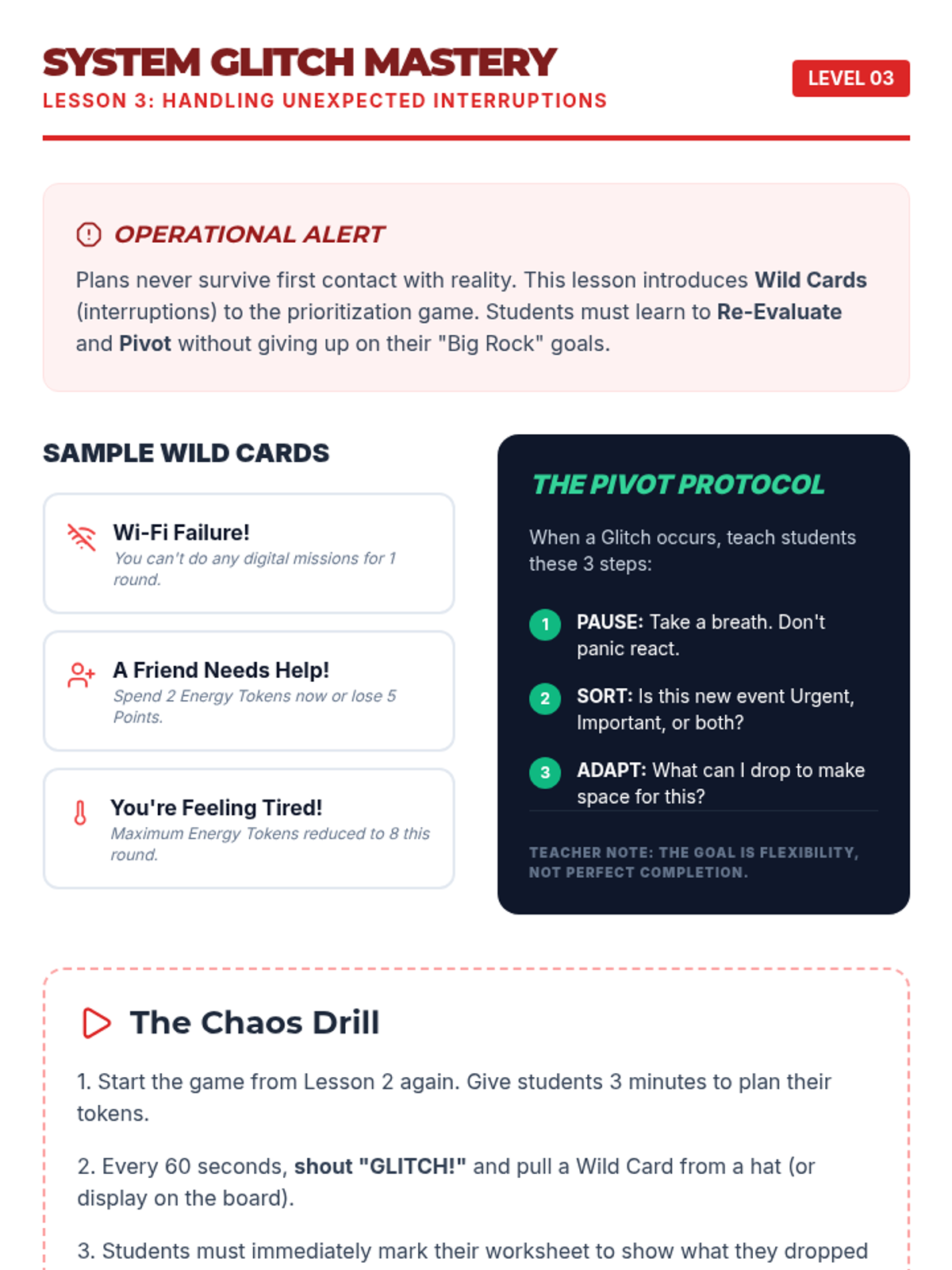 This sequence teaches 6th-grade students how to balance multiple commitments using urgency and importance frameworks. Through game-based simulations and the 'Jar of Rocks' analogy, students develop executive function skills for effective prioritization.