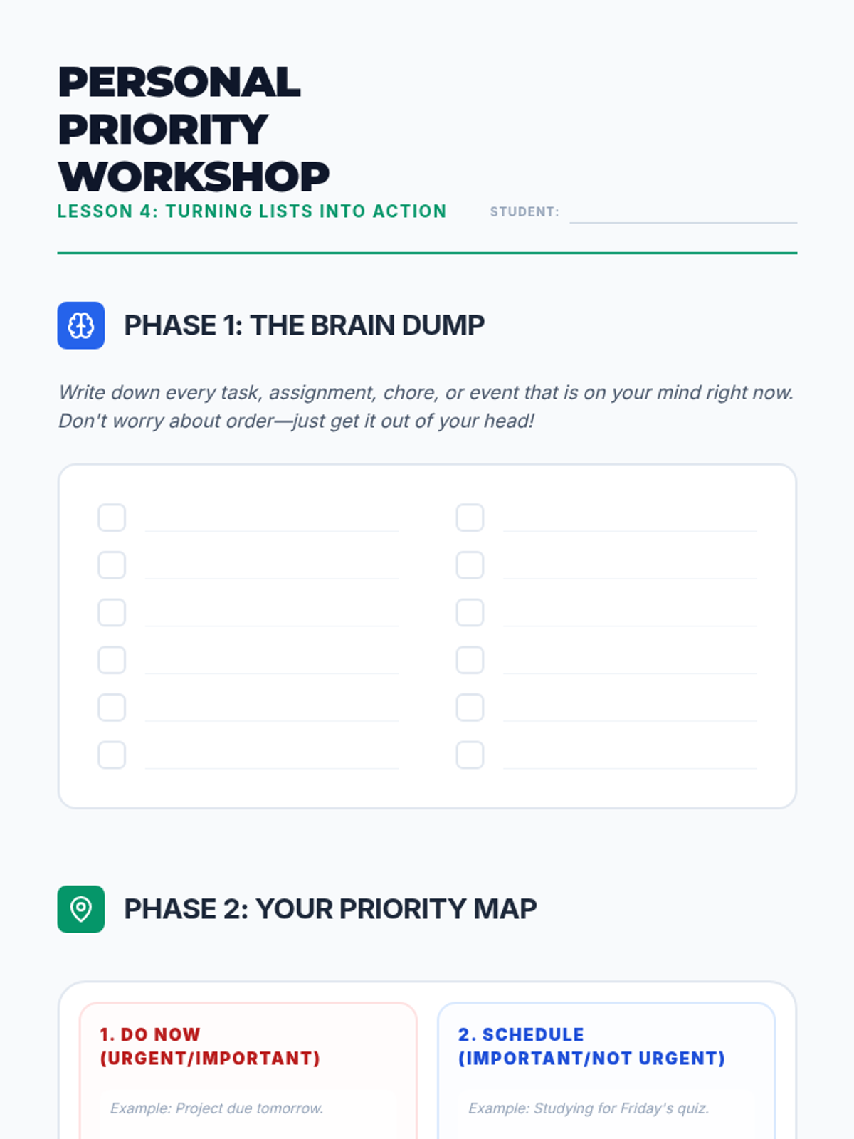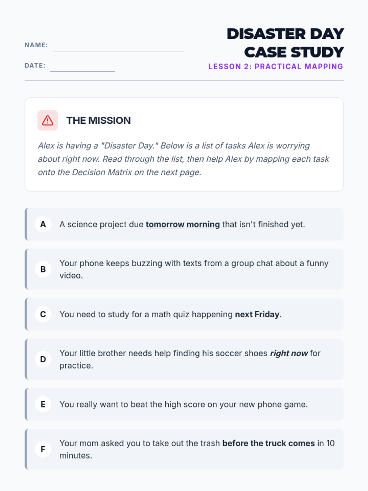 A 5-lesson unit teaching 6th-grade students how to distinguish between urgency and importance using a Decision Matrix (Eisenhower Matrix) to manage their schoolwork and personal life.
