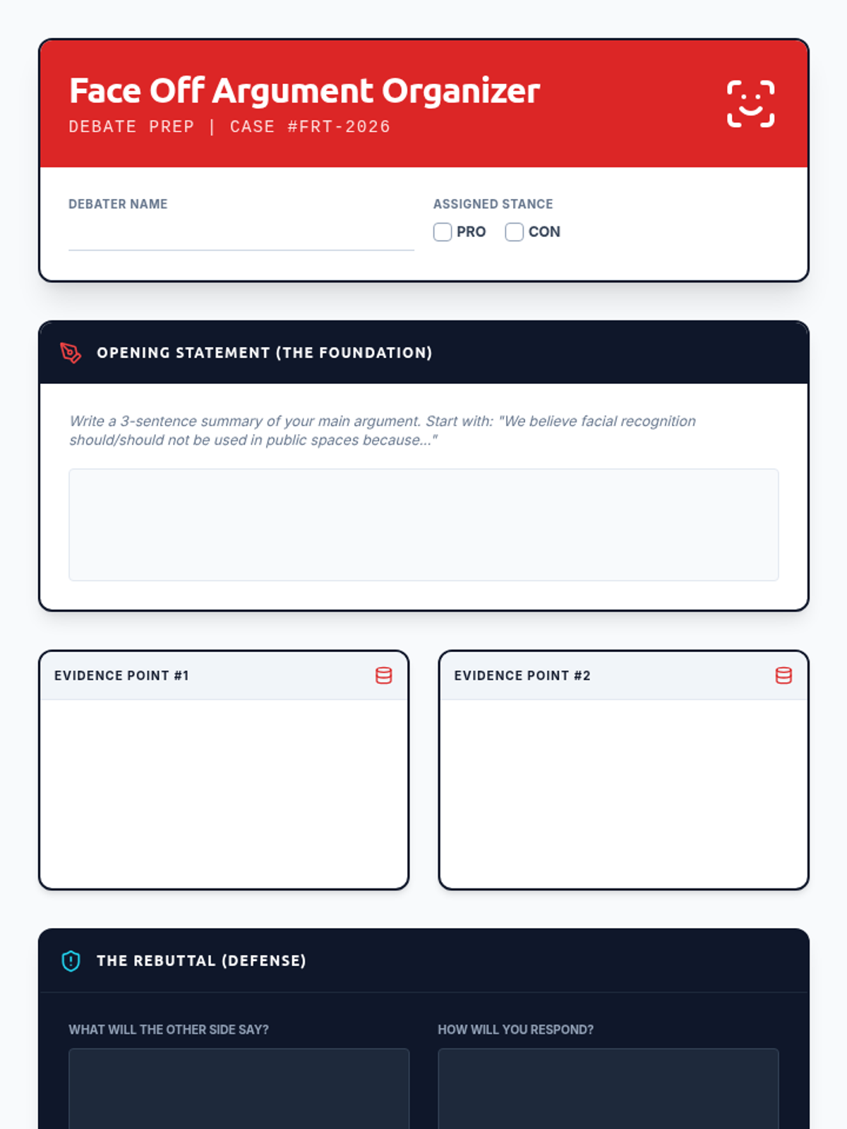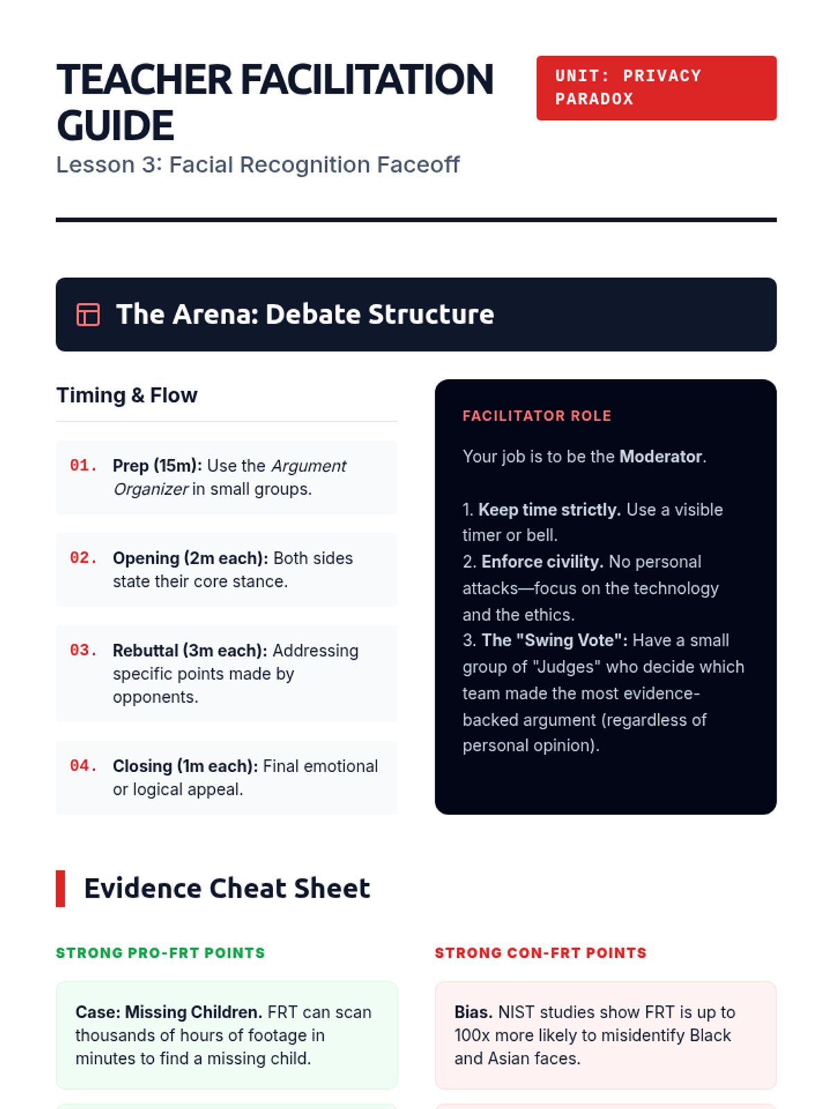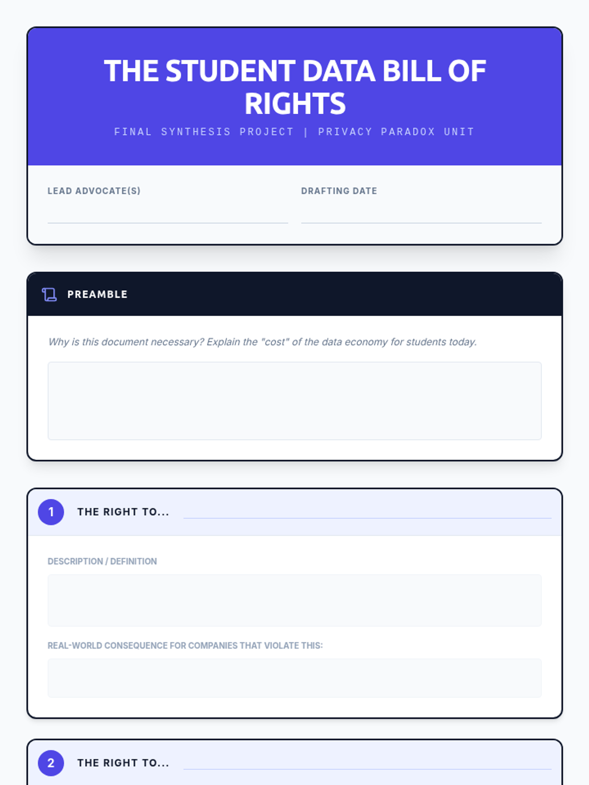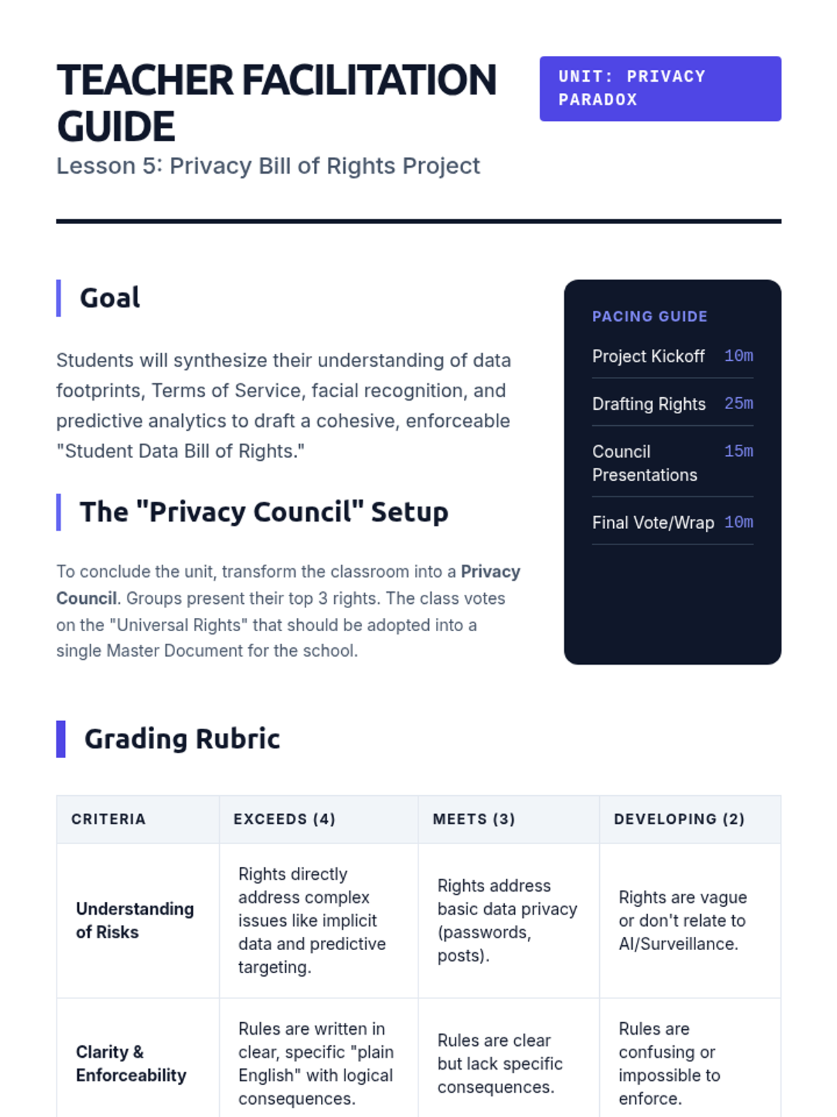 This sequence explores the intersection of AI, surveillance, and personal privacy. Students move from auditing their own digital footprints to debating the ethics of facial recognition and predictive analytics, culminating in the creation of a 'Student Data Bill of Rights'.