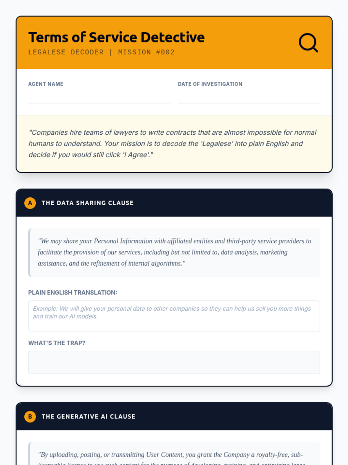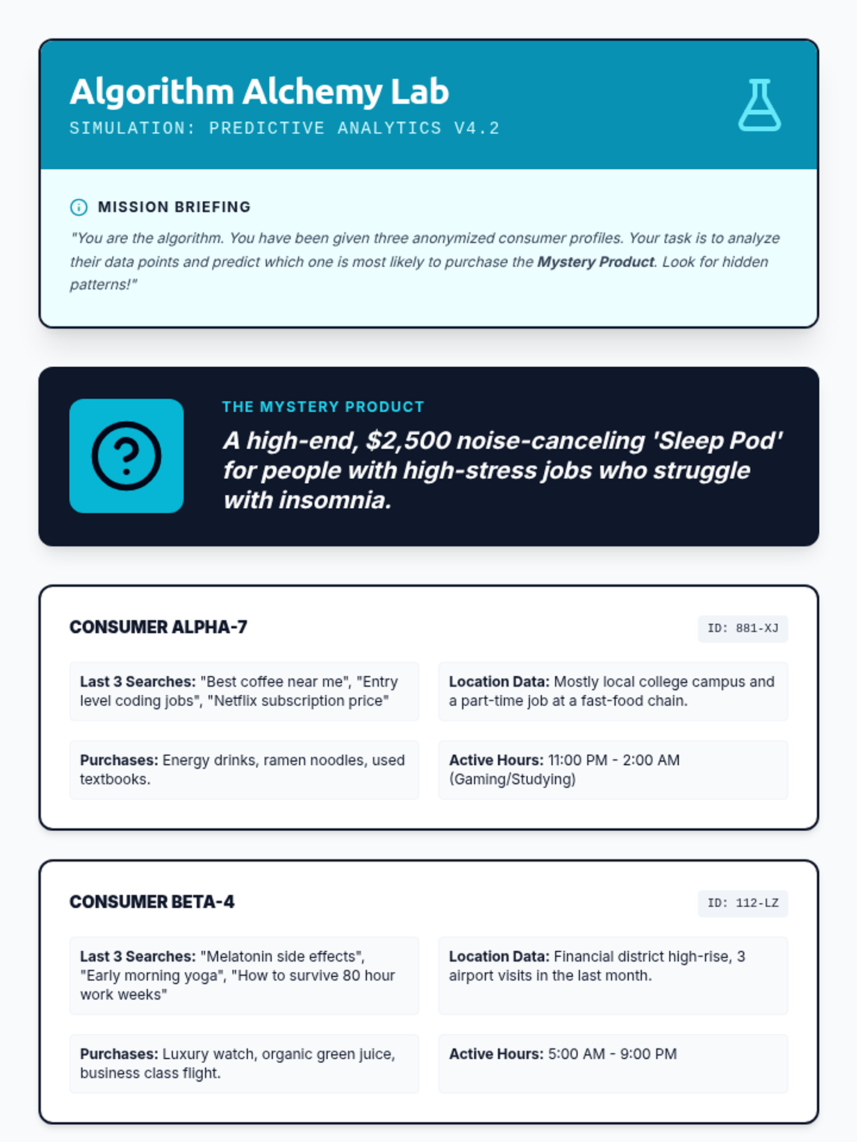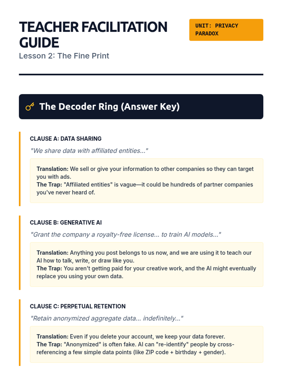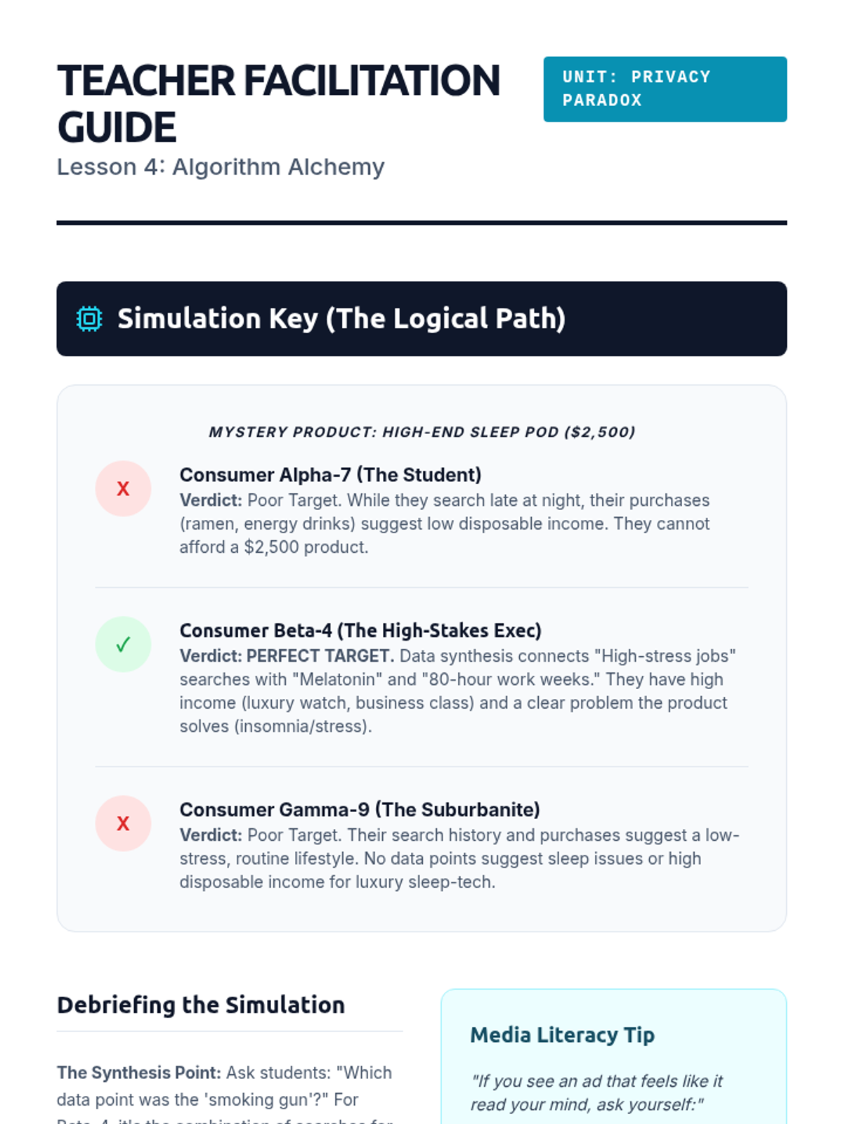 This sequence explores the intersection of AI, surveillance, and personal privacy. Students move from auditing their own digital footprints to debating the ethics of facial recognition and predictive analytics, culminating in the creation of a 'Student Data Bill of Rights'.
